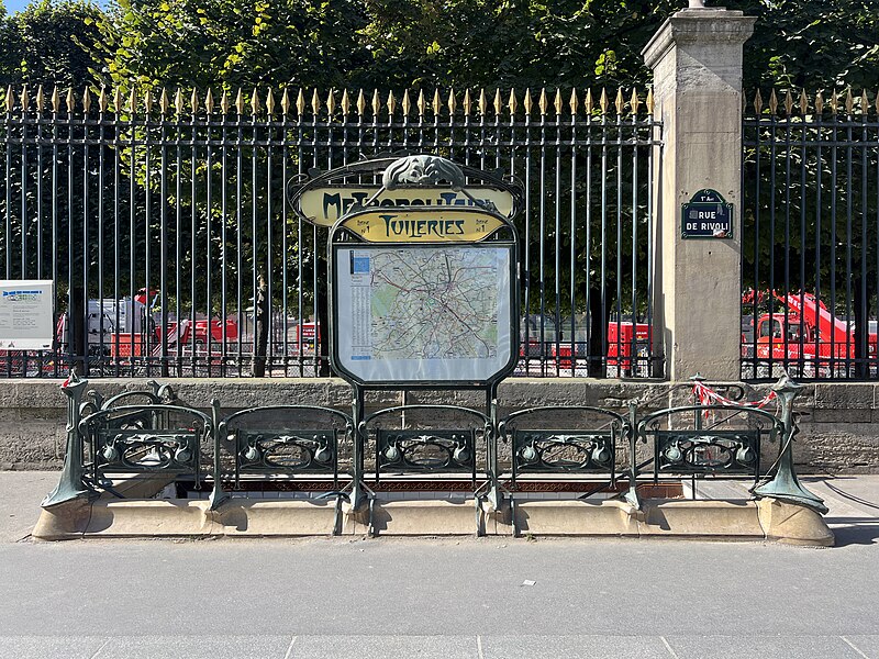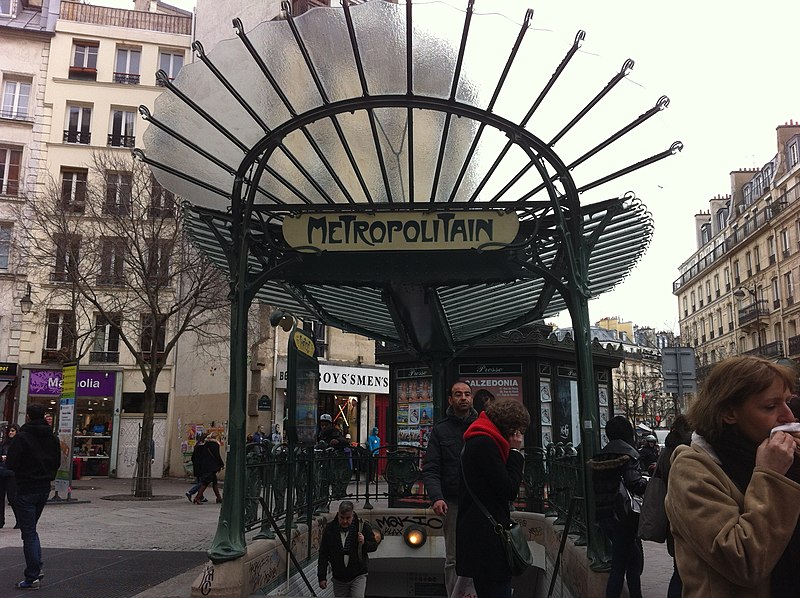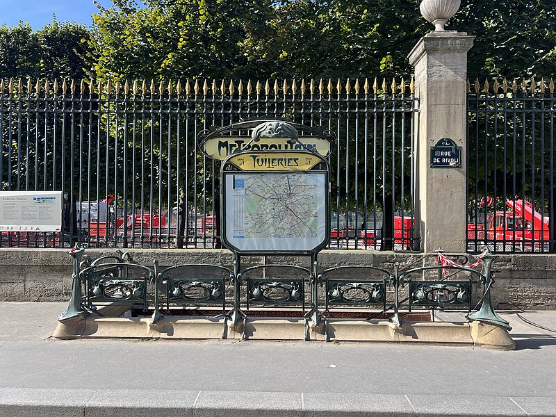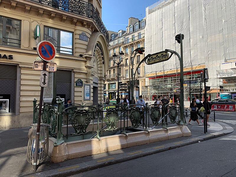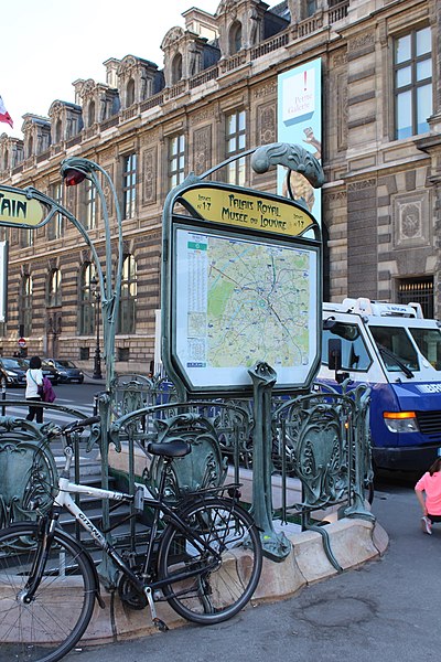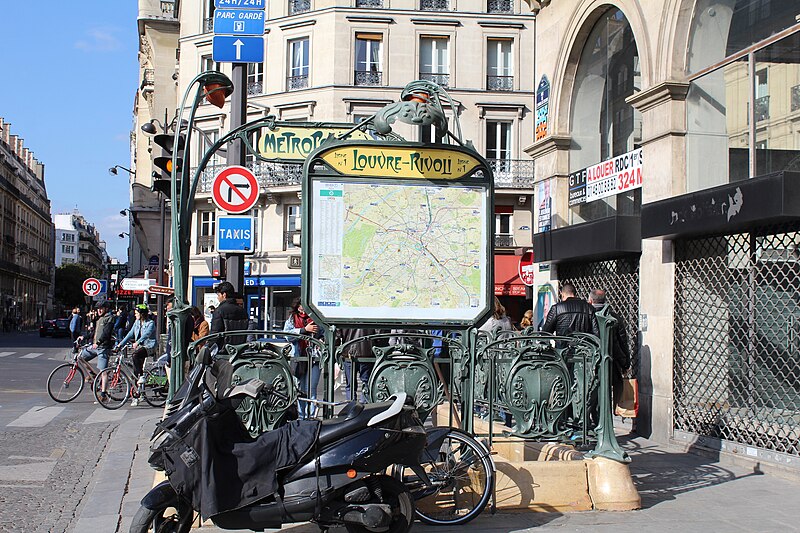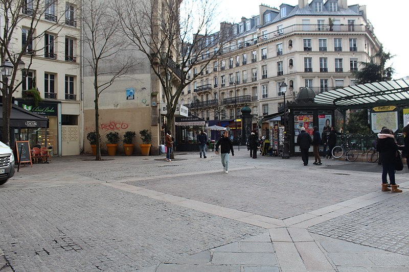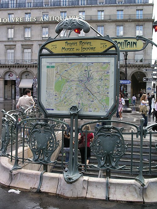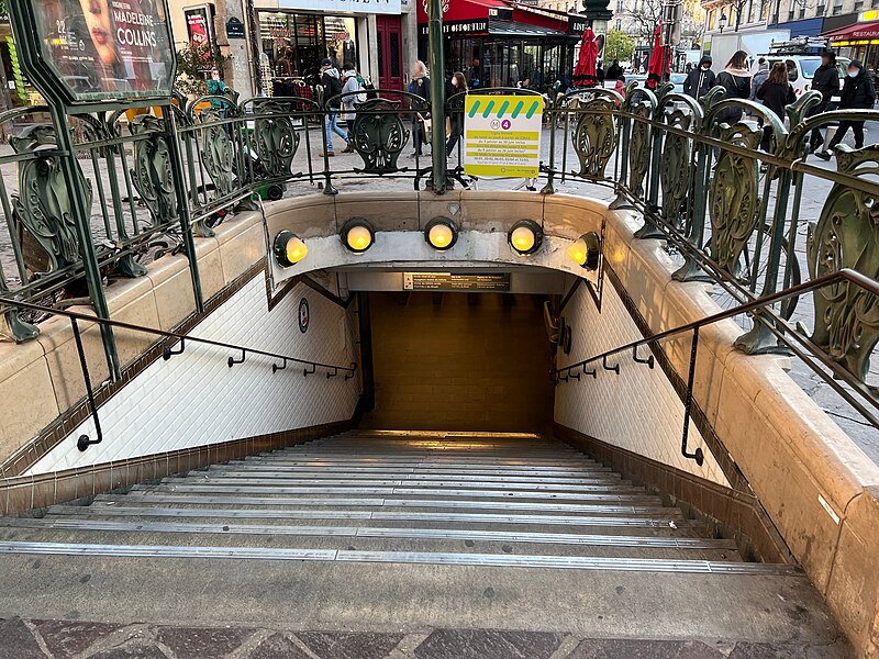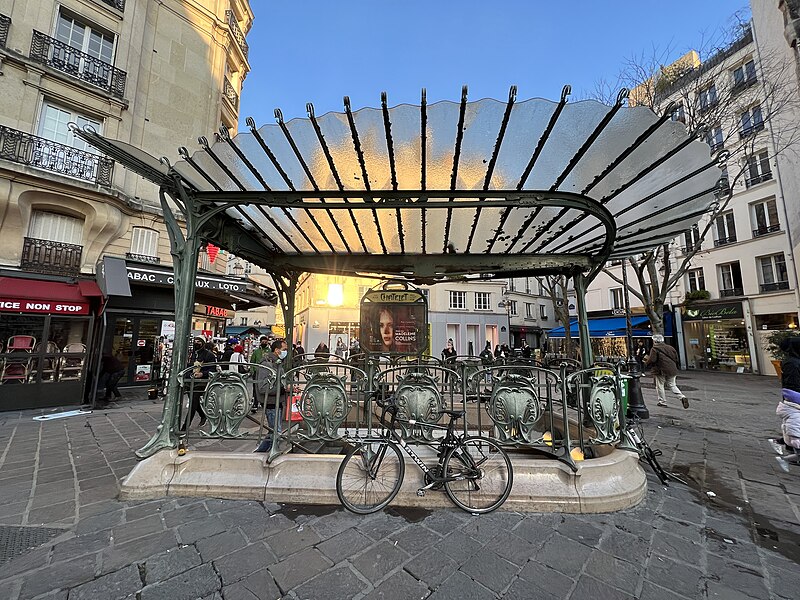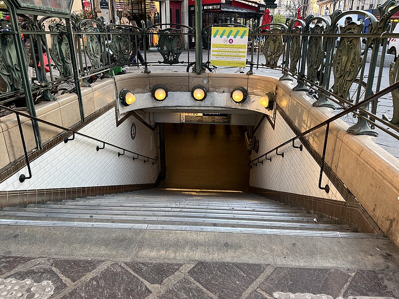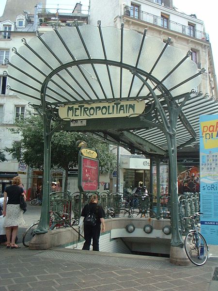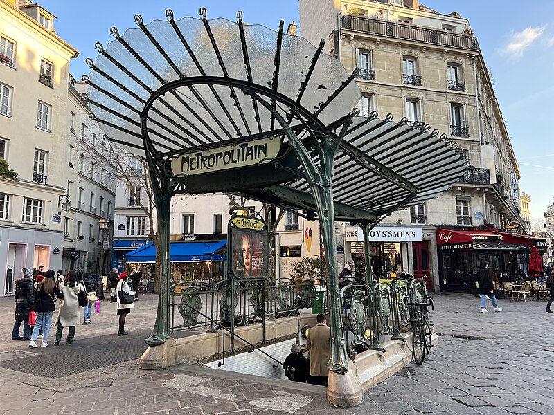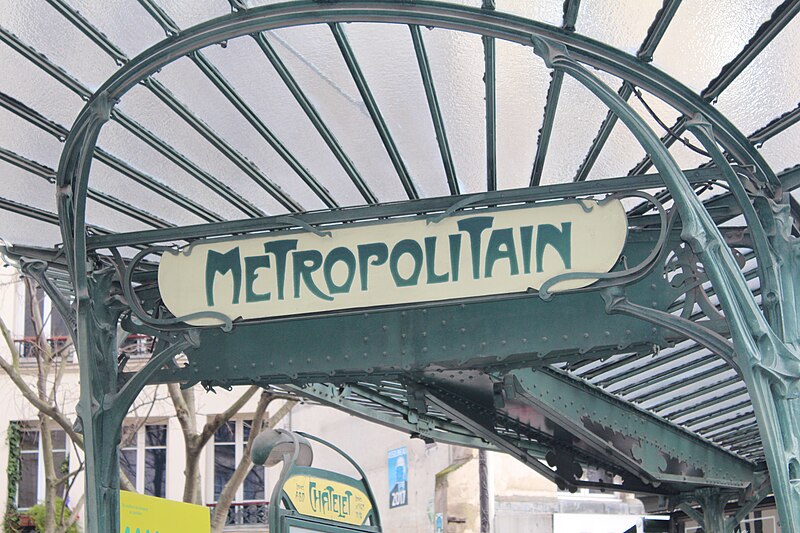 L'accès à la station Châtelet est l'un des édicules du métro dessinés en 1900 par Hector Guimard pour la Compagnie générale du Métropolitain de Paris ; la station se situe sur la ligne 1, inaugurée la même année. Les réalisations de Guimard, conçues dans un style Art nouveau, vont des édicules couverts mêlant fer, fonte, verre et lave émaillée à des entourages plus simples composés d'une balustrade et d'un portique en fonte sculptée, repérables par leurs candélabres soutenant une enseigne « Métropolitain » et des verrines colorées. Conçues selon une logique modulaire, ces entrées associent éléments standardisés — panneaux de lave émaillée, montants en fonte, vitrages et marquises — et productions semi-industrielles afin d’être adaptées aux contraintes de chaque site. Guimard obtint la commande hors concours et livra rapidement dessins et projets, mais la collaboration avec la CMP se détériora pour des motifs financiers ; en 1903 une convention mit fin au contrat tout en permettant à la Compagnie de reproduire ses modèles. Entre le printemps 1900 et 1913, la CMP posa nombre d’ouvrages d’après ses plans : entourages à écussons ou à cartouches, édicules de deux modèles et trois petits pavillons destinés aux gares les plus importantes. Sur les 167 ouvrages édifiés d’après ses dessins, la plupart des édicules et près de la moitié des entourages furent détruits dans les décennies suivantes, l’Art nouveau passant de mode. Le choix des matériaux et des fournisseurs reflète le souci technique et esthétique de Guimard : pierres de soubassement, fontes produites en série, panneaux de lave émaillée, verrines et vitrages réalisés par des ateliers spécialisés. La simplicité des entourages convint bientôt la municipalité de généraliser ces modèles au détriment des édicules, initialement prévus en plus grand nombre. Au fil du XXe siècle, l’abandon, les remplacements par des modèles plus sobres et les difficultés d’entretien entraînèrent démontages et pertes, tandis que certaines pièces furent prêtées ou offertes à des musées et institutions étrangères. Dès les années 1960 la redécouverte de l’Art nouveau amorça des mesures de protection et des restaurations, et un arrêté de 1965 puis une inscription de 1978 protègent plusieurs ouvrages, inscription complétée en 2016 par l’ajout de l’entourage de la place de la Nation. La RATP a engagé depuis les années 1970 des campagnes de maintenance et, à l’approche du centenaire du métro, des restaurations à l’identique menées avec les services des Monuments historiques. Parmi les ouvrages conservés, l’édicule de la Porte Dauphine est le seul édicule B d’origine resté en place et restauré, et le modèle A à claire-voie déplacé est visible à Abbesses. La version allégée installée place Sainte-Opportune, qui offre un accès secondaire à la station Châtelet, est une reconstitution réalisée en 2000 d’un exemplaire initialement édifié à la Gare de Lyon. Longtemps controversées, les entrées de Guimard sont aujourd’hui reconnues comme des symboles de l’Art nouveau et du paysage parisien, contribuant à l’image et à l’imaginaire de la ville et demeurant un élément identitaire du métro.