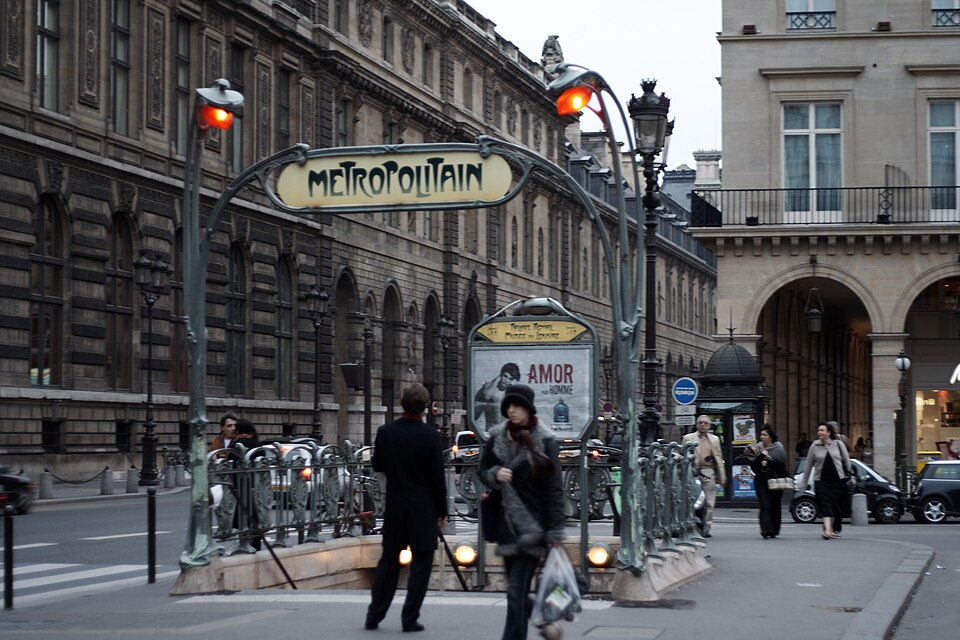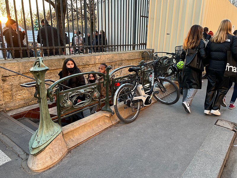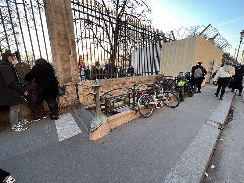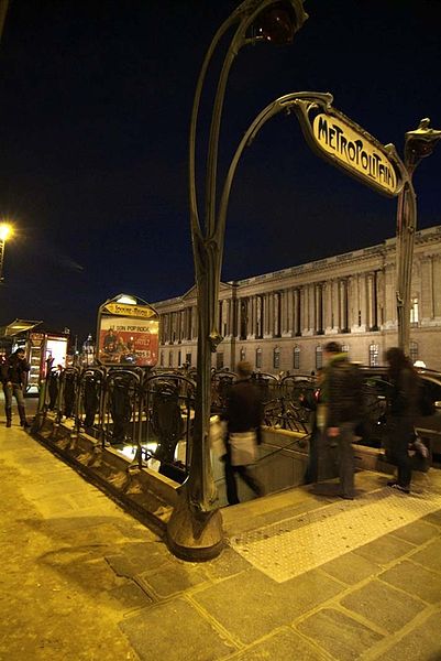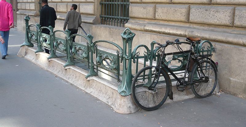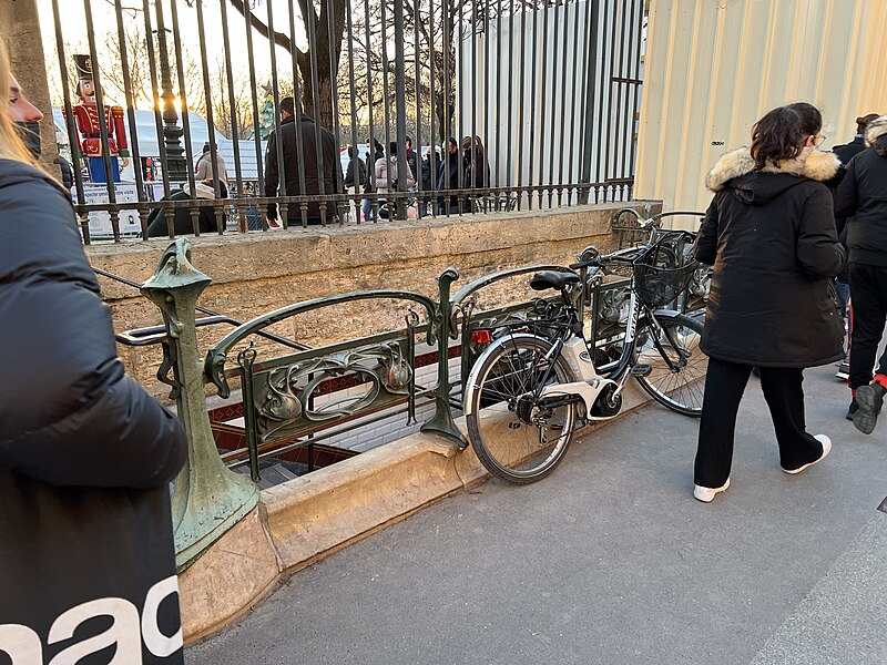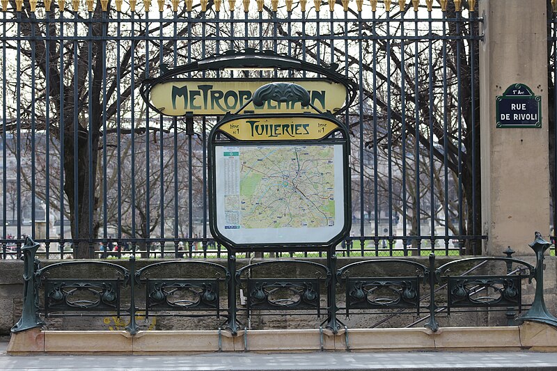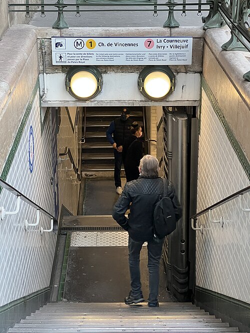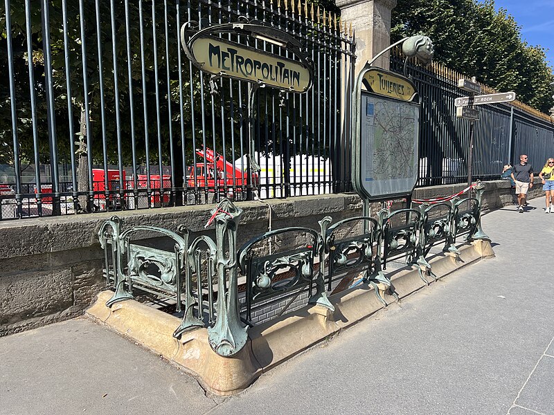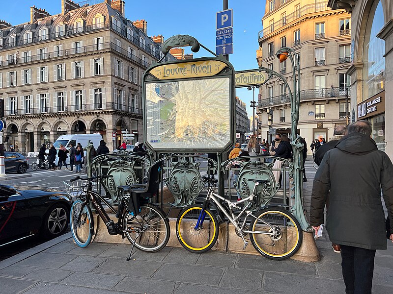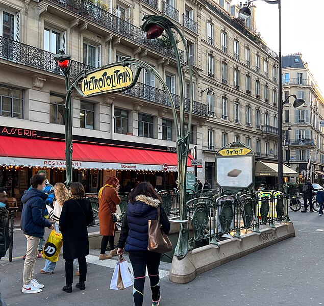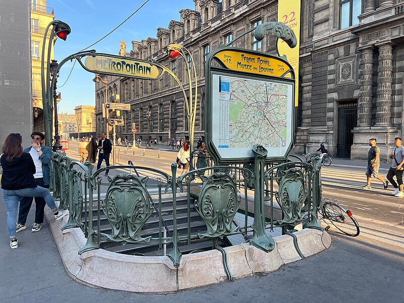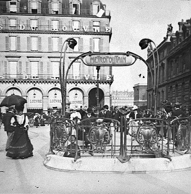 L'accès à la station Châtelet est l'un des édicules du métro dessinés en 1900 par Hector Guimard pour la Compagnie générale du Métropolitain de Paris ; la station se situe sur la ligne 1, inaugurée la même année. Les réalisations de Guimard, conçues dans un style Art nouveau, vont des édicules couverts mêlant fer, fonte, verre et lave émaillée à des entourages plus simples composés d'une balustrade et d'un portique en fonte sculptée, repérables par leurs candélabres soutenant une enseigne « Métropolitain » et des verrines colorées. Conçues selon une logique modulaire, ces entrées associent éléments standardisés — panneaux de lave émaillée, montants en fonte, vitrages et marquises — et productions semi-industrielles afin d’être adaptées aux contraintes de chaque site. Guimard obtint la commande hors concours et livra rapidement dessins et projets, mais la collaboration avec la CMP se détériora pour des motifs financiers ; en 1903 une convention mit fin au contrat tout en permettant à la Compagnie de reproduire ses modèles. Entre le printemps 1900 et 1913, la CMP posa nombre d’ouvrages d’après ses plans : entourages à écussons ou à cartouches, édicules de deux modèles et trois petits pavillons destinés aux gares les plus importantes. Sur les 167 ouvrages édifiés d’après ses dessins, la plupart des édicules et près de la moitié des entourages furent détruits dans les décennies suivantes, l’Art nouveau passant de mode. Le choix des matériaux et des fournisseurs reflète le souci technique et esthétique de Guimard : pierres de soubassement, fontes produites en série, panneaux de lave émaillée, verrines et vitrages réalisés par des ateliers spécialisés. La simplicité des entourages convint bientôt la municipalité de généraliser ces modèles au détriment des édicules, initialement prévus en plus grand nombre. Au fil du XXe siècle, l’abandon, les remplacements par des modèles plus sobres et les difficultés d’entretien entraînèrent démontages et pertes, tandis que certaines pièces furent prêtées ou offertes à des musées et institutions étrangères. Dès les années 1960 la redécouverte de l’Art nouveau amorça des mesures de protection et des restaurations, et un arrêté de 1965 puis une inscription de 1978 protègent plusieurs ouvrages, inscription complétée en 2016 par l’ajout de l’entourage de la place de la Nation. La RATP a engagé depuis les années 1970 des campagnes de maintenance et, à l’approche du centenaire du métro, des restaurations à l’identique menées avec les services des Monuments historiques. Parmi les ouvrages conservés, l’édicule de la Porte Dauphine est le seul édicule B d’origine resté en place et restauré, et le modèle A à claire-voie déplacé est visible à Abbesses. La version allégée installée place Sainte-Opportune, qui offre un accès secondaire à la station Châtelet, est une reconstitution réalisée en 2000 d’un exemplaire initialement édifié à la Gare de Lyon. Longtemps controversées, les entrées de Guimard sont aujourd’hui reconnues comme des symboles de l’Art nouveau et du paysage parisien, contribuant à l’image et à l’imaginaire de la ville et demeurant un élément identitaire du métro.