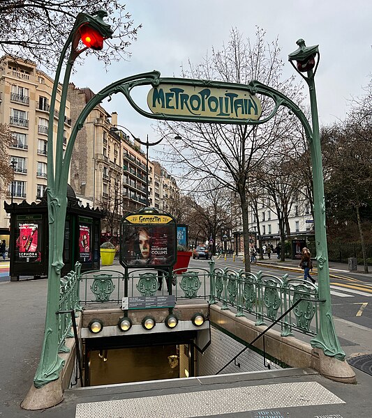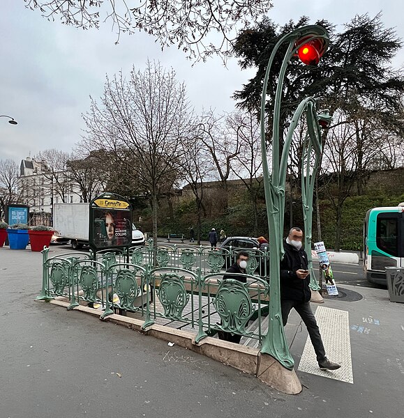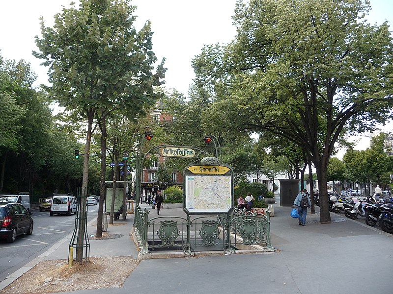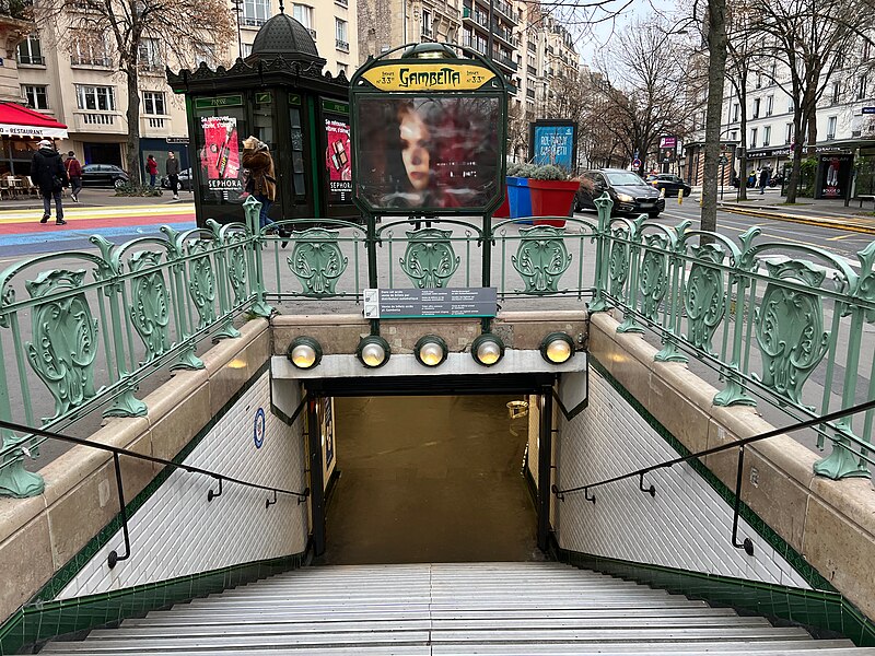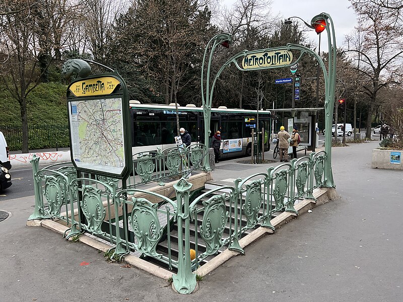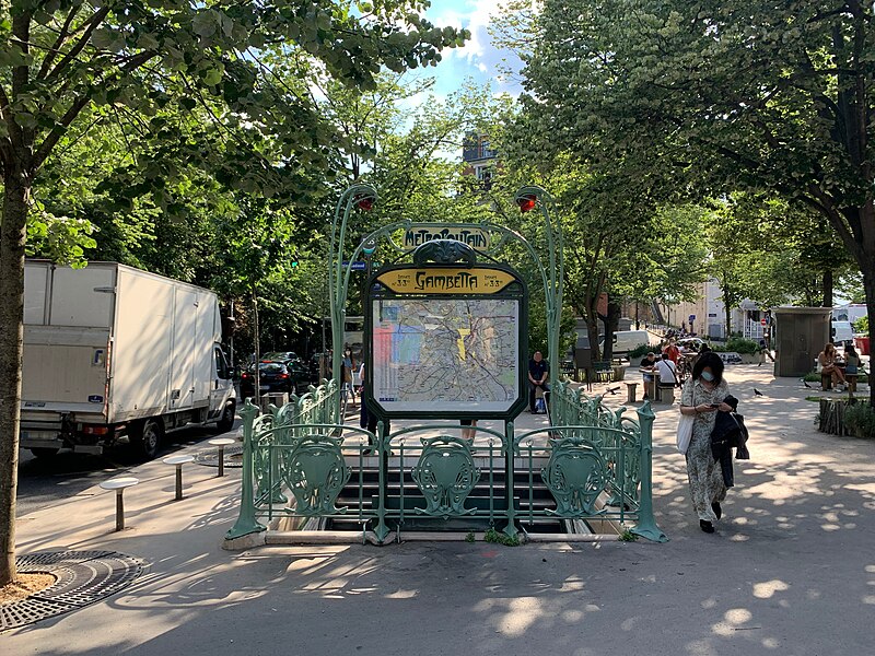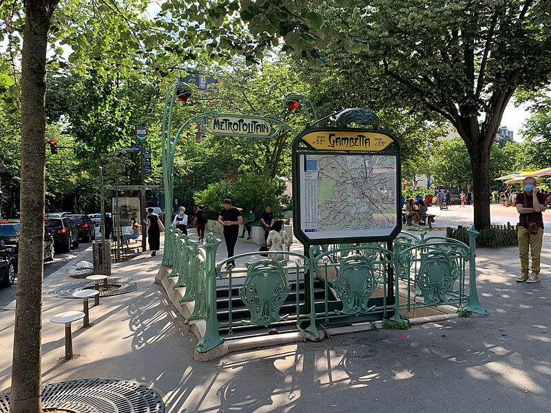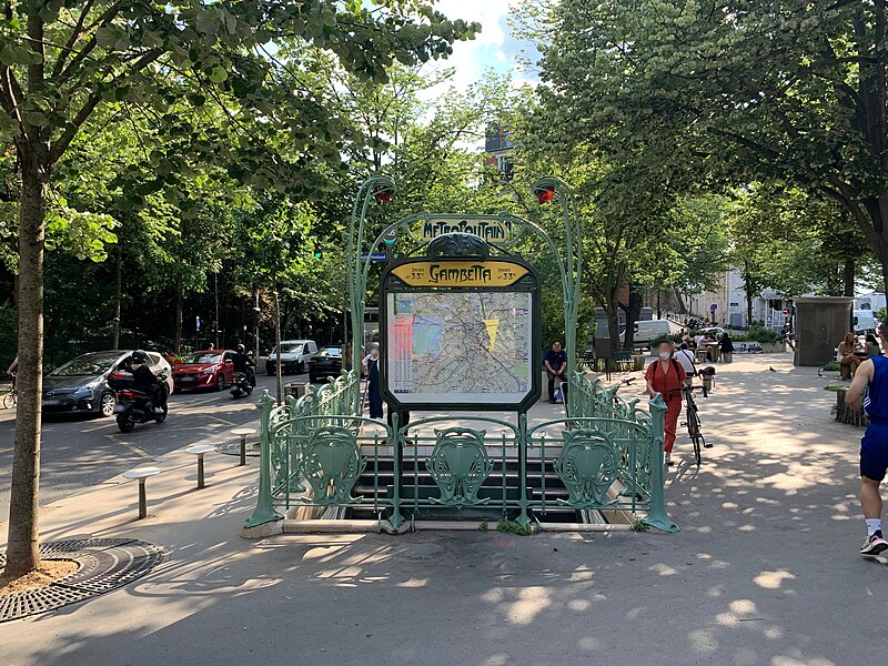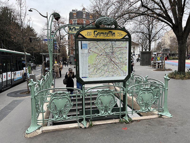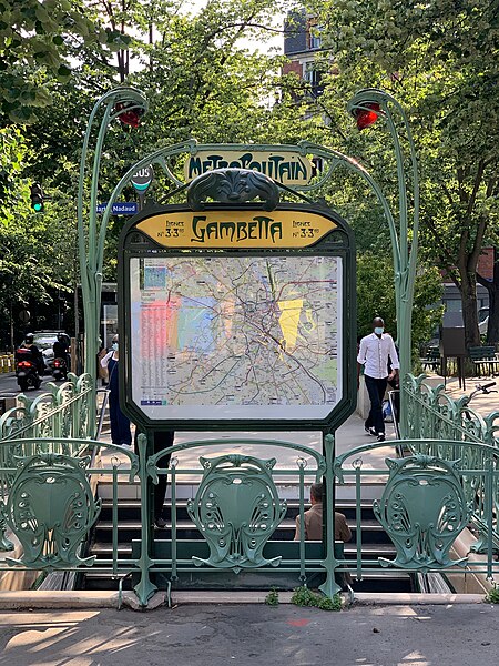 L'accès de la station Gambetta a été dessiné en 1900 par l'architecte Hector Guimard pour la Compagnie générale du Métropolitain de Paris ; la station, anciennement Martin Nadeau, se situe sur une section de la ligne 3 inaugurée en 1902. Les réalisations de Guimard pour le métro comprennent des édicules couverts et des entourages plus simples, réalisés en fer, fonte, verre et lave émaillée, avec des candélabres portant l'enseigne « Métropolitain ». Dessinés à partir du printemps 1900, ces accès seront abandonnés par la Compagnie après 1913 ; sur les 167 ouvrages construits la plupart des édicules et près de la moitié des entourages furent détruits dans les décennies suivantes. Malgré ces pertes, les entrées de Guimard ont contribué à sa postérité et à la redécouverte de l'Art nouveau ; à partir des années 1960 les installations restantes ont fait l'objet de protections aux titres des Monuments historiques et quelques pièces ont été transférées à l'étranger. Guimard n'avait pas participé au concours lancé en 1899 par la CMP, qui n'avait retenu aucun projet, mais il fut engagé hors concours début 1900 dans des circonstances partiellement obscures et fournira rapidement des dessins complets. Les plans conservés au musée d'Orsay et à la RATP montrent une conception modulaire et standardisée destinée à permettre une production en série et une adaptation aux différents sites. Deux modèles d'édicule se distinguent par leur composition commune — panneaux de lave émaillée insérés dans une armature métallique, vitres surmontant les panneaux, espace ventilé et toiture — et par leurs profils respectifs : l'un plus ramassé et conventionnel, l'autre plus audacieux avec une toiture en V et un chéneau central. Guimard a aussi dessiné de plus grands « pavillons » comprenant guichets et salles d'attente pour des arrêts d'importance, dont certains exemples notables se trouvaient à Bastille et à l'Étoile. La majorité des entourages se présentent comme des balustrades en fonte d'environ un mètre vingt, ponctuées de potelets fins et d'écussons sculptés, avec un portique formé par deux candélabres soutenant une plaque émaillée « Métropolitain » et deux verrines rouge orangé servant à signaler l'entrée ; dès 1901 la CMP compléta progressivement ces dispositifs par un éclairage électrique. Pour les accès secondaires, des cartouches rectangulaires moins hauts furent employés, et à partir de 1901 la Compagnie adopta des enseignes « Métro » inspirées du lettrage de Guimard. Fidèle à l'idéal d'allier esthétique et rationalité, Guimard privilégia les matériaux modernes — verre, lave émaillée, fer et fonte — et limita l'usage de la pierre aux soubassements, en concevant des modules répétables pour réduire les coûts. Des désaccords financiers et contractuels avec la CMP entraînèrent une rupture progressive : une convention de 1903 mit fin aux relations en prévoyant néanmoins la cession des modèles et des droits de Guimard à la Compagnie. La réalisation mobilisa plusieurs fournisseurs spécialisés : pierres de Comblanchien pour les soubassements, la fonderie du Val d'Osne pour les fontes, l'atelier de Gillet pour les panneaux de lave émaillée et les enseignes, la cristallerie de Pantin pour les verrines et des maîtres-verriers pour les toitures vitrées. L'accueil des créations fut contrasté : admirées pour leur inventivité, elles subirent aussi critiques et moqueries, puis une longue période de délaissement et de destructions au profit de modèles plus sobres et de l'Art déco. À partir des années 1960 la mobilisation des spécialistes et des institutions conduisit à des mesures de protection et à des campagnes de restauration ; un premier inventaire et des inscriptions au titre des Monuments historiques furent mises en place, puis complétées ultérieurement. La RATP engagea des programmes d'entretien et, à l'approche du centenaire du métro, lança des restaurations plus ambitieuses visant la restitution à l'identique des formes et des couleurs ; certaines pièces conservées ou reconstituées sont aujourd'hui visibles à Paris et à l'étranger. Les accès de Guimard sont devenus des éléments emblématiques du paysage parisien et de l'Art nouveau, fréquemment repris dans la peinture, la bande dessinée, le cinéma et l'iconographie urbaine, symbolisant pour beaucoup la Belle Époque.