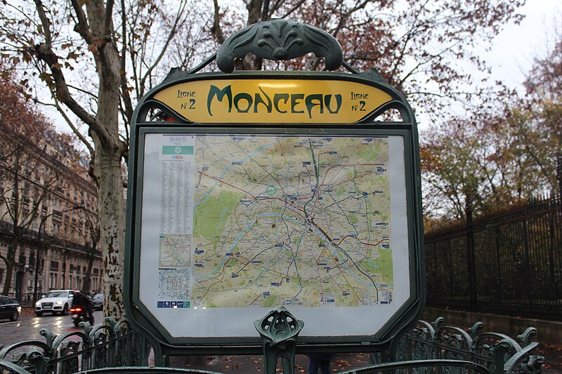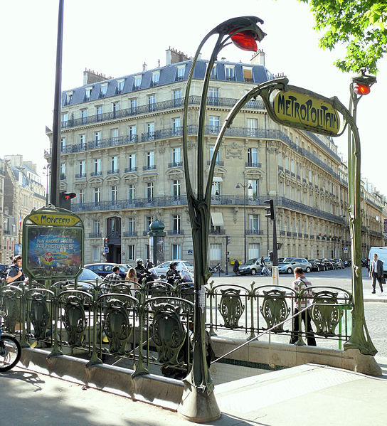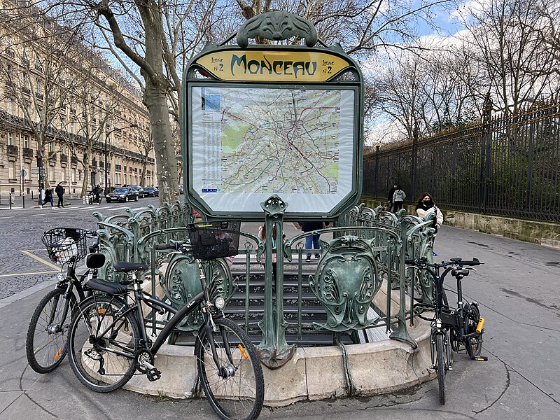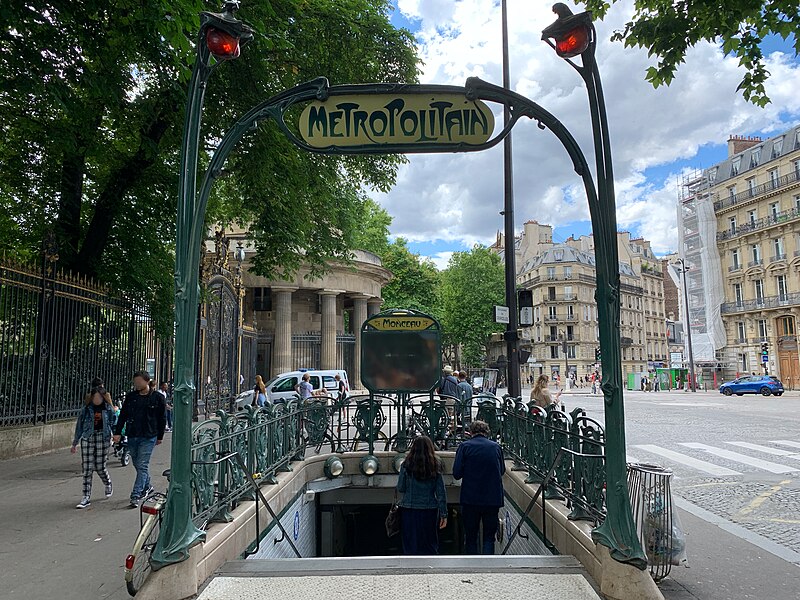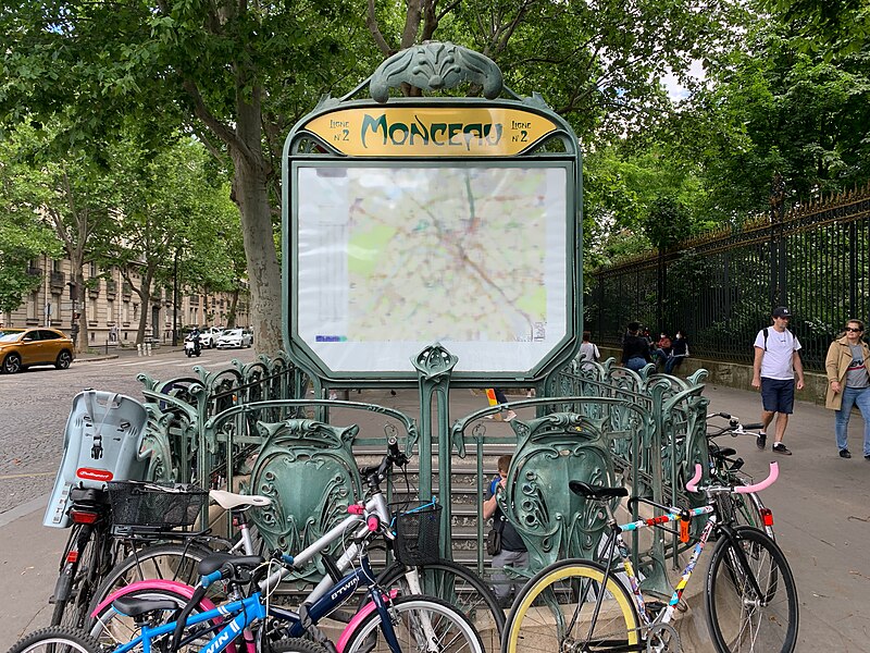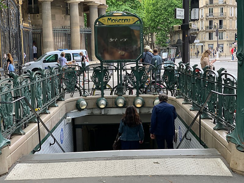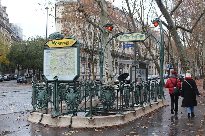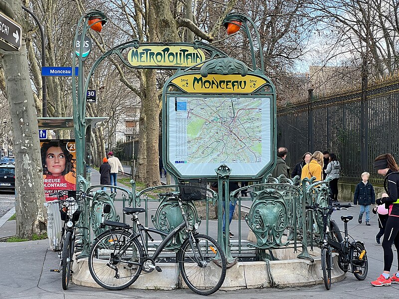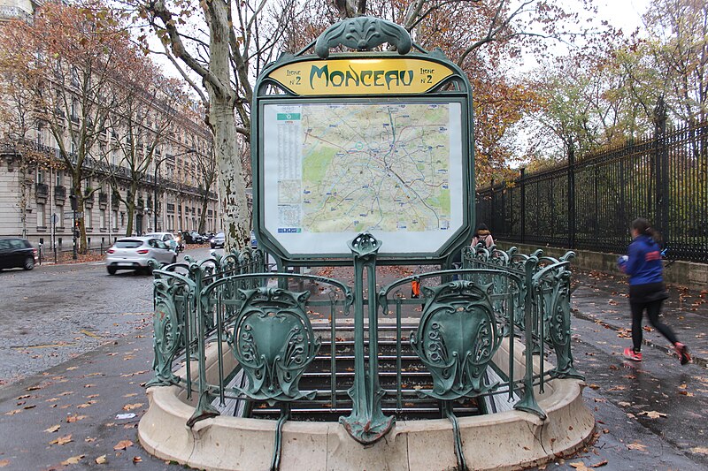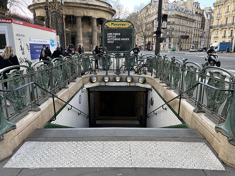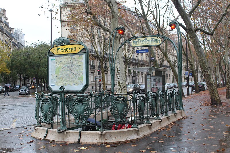 L'accès de la station Monceau a été dessiné en 1900 par Hector Guimard pour la Compagnie générale du Métropolitain de Paris et se situe sur une section de la ligne 2 inaugurée en 1902. Guimard, figure de l'Art nouveau, a conçu pour le réseau des édicules et des entourages mêlant fer, fonte, verre et lave émaillée, ainsi que des portiques munis de candélabres supportant l'enseigne « Métropolitain ». Après l'échec du concours de 1899, la Compagnie confia hors concours la conception des accès à Guimard au début de 1900, procédure dont les modalités exactes restent partiellement obscures. Il proposa deux modèles d'édicules, A et B, et des variantes à claire-voie, ainsi que des entourages simples standardisés destinés aux trémies étroites. Les édicules associent panneaux de lave émaillée insérés dans une armature métallique, vitrages, marquises et toitures : le modèle A est plus compact et orthogonal, le modèle B plus élancé, avec chéneau central et marquise arrondie côté escalier. Les entourages simples consistent généralement en une balustrade de fonte encadrée par deux candélabres qui portent la plaque « Métropolitain » dans un lettrage Art nouveau et parfois deux verrines rouge orangé. Guimard a conçu ces éléments selon un principe modulaire et reproductible pour adapter l'habillage des accès aux caractéristiques de chaque site et faciliter la production semi‑industrielle. Il privilégia les matériaux modernes — verre, lave émaillée, fer et fonte moulée — en limitant l'emploi de la pierre aux soubassements, et confia la fabrication de certaines pièces à des ateliers spécialisés. Malgré l'accueil initial favorable, des désaccords financiers et contractuels opposèrent Guimard à la Compagnie et aboutirent à une convention en 1903 par laquelle il céda ses modèles et ses droits contre le règlement de ses créances. La Compagnie continua toutefois à installer des ouvrages d'après ses plans jusqu'en 1913, puis, avec le déclin de l'Art nouveau et l'évolution des normes et des goûts, de nombreux édicules et entourages furent démontés, abandonnés ou détruits. La détérioration des verrières, des panneaux émaillés et des fontes, ainsi que la préférence pour des modèles plus sobres, expliquent en grande partie leur disparition progressive. À partir des années 1960, la redécouverte de l'Art nouveau entraîna des mesures de protection, des prêts et des dons à des musées, puis des inscriptions sur les listes de protection et des campagnes de conservation. La RATP a lancé des programmes de maintenance et de restauration à l'identique à la fin du XXe siècle afin de restituer les peintures, fontes, verrines et enseignes et d'assurer la pérennité des ouvrages. Quelques édicules originaux subsistent ou ont été reconstitués et déplacés, tandis que d'autres pièces sont conservées dans des musées ou offertes à des villes étrangères. Longtemps controversées, les entrées de Guimard sont aujourd'hui considérées comme des éléments emblématiques du paysage parisien et comme des symboles de l'Art nouveau, dont la préservation relève désormais d'une politique patrimoniale active.