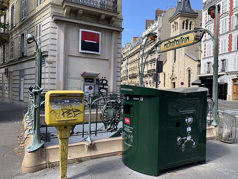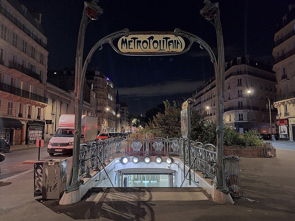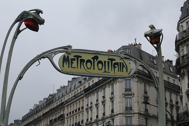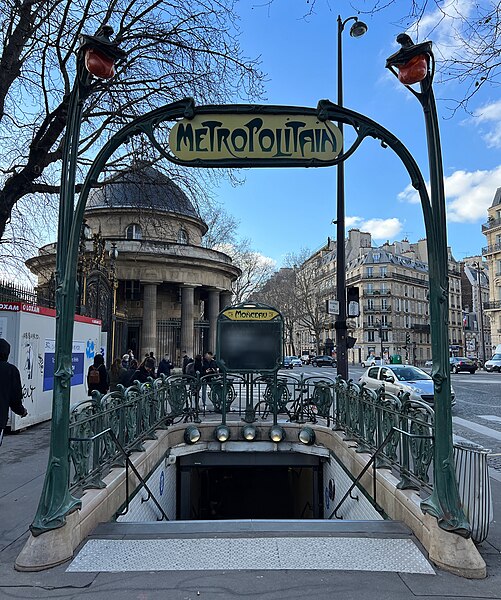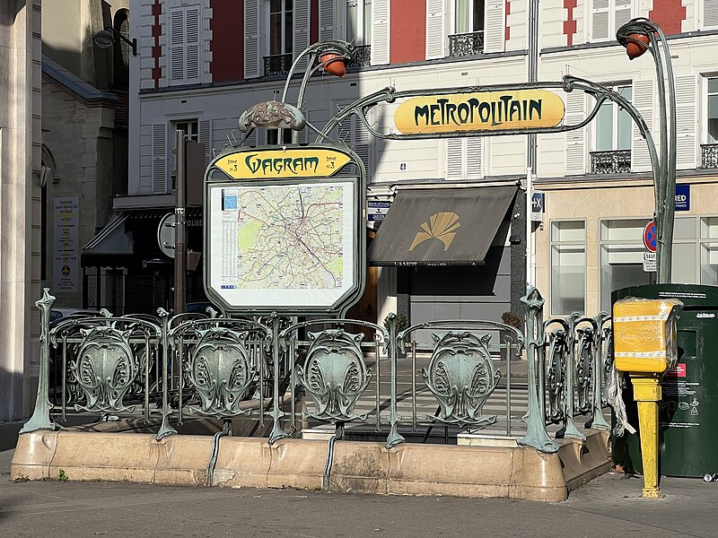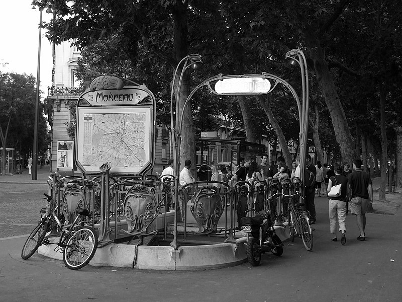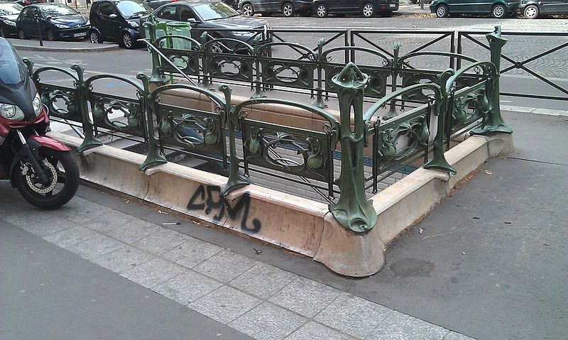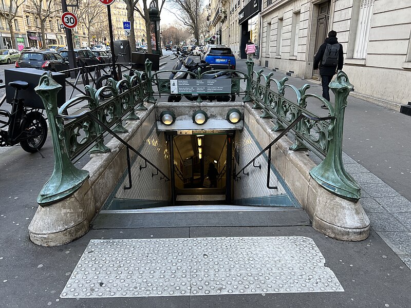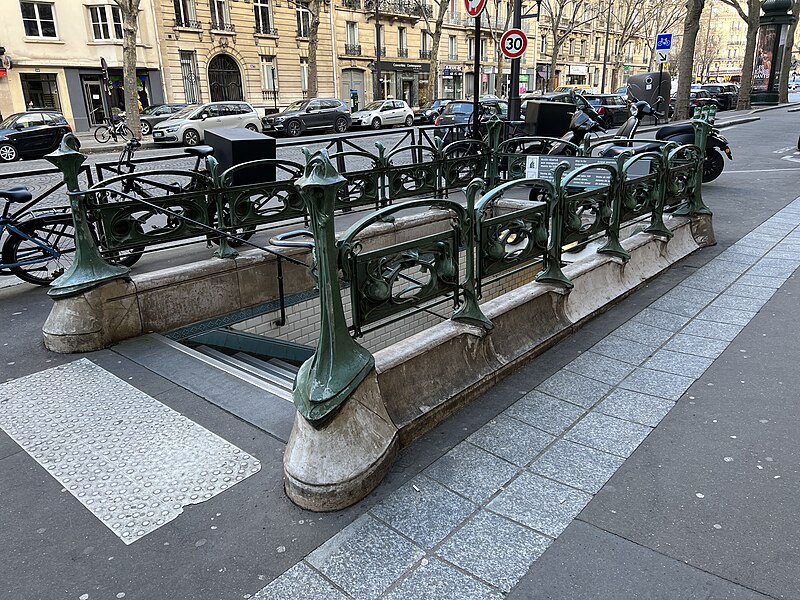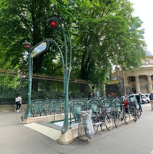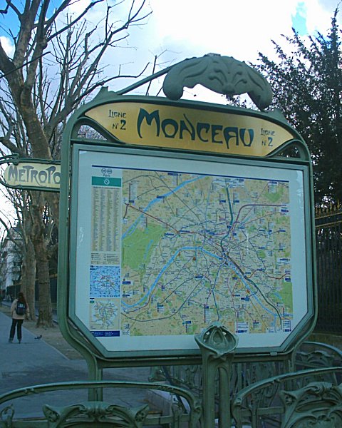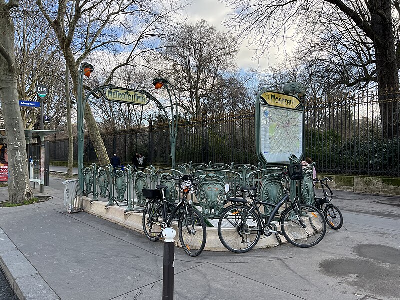 L'accès de la station Monceau a été dessiné en 1900 par Hector Guimard pour la Compagnie générale du Métropolitain de Paris et se situe sur une section de la ligne 2 inaugurée en 1902. Guimard, figure de l'Art nouveau, a conçu pour le réseau des édicules et des entourages mêlant fer, fonte, verre et lave émaillée, ainsi que des portiques munis de candélabres supportant l'enseigne « Métropolitain ». Après l'échec du concours de 1899, la Compagnie confia hors concours la conception des accès à Guimard au début de 1900, procédure dont les modalités exactes restent partiellement obscures. Il proposa deux modèles d'édicules, A et B, et des variantes à claire-voie, ainsi que des entourages simples standardisés destinés aux trémies étroites. Les édicules associent panneaux de lave émaillée insérés dans une armature métallique, vitrages, marquises et toitures : le modèle A est plus compact et orthogonal, le modèle B plus élancé, avec chéneau central et marquise arrondie côté escalier. Les entourages simples consistent généralement en une balustrade de fonte encadrée par deux candélabres qui portent la plaque « Métropolitain » dans un lettrage Art nouveau et parfois deux verrines rouge orangé. Guimard a conçu ces éléments selon un principe modulaire et reproductible pour adapter l'habillage des accès aux caractéristiques de chaque site et faciliter la production semi‑industrielle. Il privilégia les matériaux modernes — verre, lave émaillée, fer et fonte moulée — en limitant l'emploi de la pierre aux soubassements, et confia la fabrication de certaines pièces à des ateliers spécialisés. Malgré l'accueil initial favorable, des désaccords financiers et contractuels opposèrent Guimard à la Compagnie et aboutirent à une convention en 1903 par laquelle il céda ses modèles et ses droits contre le règlement de ses créances. La Compagnie continua toutefois à installer des ouvrages d'après ses plans jusqu'en 1913, puis, avec le déclin de l'Art nouveau et l'évolution des normes et des goûts, de nombreux édicules et entourages furent démontés, abandonnés ou détruits. La détérioration des verrières, des panneaux émaillés et des fontes, ainsi que la préférence pour des modèles plus sobres, expliquent en grande partie leur disparition progressive. À partir des années 1960, la redécouverte de l'Art nouveau entraîna des mesures de protection, des prêts et des dons à des musées, puis des inscriptions sur les listes de protection et des campagnes de conservation. La RATP a lancé des programmes de maintenance et de restauration à l'identique à la fin du XXe siècle afin de restituer les peintures, fontes, verrines et enseignes et d'assurer la pérennité des ouvrages. Quelques édicules originaux subsistent ou ont été reconstitués et déplacés, tandis que d'autres pièces sont conservées dans des musées ou offertes à des villes étrangères. Longtemps controversées, les entrées de Guimard sont aujourd'hui considérées comme des éléments emblématiques du paysage parisien et comme des symboles de l'Art nouveau, dont la préservation relève désormais d'une politique patrimoniale active.