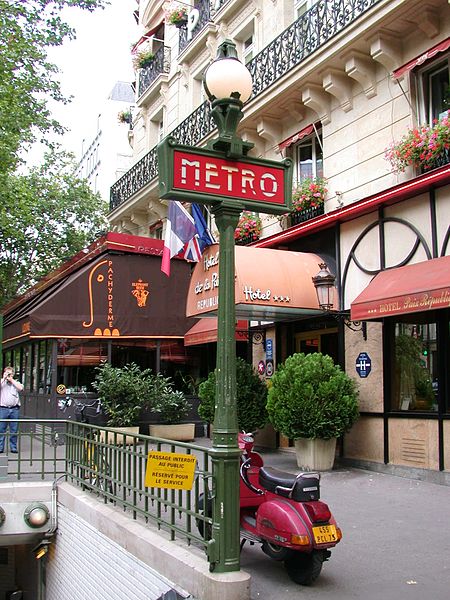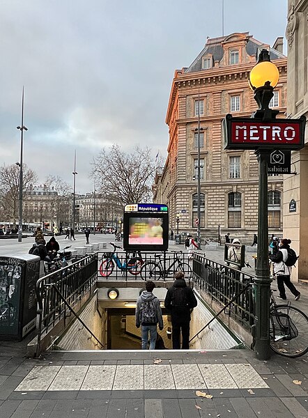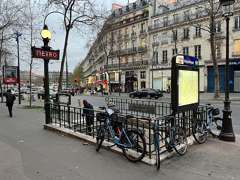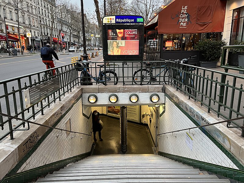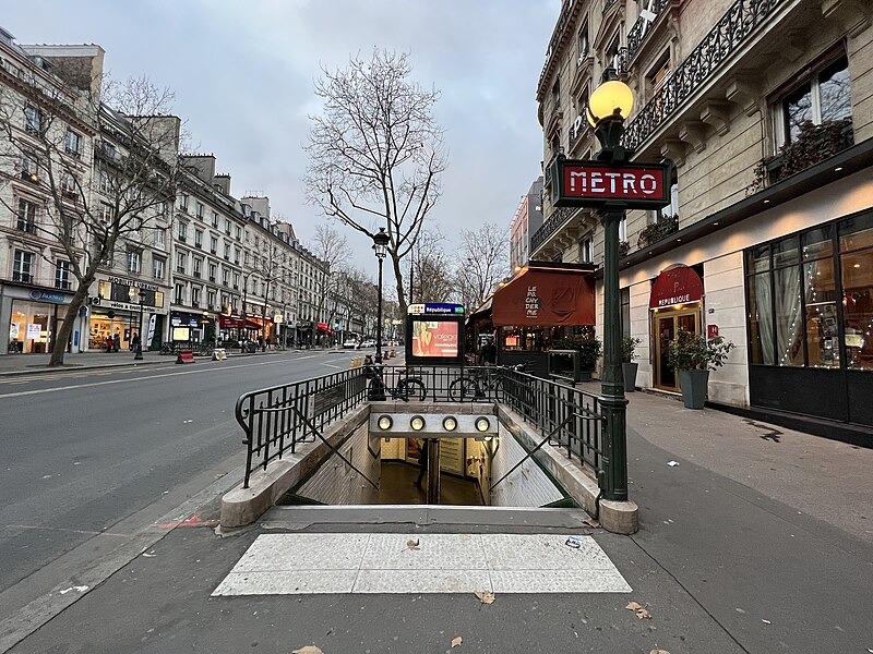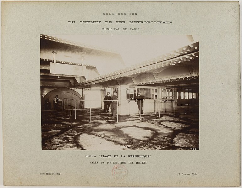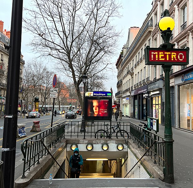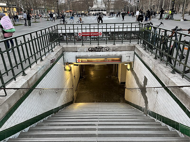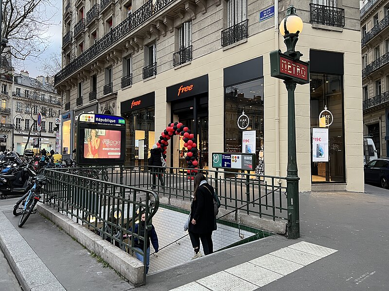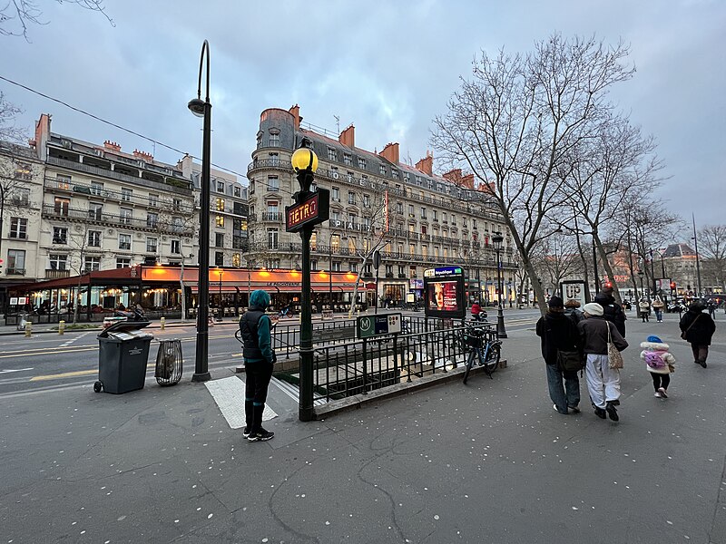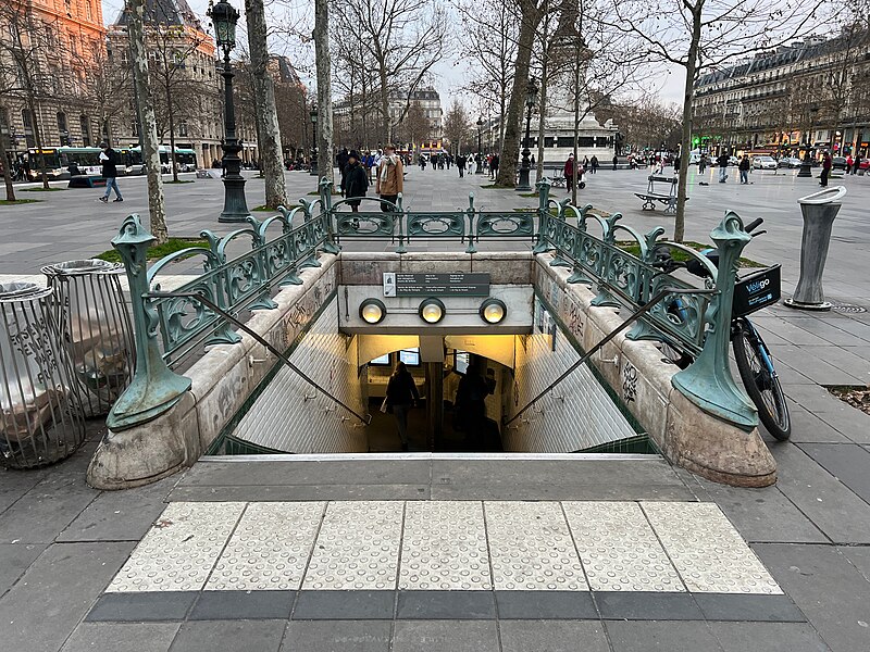 L'accès de la station du métro a été dessiné en 1900 par Hector Guimard pour la Compagnie du chemin de fer métropolitain de Paris (CMP). La station se situe sur une section de la ligne 3 inaugurée en 1904 ; l'accès, de type secondaire, est implanté à l'angle de la place, face au départ du boulevard Magenta. L'arrêté de protection porte sur l'ensemble des réalisations subsistantes de Guimard pour le métro.