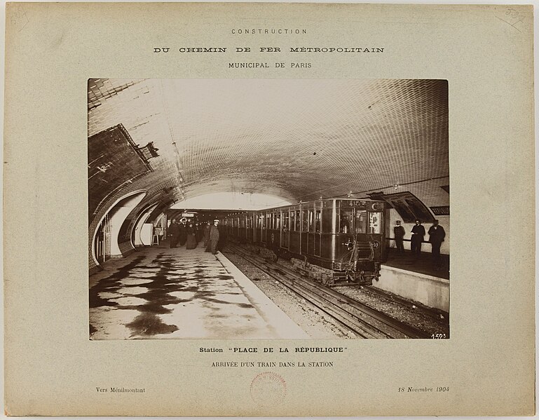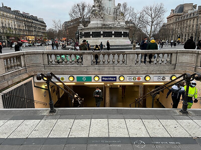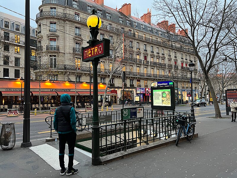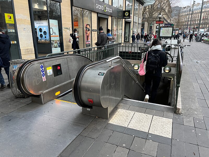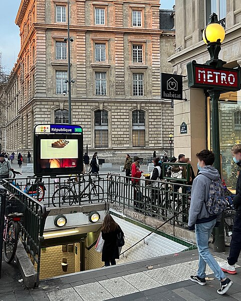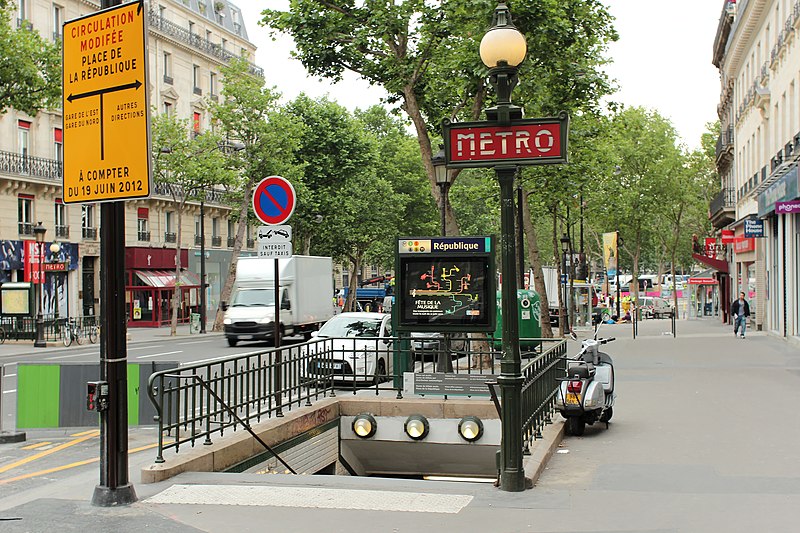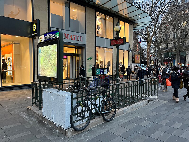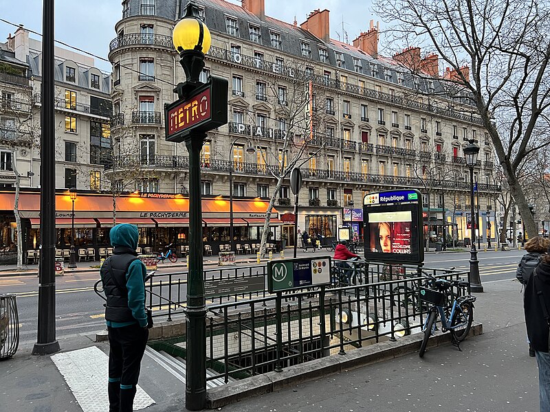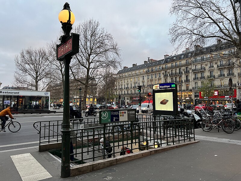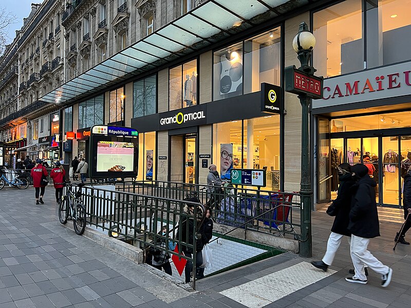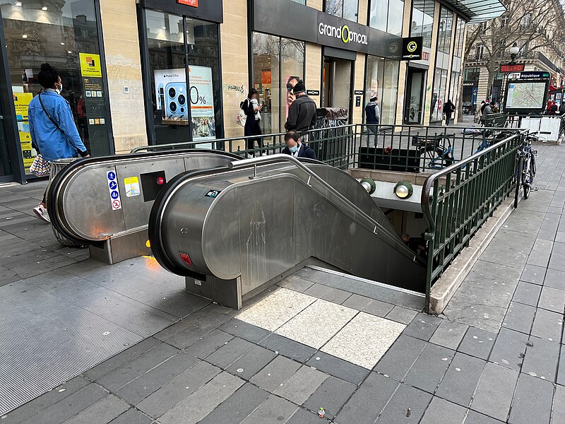 L'accès de la station du métro a été dessiné en 1900 par Hector Guimard pour la Compagnie du chemin de fer métropolitain de Paris (CMP). La station se situe sur une section de la ligne 3 inaugurée en 1904 ; l'accès, de type secondaire, est implanté à l'angle de la place, face au départ du boulevard Magenta. L'arrêté de protection porte sur l'ensemble des réalisations subsistantes de Guimard pour le métro.