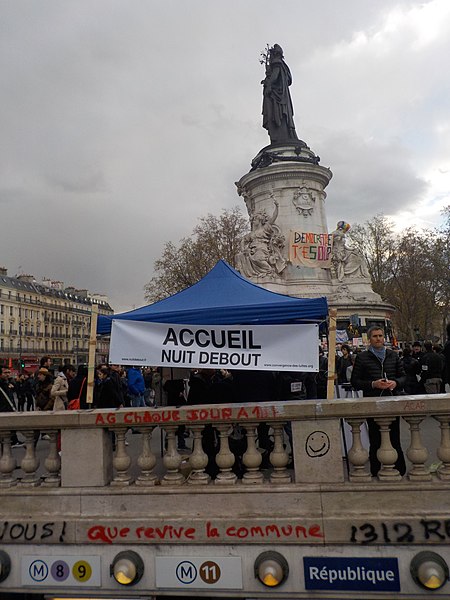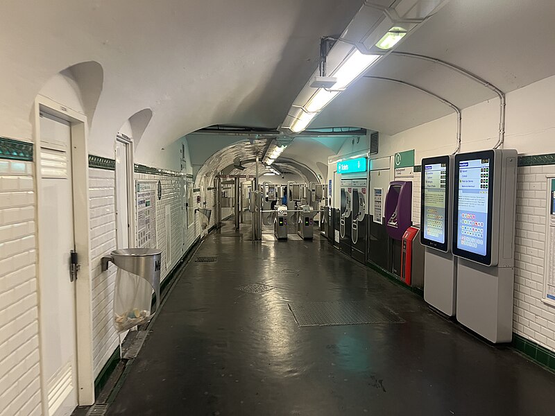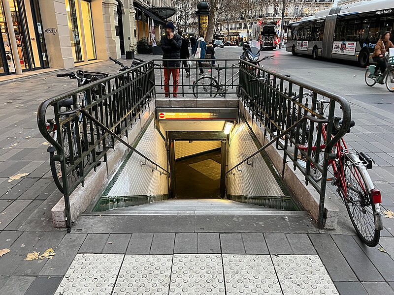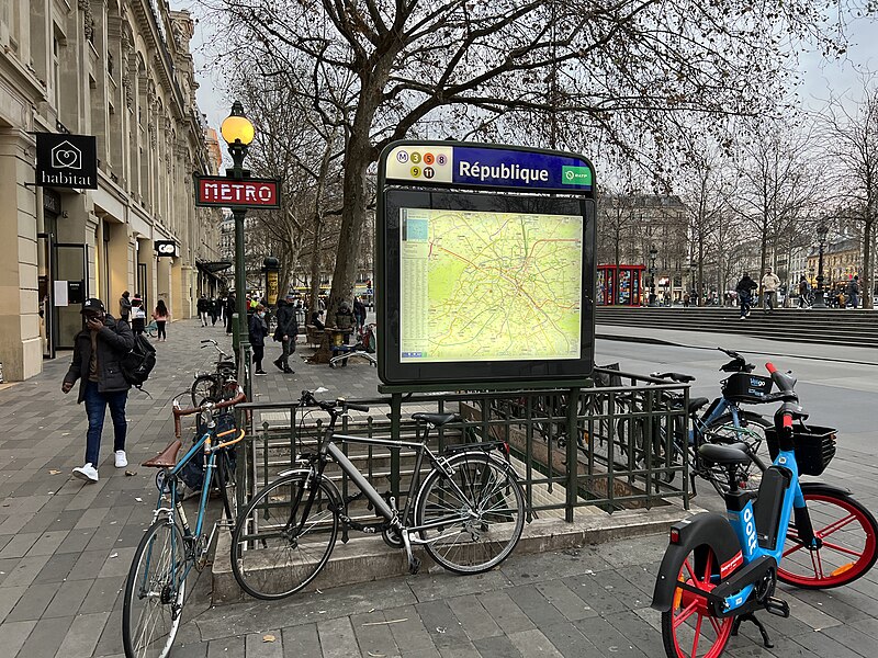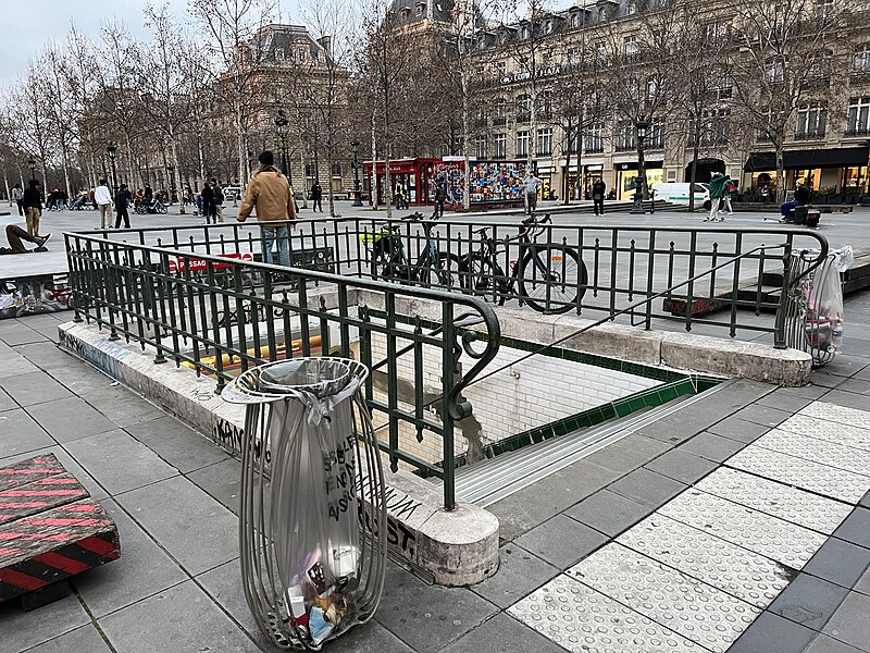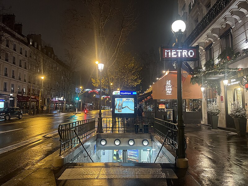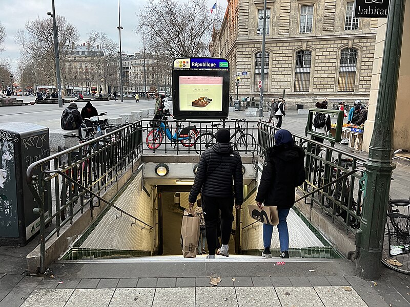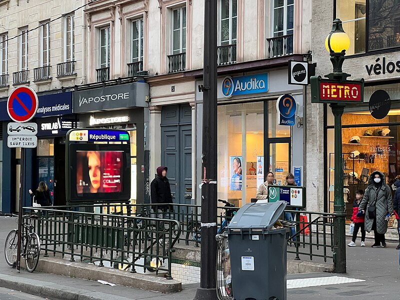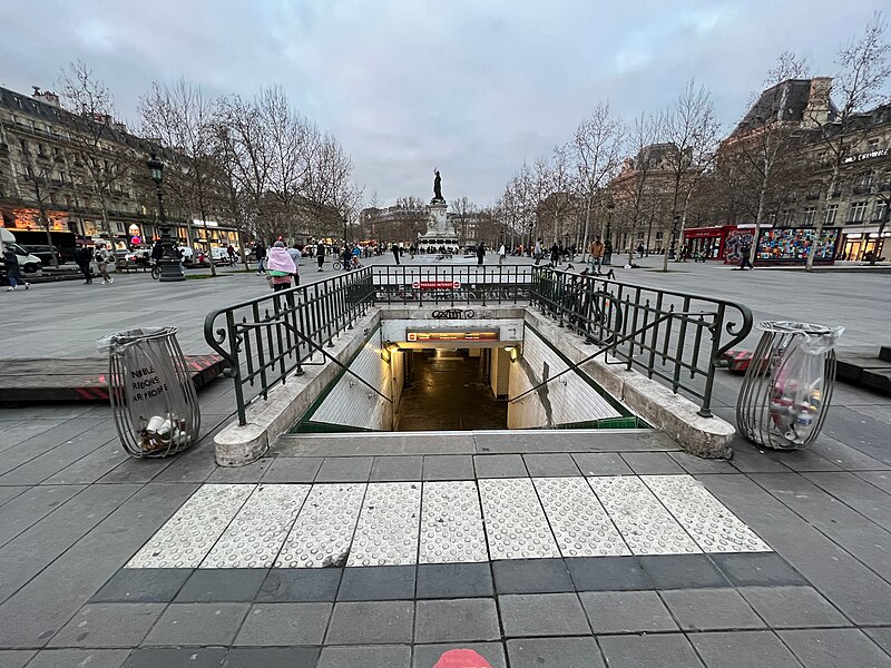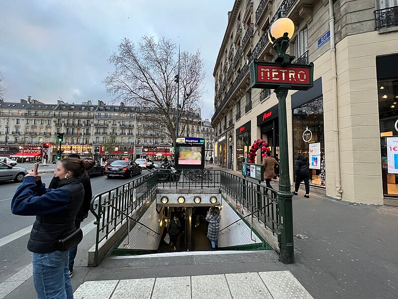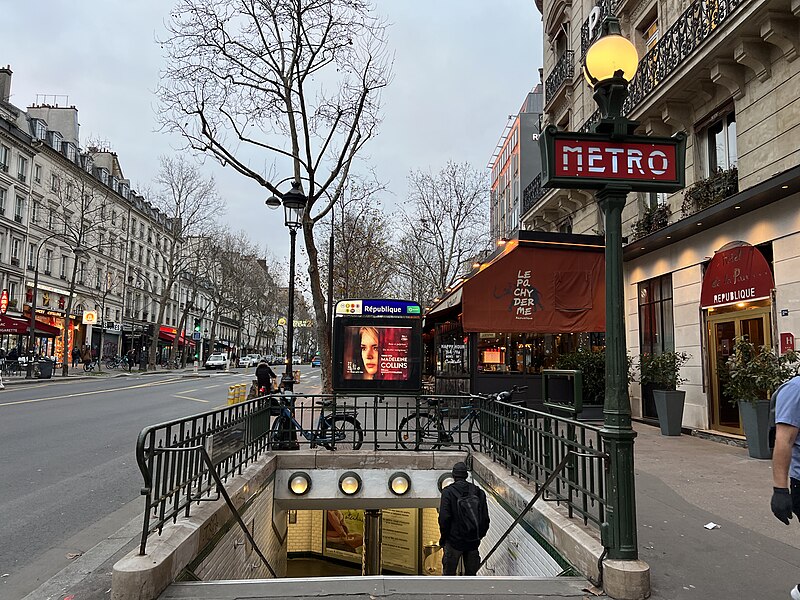 L'accès de la station du métro a été dessiné en 1900 par Hector Guimard pour la Compagnie du chemin de fer métropolitain de Paris (CMP). La station se situe sur une section de la ligne 3 inaugurée en 1904 ; l'accès, de type secondaire, est implanté à l'angle de la place, face au départ du boulevard Magenta. L'arrêté de protection porte sur l'ensemble des réalisations subsistantes de Guimard pour le métro.