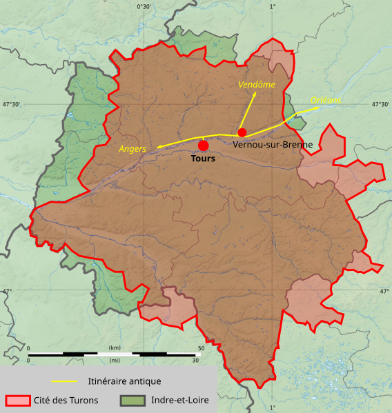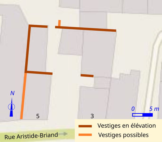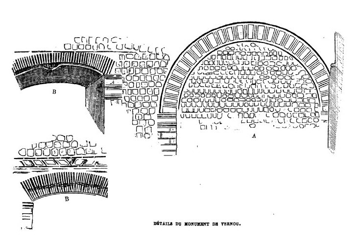 Les vestiges d'un édifice gallo-romain se situent au 3-5 rue Aristide-Briand, dans le centre de Vernou-sur-Brenne (Indre-et-Loire), à une centaine de mètres de la rive gauche de la Brenne. De l'édifice d'origine subsistent notamment deux murs perpendiculaires, englobés dans des constructions modernes, qui comportent chacun un arc en plein cintre dont les rouleaux alternent des claveaux de pierre et des claveaux formés de deux briques séparées par un lit épais de mortier. L'arrachement du mur sud livre des éléments du clavage d'une autre arcade dont le niveau paraît correspondre à celui de l'arc du mur ouest. L'ensemble, parfois désigné à tort « palais de Pépin le Bref », appartient en réalité à la période gallo-romaine et est attribué au IIe ou au IIIe siècle. La fonction du bâtiment reste incertaine : il a été proposé tantôt comme gîte d'étape lié à des voies antiques, tantôt comme thermes publics ou privés, Vernou étant dans l'Antiquité une agglomération secondaire au carrefour de plusieurs voies. Le site montre une occupation continue du Néolithique à La Tène ; la grande voie reliant Cenabum à Caesarodunum et Juliomagus, figurant sur la table de Peutinger, passe à proximité et, depuis Vernou, une voie suit la Brenne en direction du nord et de Vendôme. Sous les Mérovingiens le site demeure habité et le nom Vernaus vicus est cité par Grégoire de Tours à la fin du VIe siècle. Le bâtiment, seul vestige antique du secteur, présente une forme rectangulaire allongée d'ouest en est dont la partie orientale avait déjà disparu au milieu du XIXe siècle, ce qui complique l'appréciation de ses dimensions. Les murs conservés, hauts parfois de 6,80 m mais partiellement arasés, laissent percevoir une largeur de 11,65 m pour une longueur minimale de 20,60 m, sans que des aménagements intérieurs significatifs aient été retrouvés. Les maçonneries, larges de 0,65 à 0,75 m, sont constituées de deux parements en petit appareil de moellons calcaires avec, à intervalles réguliers, des lits de briques ou de tuiles ; le mortier, blanc ou rose, inclut parfois de la brique ou de la tuile pilée, et le cœur des murs est en blocage de moellons. Des arcades murées et des arcs de décharge montrent une voûte composée en alternance de tuiles et de pierres plates, et les fondations observées consistent en blocs irréguliers de tuffeau liés au mortier de chaux. Un fragment de sol en mortier rose trouvé à l'intérieur est interprété comme appartenant au frigidarium de thermes, mais cet aménagement peut résulter d'un remaniement ou d'une réaffectation postérieure ; un conduit d'évacuation percé dans le mur nord est un autre indice de transformations ultérieures. Les premières interprétations du XIXe siècle ont proposé des attributions historiques diverses, toutes jugées sans fondement, tandis que des comparaisons architecturales et des observations récentes rendent plausible l'hypothèse de thermes publics liés à l'agglomération, sans exclure la possibilité de bains de villa. Les vestiges, largement incorporés dans des bâtiments modernes, sont inscrits au titre des monuments historiques par arrêté du 6 mars 1947 ; en 1983, le parement des murs et la partie supérieure de plusieurs arcades étaient encore visibles dans les combles, la base des murs ouest et nord subsistait au rez-de-chaussée mais était recouverte d'un enduit, une portion du mur méridional dépassait d'une habitation moderne et montrait le départ d'un arc, et le mur nord-sud séparant les nos 5 et 7 de la rue Aristide-Briand a été proposé comme pouvant appartenir à l'édifice.
