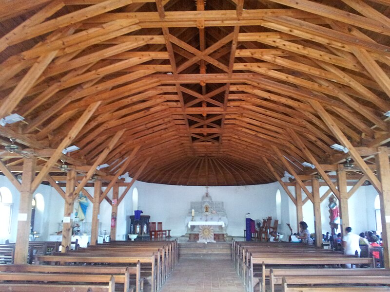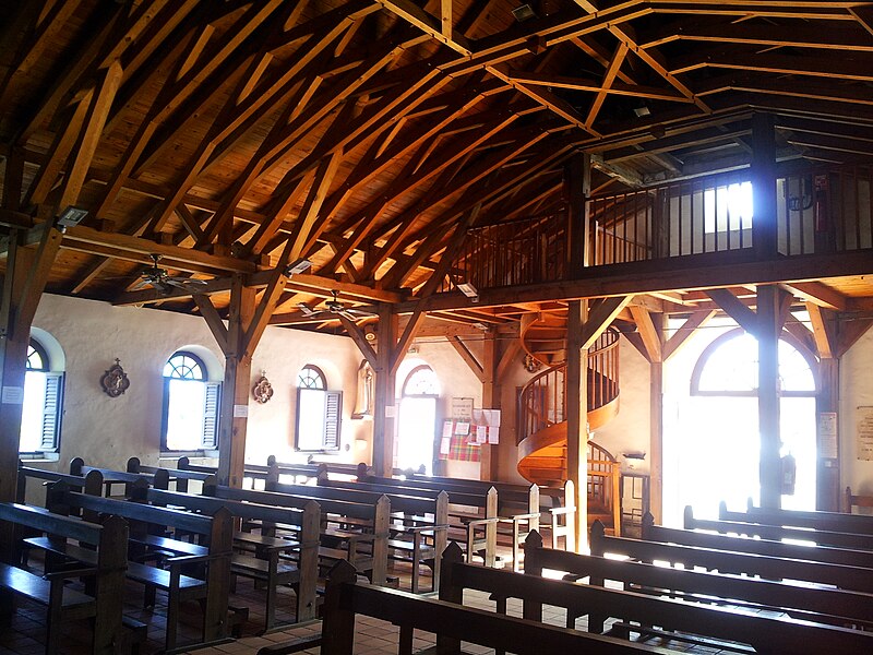 L'intérieur conserve une charpente apparente en carène de bateau renversée, entièrement refaite en 1983 après avoir été découpée en métropole puis transportée et remontée sur place. L'autel primitif en bois, dédié à la Vierge et devenu vétuste, a été remplacé par un autel en marbre "à la romaine" fabriqué au Puy en Haute-Loire en 1770. Le bassin monolithique, daté de la fin du XVIIe siècle et retrouvé par le père David, correspondrait aux fonts baptismaux originels contemporains du premier sanctuaire maçonné. Des vues de la façade, du chevet, de la nef et de la tribune témoignent de l'évolution architecturale de l'édifice.