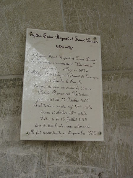 L'église Saint-Rupert-et-Saint-Druon, située à Vasseny dans l'Aisne, est dédiée à saint Rupert de Salzbourg et à Druon de Sebourg. La nef date du XIIe siècle, tandis que le transept et le chœur ont été reconstruits au siècle suivant. Sous l'Ancien Régime, la paroisse relevait du diocèse de Soissons (grand archidiaconé, doyenné de Chacrise). La cure était nommée par le prieur de Saint-Remi de Braine et, au début du XVIIIe siècle, le curé percevait la totalité de la dîme après l'abandon des trois gros décimateurs : le prieur de Braine et les chapitres des abbayes de Chartreuve et de Saint-Médard de Soissons. Le monument a été classé au titre des monuments historiques en 1909, moment où seul le chœur semblait en bon état. L'édifice a été ruiné lors du retrait des troupes allemandes à la fin de l'été 1918 ; seuls le flanc sud et la croisée du transept restaient debout. À partir de 1922, l'architecte des Monuments historiques Lucien Sallez a conçu un plan de reconstruction à l'identique. L'essentiel des travaux a été mené de 1930 à 1934 sous la direction de Robert Chaleil, architecte de la coopérative diocésaine de reconstruction des églises. Lors de cette restauration, la première travée du bas-côté nord a été restituée à la place d'un pan coupé qui fermait jusqu'alors l'édifice, pour y accueillir les fonts baptismaux. Pendant les travaux, le culte a été célébré dans le bas-côté sud. L'église restaurée a été consacrée par l'évêque de Soissons le 12 septembre 1937.