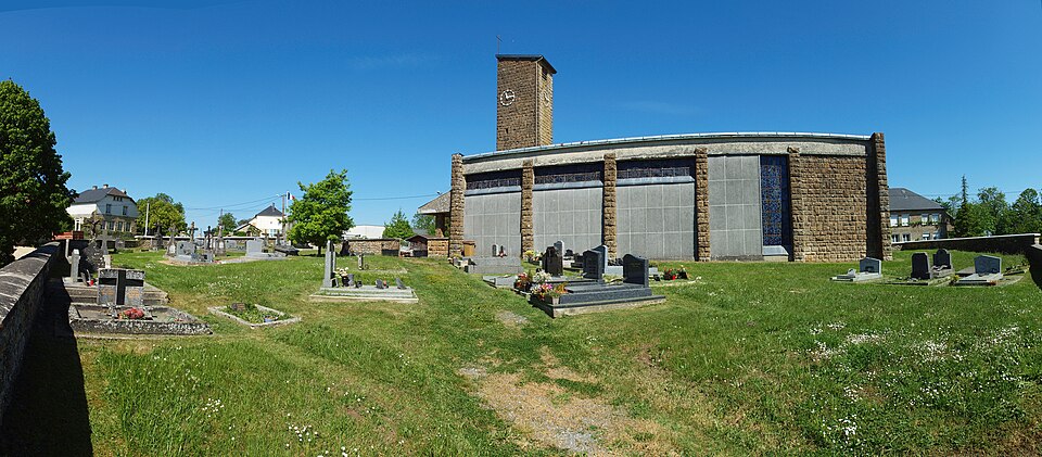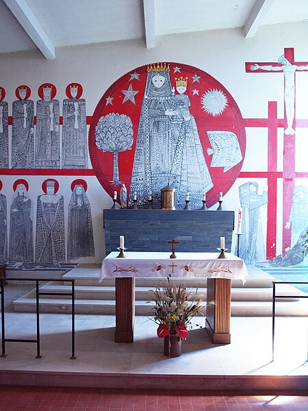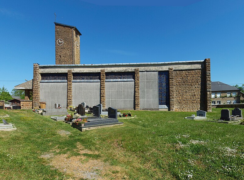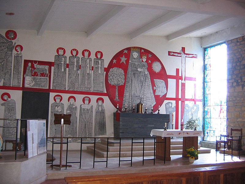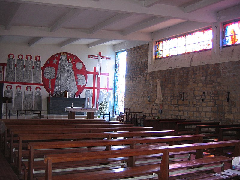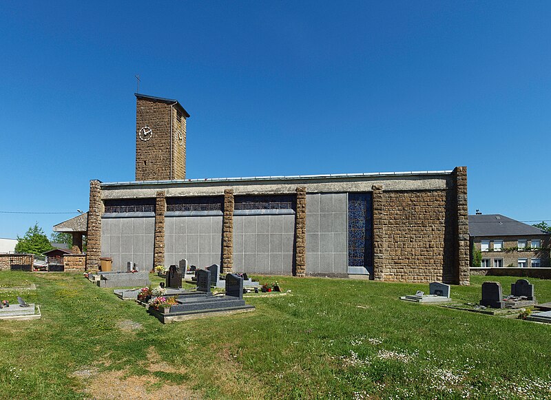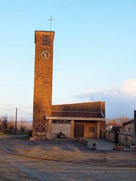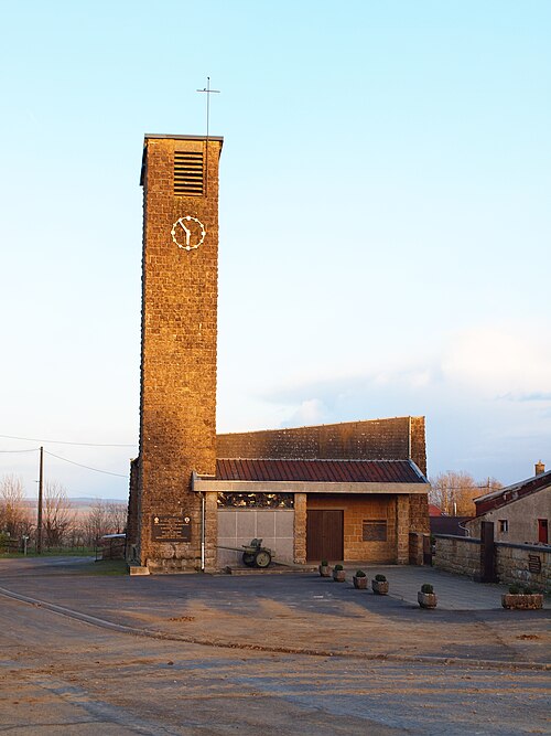 L'église Notre-Dame de Stonne, classée monument historique, se situe à la sortie ouest du village, le long de la D30 (rue du 15 mai 1940), et est entourée d'un cimetière. Une église antérieure, reconstruite en 1657 et édifiée en briques avec une nef charpentée flanquée de bas-côtés, avait été décrite comme comportant deux murs parallèles reposant sur des piles et cinq grandes arcades formant les travées ; le bas-côté nord avait disparu en 1817. Cet édifice ancien, fortement endommagé lors des combats de la bataille de Stonne en mai 1940, a été remplacé par une nouvelle construction élevée sur le même emplacement. Le permis de reconstruire a été délivré le 15 mars 1956 ; l'église actuelle, édifiée entre 1958 et 1960, a été inaugurée le 17 janvier 1960 et inscrite au titre des monuments historiques le 31 mars 2015. Le bâtiment reconstruit présente un plan rectangulaire simple : une nef unique sans bas-côtés et un chœur à fond plat inscrits dans le même rectangle. Les murs extérieurs, en béton et en moellons, forment un appareillage d'apparence rustique et la voûte est un plafond à caissons en béton armé blanchi, presque plat. À la façade occidentale s'appuie une haute tour-clocher de plan carré, où est installée une cloche, et un auvent protège la porte d'entrée. Le mur oriental, derrière l'autel, est couvert par une grande peinture murale de Maurice Calka réalisée en 1959 ; lumineuse, elle utilise essentiellement du blanc et du rouge avec des traits noirs et une décoration graphique tracée au crayon feutre. Cette fresque, illustrant le thème du « triomphe de la Vierge », déploie, de gauche à droite et de haut en bas, plusieurs scènes liées à la Vierge : l'Annonciation, la Visitation, la Nativité, la Présentation au Temple et, à l'extrémité droite, la Crucifixion. Avant la Crucifixion, la Vierge apparaît dans un disque rouge, portant l'Enfant sur son bras gauche et entourée de symboles des quatre éléments — l'air par le ciel, le feu par les étoiles, la terre par l'arbre et l'eau par le poisson. Les personnages sont représentés de face ou de profil, sauf la Nativité en vue plongeante, et les scènes encadrées en bandes peuvent évoquer des enluminures romanes ; l'œuvre témoigne d'une économie de moyens formant un graphisme géométrique proche d'un courant minimaliste et s'inscrit dans la création architecturale et artistique des églises françaises de la seconde moitié du XXe siècle. L'éclairage intérieur provient notamment de vitraux signés Robert Savary : une verrière latérale, figurant une colombe et des cloches, éclaire la fresque et peut évoquer Pâques ou la libération et la paix retrouvée, d'autres baies apportent la lumière par des verrières placées en hauteur sur le mur méridional sous le plafond et des baies verticales sur le mur septentrional. Un vitrail en hauteur illumine également les fonts baptismaux situés près de l'entrée.