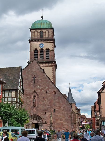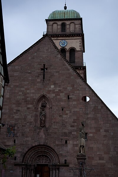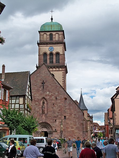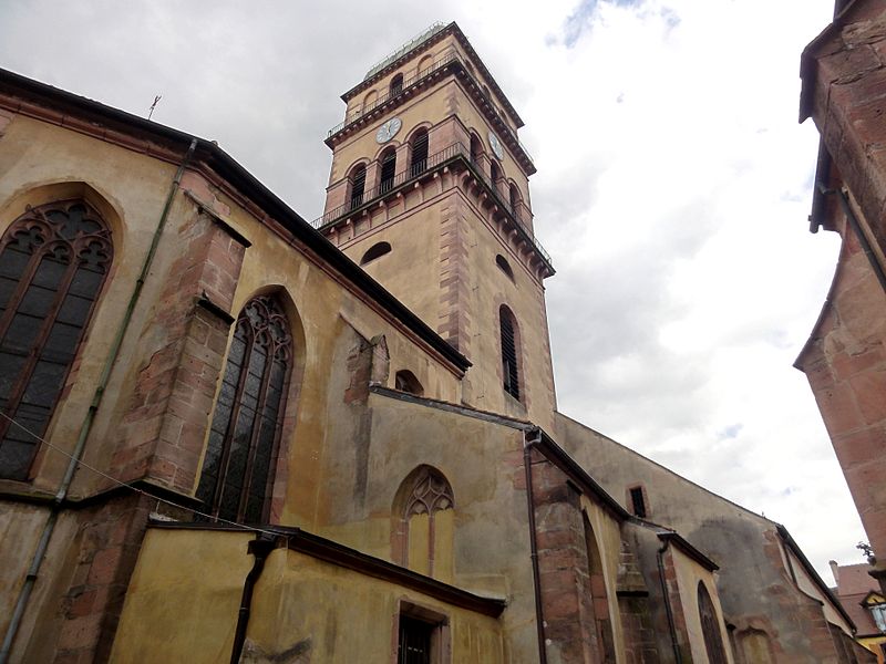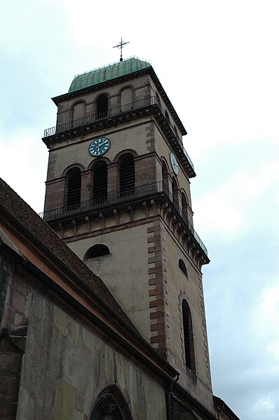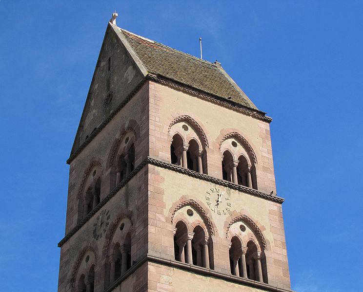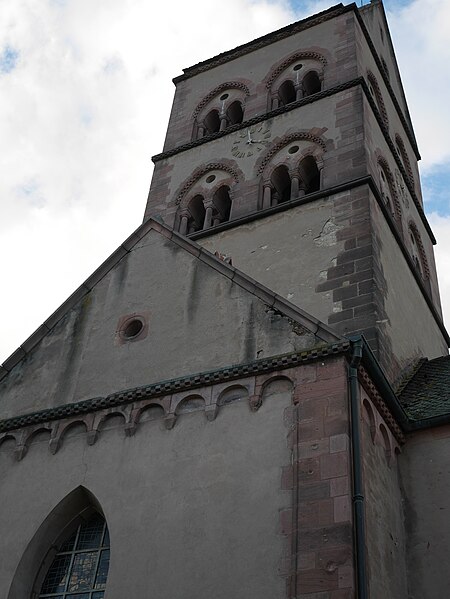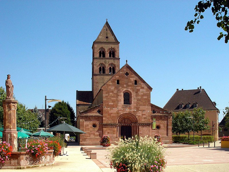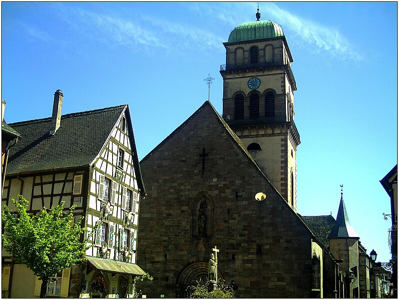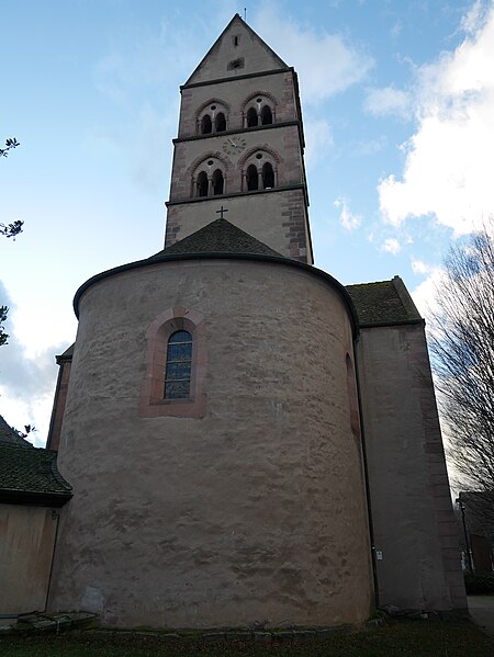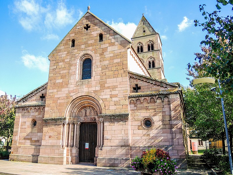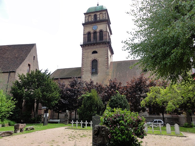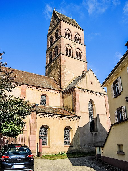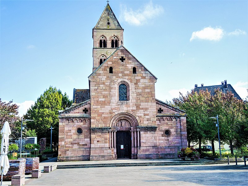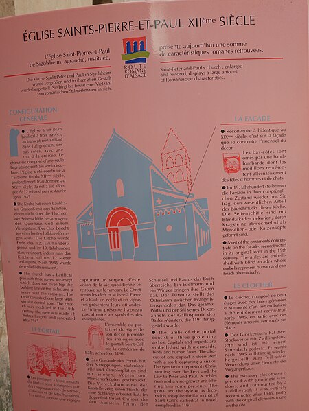 L'église Saint‑Pierre‑et‑Saint‑Paul est située place de l'Église à Sigolsheim, dans le Haut‑Rhin. Classée au titre des monuments historiques par arrêté du 1er octobre 1841, elle conserve des éléments romans associés à des réaménagements successifs. Une première église fondée par l'impératrice sainte Richarde en 880 fut remplacée par une paroissiale romane vers 1180‑1190, utilisant les fondations du chœur demi‑circulaire et peut‑être le mur oriental de la nef. Au XVe siècle, après un pillage et des destructions attribués au seigneur Jean Wild, la tour de croisée reçut des baies gothiques en arc brisé et une flèche remplaça la couverture antérieure. En 1837‑1838, l'architecte départemental Félix Griois allongea la nef vers l'ouest par deux travées, reconstruisit une travée simple et la façade occidentale à l'identique avec des matériaux d'origine; les escaliers en vis ne furent toutefois pas rétablis jusque sous le comble, les baies furent agrandies, la baie au‑dessus du portail reçut un réseau néo‑gothique abritant les statues de saint Pierre et de saint Paul, la porte du croisillon sud fut déplacée dans le bas‑côté sud et une nouvelle porte percée dans le bas‑côté nord. Selon les plans de Jean‑Baptiste Schacre, le chœur roman demi‑circulaire fut remplacé en 1865‑1866 par un chœur néo‑roman plus vaste, comportant une travée droite, une abside et une sacristie arrondie vers le sud; l'ensemble fut béni en 1866. En 1910‑1911, Klem fournit un mobilier liturgique neuf. Les bombardements de décembre 1944 endommagèrent gravement l'édifice et la tour fut incendiée la nuit de Noël. Restaurée dans les années 1950 par Charles‑Henri Arnhold, l'église a bénéficié d'une restitution volumétrique du chœur primitif sur des fondations carolingiennes ou ottoniennes mises au jour lors de fouilles, ainsi que de la restitution de l'élévation romane de la tour à partir de vestiges de baies du XIIe siècle partiellement conservés en place ou noyés dans la maçonnerie gothique des niveaux supérieurs. La flèche fut remplacée par un toit en bâtière et les croupes des bras du transept restaurées en pignons selon l'état antérieur à 1837. Orientée et entièrement voûtée, l'église présente une nef à trois vaisseaux (trois travées doubles et une travée simple), un transept non saillant avec tour de croisée et un chœur demi‑circulaire plus large que le vaisseau central. De grandes arcades alternent piles fortes et piles faibles et sont surmontées d'une frise de billettes; doubleaux, formerets et ogives retombent sur piédroits, dosserets et colonnettes dont certains chapiteaux sont sculptés d'aigles, notamment contre l'arc triomphal. Des ogives quadrangulaires apparaissent dans les bas‑côtés et des ogives à cavets dans la croisée, où elles retombent sur des chapiteaux sculptés de têtes; dans le comble du bas‑côté nord subsistent deux consoles à buste d'homme et à dragons ailés, le tympan de la porte murée nord du transept porte un décor gravé et les chapiteaux de la porte sud sont sculptés. Des frises d'arceaux ornent les élévations de la nef et du transept, et des consoles sculptées de têtes d'homme et de chat décorent la façade ouest; dans chaque face de la tour, aux deuxième et troisième étages, deux baies géminées sont encore visibles. Le portail concentre l'essentiel du décor : les chapiteaux des colonnettes de l'ébrasement présentent un bestiaire réel et fantastique dans une végétation luxuriante, le linteau porte cinq médaillons figurant l'agneau pascal entouré des symboles des évangélistes, et le tympan représente le Christ remettant la clef à saint Pierre et le livre à saint Paul, encadré par deux donateurs, l'un offrant une bourse et l'autre un fût de vin.