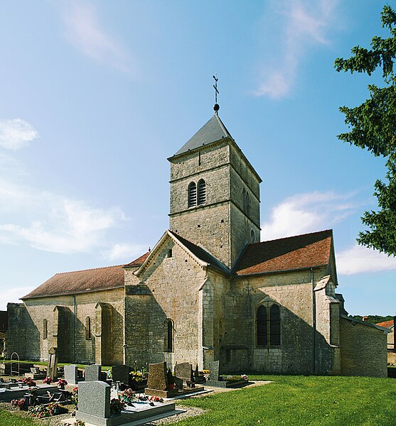 L'édifice adopte un plan en croix latine et est bâti en pierre de taille et moellons, couvert de toits en pavillon à longs pans et d'un pignon couvert. Il présente une nef unique de trois travées voûtées d'ogives, des chapelles orientées dans chaque bras du transept et un chevet à fond plat percé d'un oculus et d'une rosace. Le clocher, carré et massif, s'élève à la croisée du transept ; chaque face est percée de deux archères et un escalier à vis est visible hors œuvre. On note également la présence de l'enclos paroissial du côté nord‑ouest.