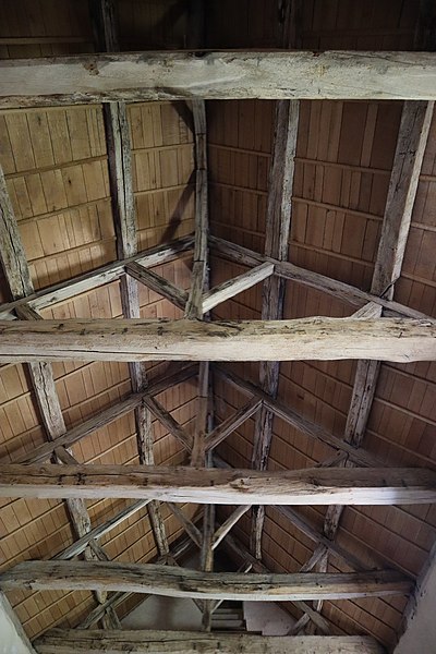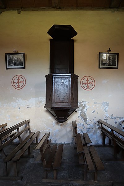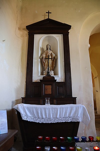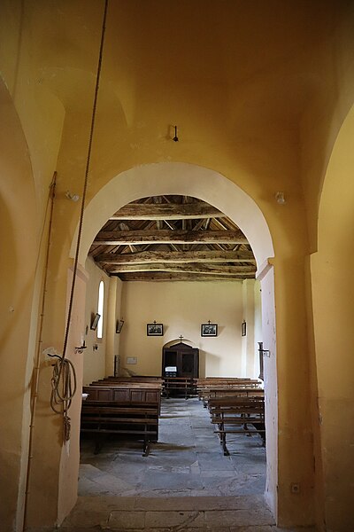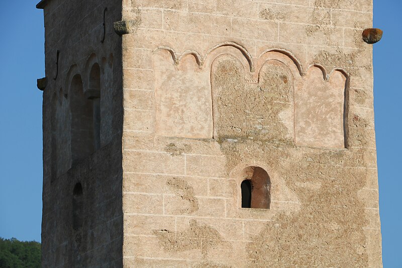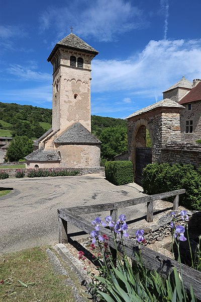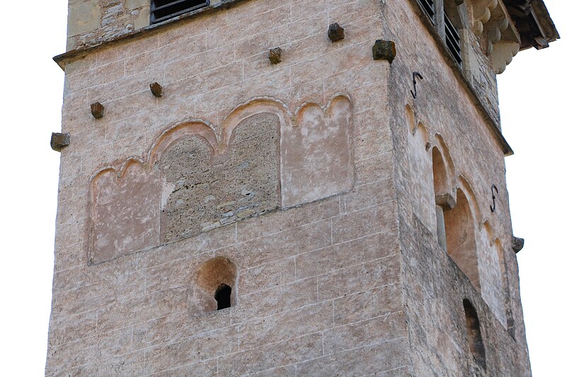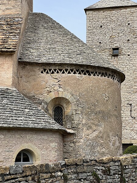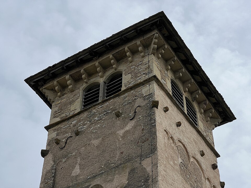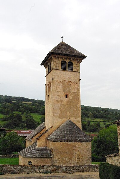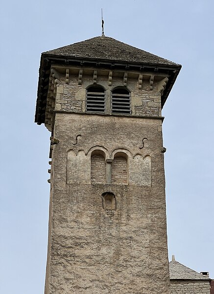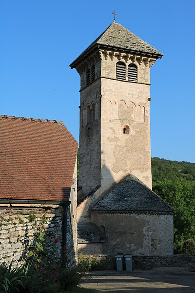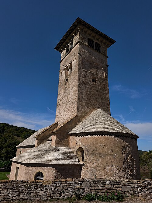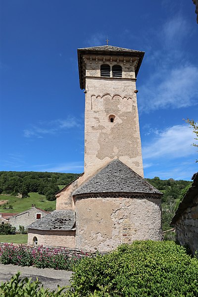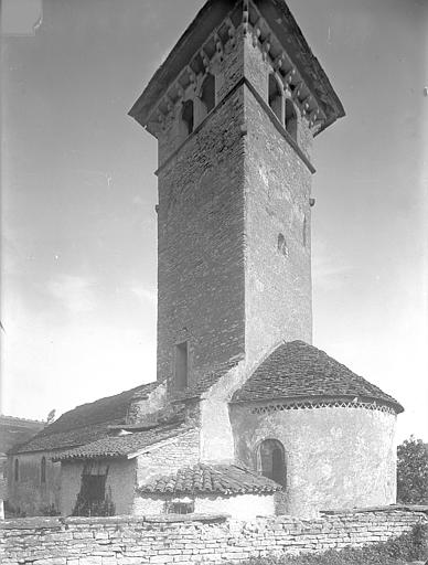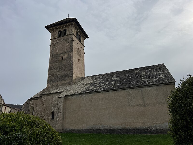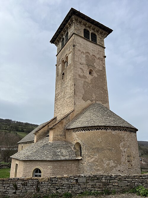 L'édifice est enduit et couvert de lauzes ; son chevet roman présente une abside semi‑circulaire ornée d'une frise en dents de scie sous la corniche. La travée de chœur est surmontée d'un clocher carré dont l'avant‑dernier niveau est percé de paires de baies géminées séparées par des colonnettes et insérées dans un décor de bandes lombardes ; le dernier registre, séparé par un cordon, comporte également des baies géminées avec abat‑sons et une corniche saillante portée par des modillons à copeaux. La couverture débordante du clocher date du XVIIIe siècle.