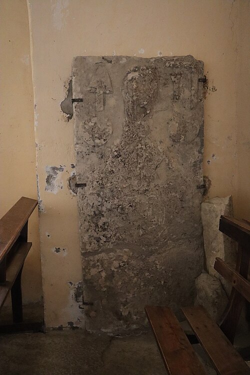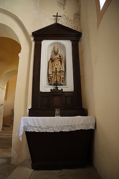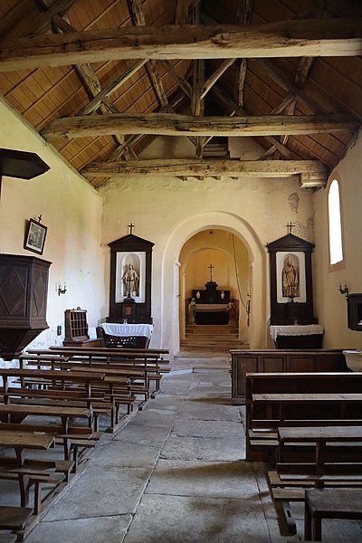 Le mobilier liturgique associe des éléments d'époques différentes : l'autel principal, en bois sculpté et ciré d'époque Louis‑XV, est entouré d'un ensemble en chêne du XIXe siècle comprenant petits autels latéraux à niches et une chaire hexagonale à panneaux lambrissés. La table d'autel, surmontée d'un retable à niche avec pilastres cannelés et fronton triangulaire, comporte un tabernacle et un gradin porte‑cierges. Le mobilier de la nef, également du XIXe siècle, comprend un confessionnal, quatre tableaux et deux statues en bois doré dans les niches des autels latéraux : Notre‑Dame à gauche et saint Martin évêque à droite. À l'angle sud‑ouest de la nef se trouve la « pierre du Compagnon », dalle de 1,76 m × 0,81 m découverte vers 1960 par Maurice Bonnefoy dans l'ancien mur de clôture du cimetière ; elle porte la gravure d'un buste avec une croix et plusieurs outils et rappelle par tradition la mémoire d'un ouvrier mort accidentellement lors de la construction.