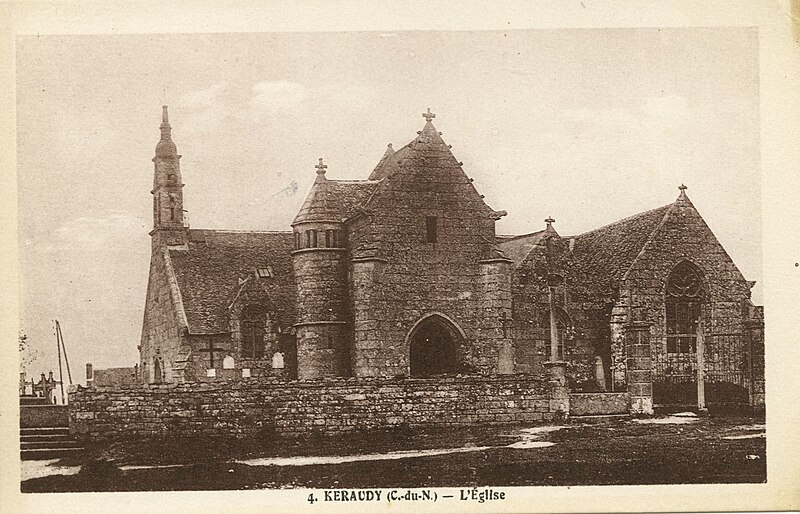 L'église de Kéraudy, située à Ploumilliau dans les Côtes-d'Armor (Bretagne), est une chapelle de secours desservant le village. L'édifice en granite date des XVe et XVIe siècles et est représentatif des petites églises bretonnes de cette période. Il présente des pignons, un porche, des escaliers et un transept qui se confond avec un chevet plat. La porte sous le porche conserve sa menuiserie ancienne, et l'intérieur abrite une tribune en bois sculpté. Des fragments de vitraux anciens subsistent dans la baie centrale du chevet et dans celle du transept sud ; le fragment principal représente la Vierge et l'Enfant sous un dais architectural et remonte au XVe siècle. L'église est classée au titre des monuments historiques par arrêté du 16 janvier 1935. Elle est documentée dans plusieurs ressources patrimoniales et inventaires, notamment Inventaire Bretagne, Mérimée et l'Observatoire du patrimoine religieux.