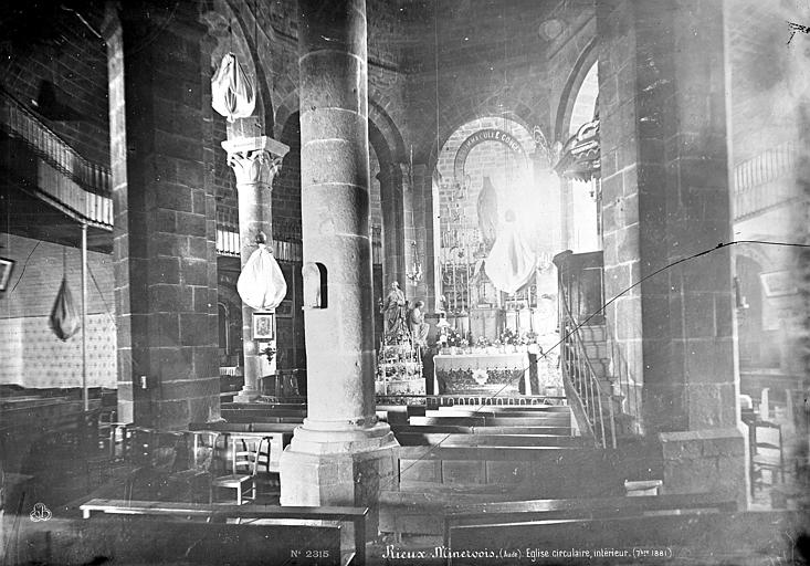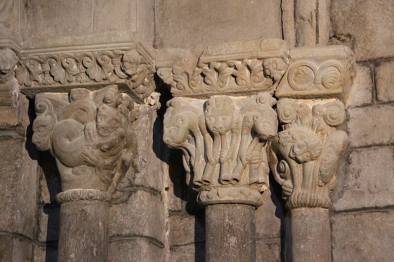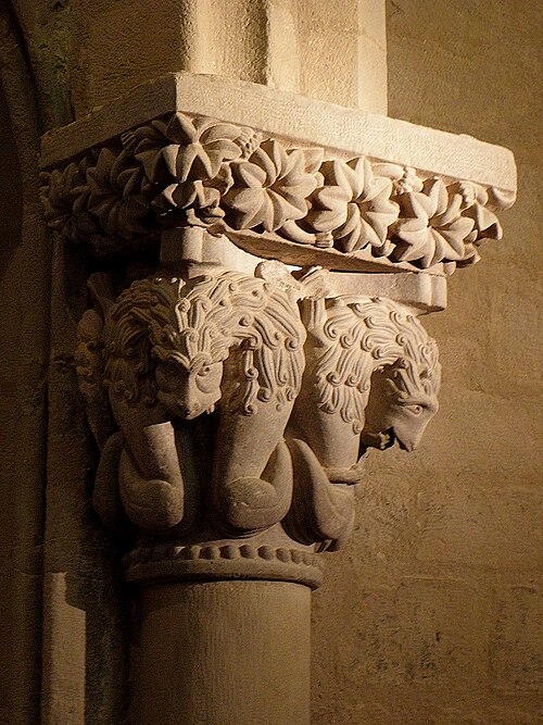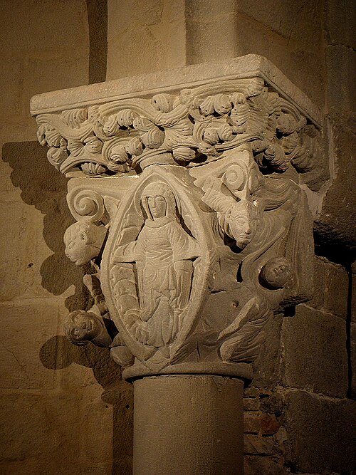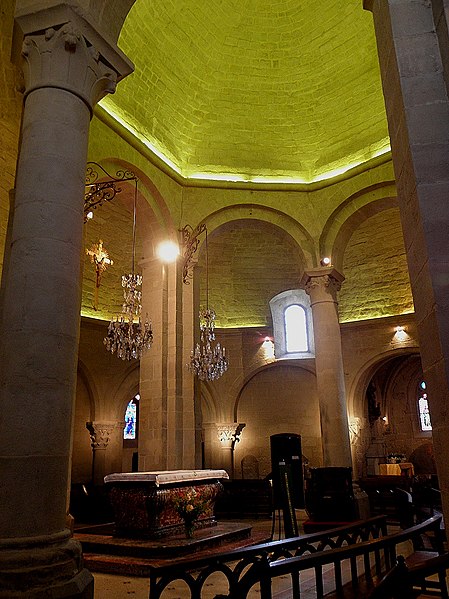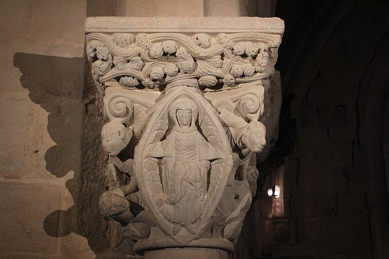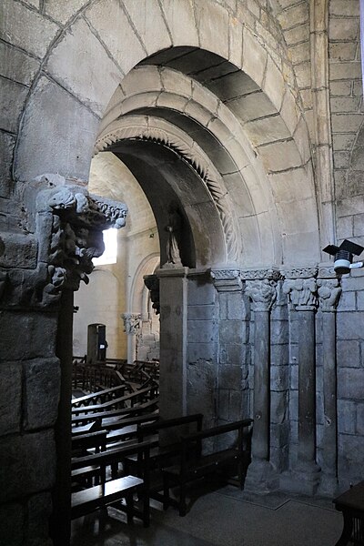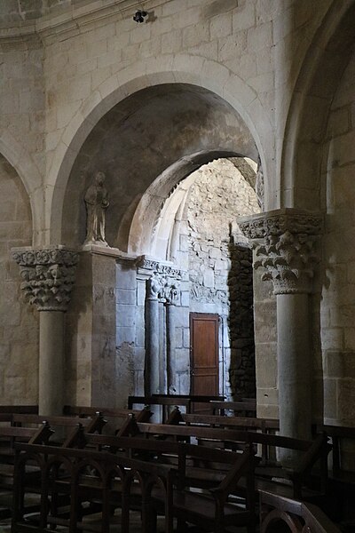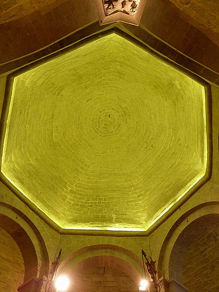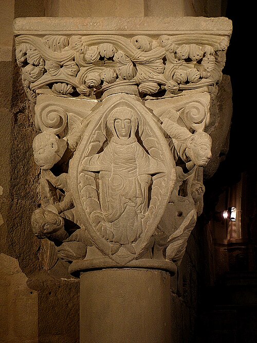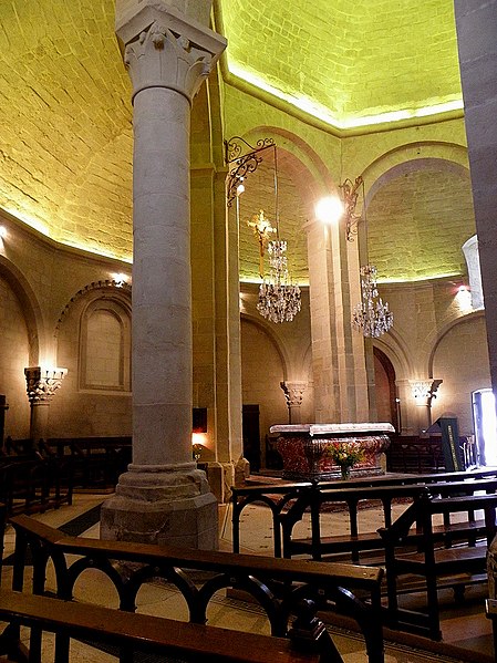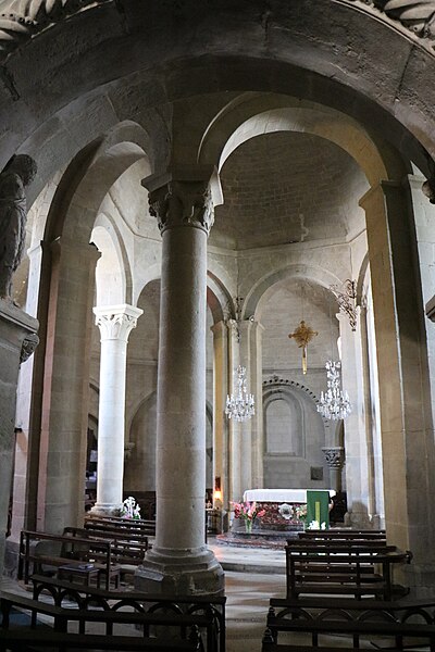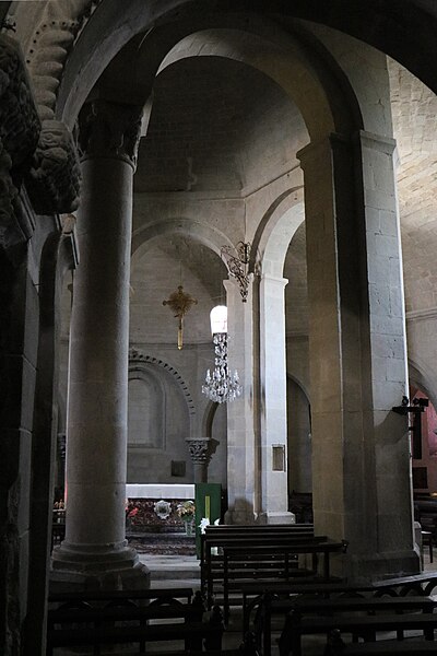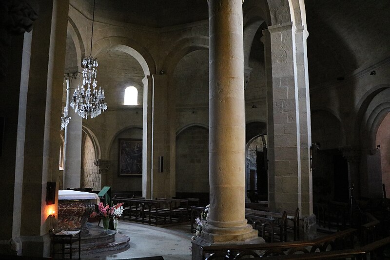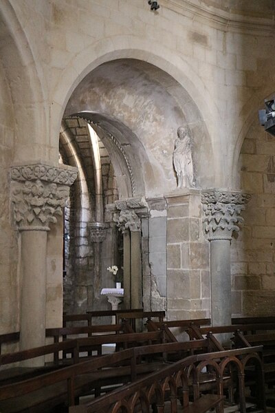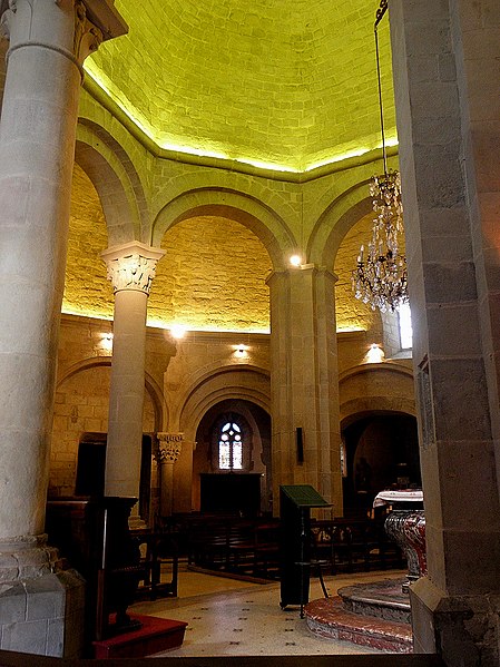 Sur le plan architectural, l'église appartient au groupe des rotondes à collatéral circulaire, comparable à des édifices tels que l'église du Saint-Sépulcre de Jérusalem, Saint-Vital de Ravenne, la chapelle palatine d'Aix-la-Chapelle, Saint-Bénigne de Dijon, l'église de Neuvy-Saint-Sépulchre ou l'abbatiale de Charroux. Elle est conçue selon un plan centré : une rotonde centrale heptagonale couverte d'une coupole à sept pans est entourée d'un déambulatoire à quatorze côtés ; la poussée de la coupole est contrebutée par une voûte en quart de cercle qui couvre le déambulatoire. Cette forme heptagonale, singulière, est présentée comme unique au monde, le chiffre sept étant mis en relation ici avec la sagesse divine et la Vierge Marie. Parmi les sculptures de l'église figure une mandorle représentant l'Assomption de la Vierge, attribuée au Maître de Cabestany, et l'intérieur conserve divers chapiteaux et motifs sculptés — chapiteau de l'Assomption attribué au maître de Cabestany, détails de ce chapiteau, un lion, des chapiteaux situés à droite de l'ancien portail et un chapiteau du portail sud orné d'oiseaux.