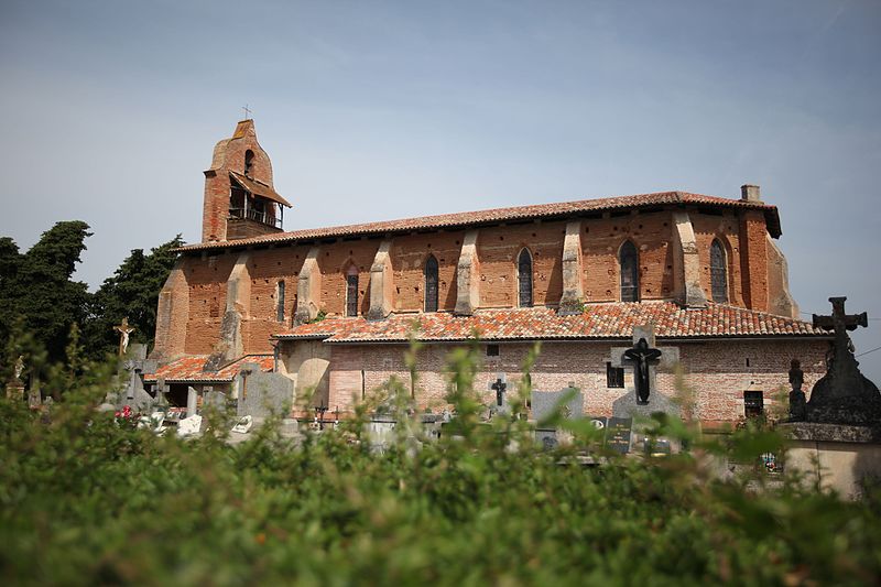 Une église existait au même emplacement dès le XIe siècle. Elle fut démolie pendant les guerres de Guyenne puis reconstruite au XVe siècle par l'abbaye de Mas Grenier, avec le concours de l'abbaye de Grand Selves. Les Protestants incendièrent l'édifice sans le démolir. Située en plein cœur du village avant la guerre de Cent Ans, l'église se trouve aujourd'hui isolée. L'édifice présente un plan rectangulaire soutenu par une série de gros contreforts entre lesquels s'ouvrent de petites chapelles latérales. La sacristie et ces chapelles sont probablement postérieures à la construction principale. La porte d'entrée est percée dans un mur-clocher à la silhouette particulière. Une colonne à chapiteau sculpté flanquait autrefois chaque côté du portail ; il n'en subsiste qu'une. La décoration intérieure est composée de panneaux de bois sculptés et peints, d'influence baroque.