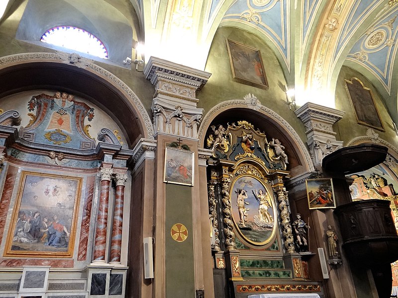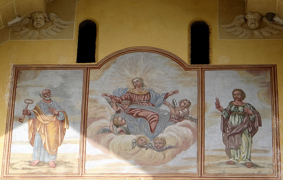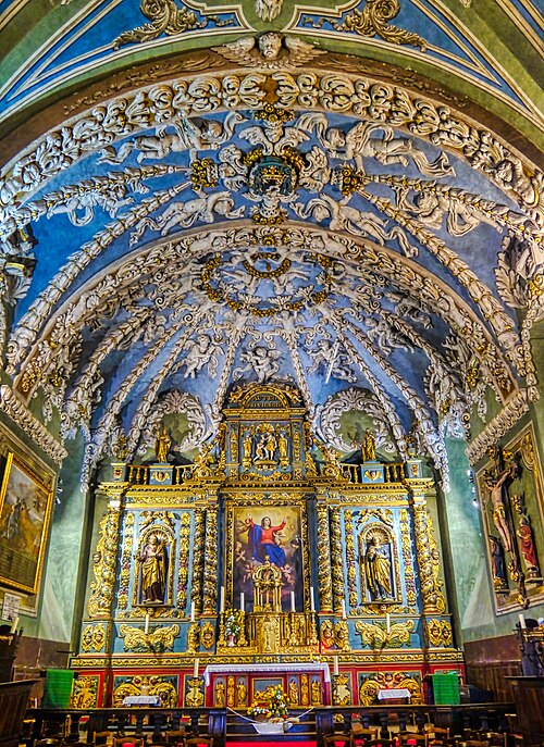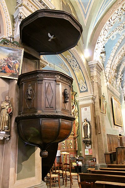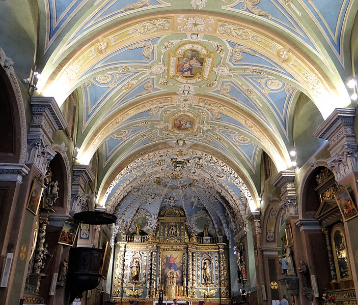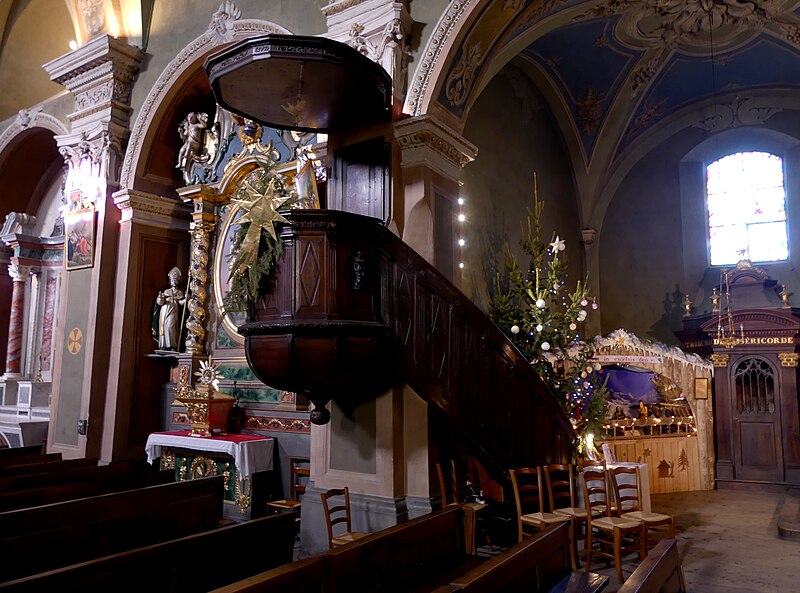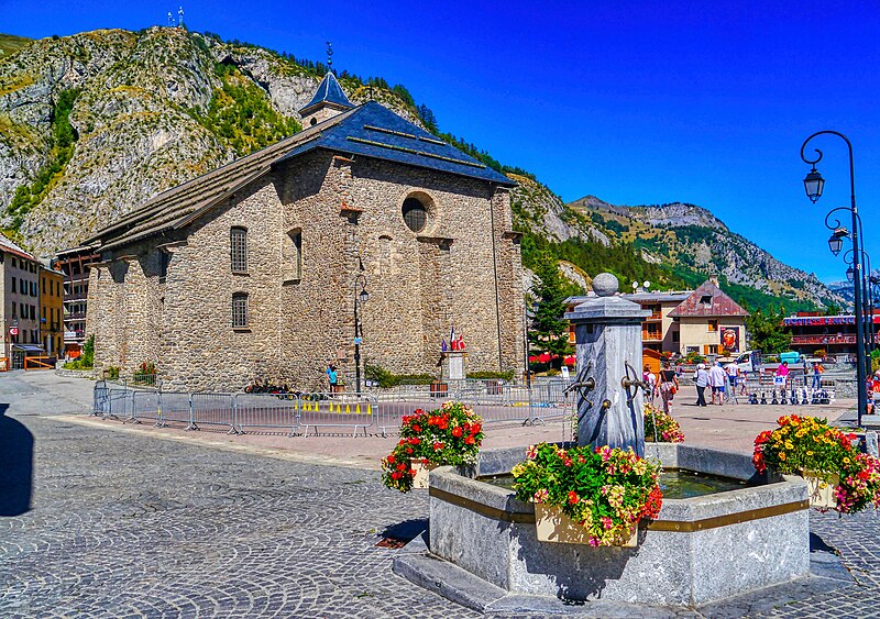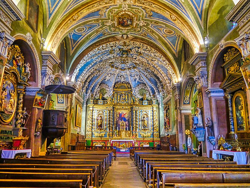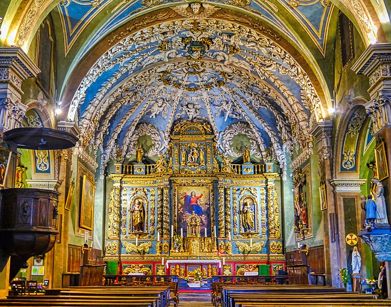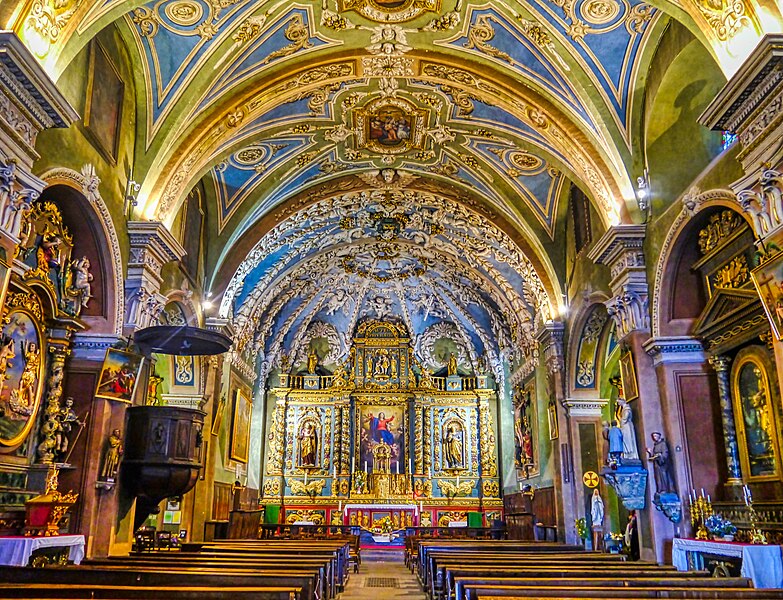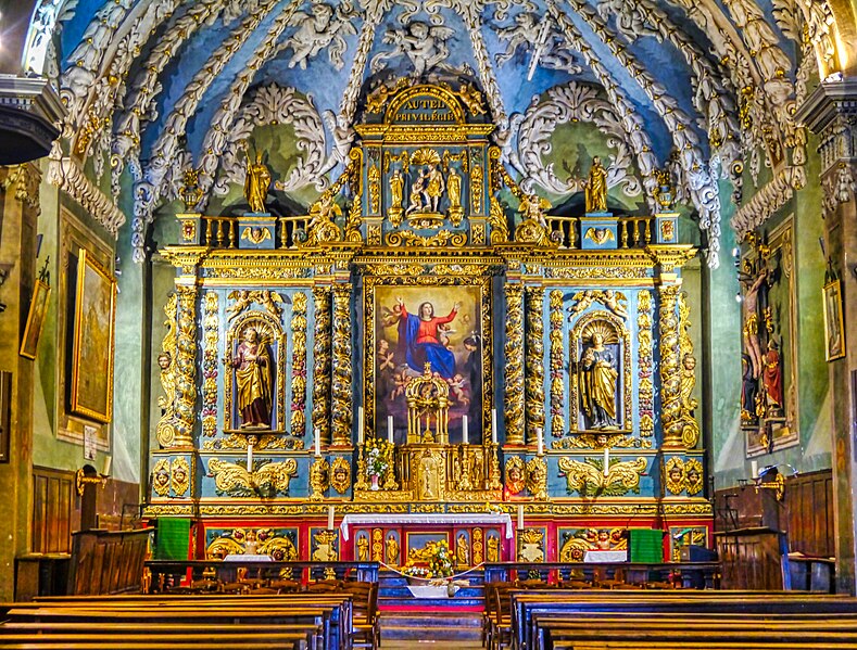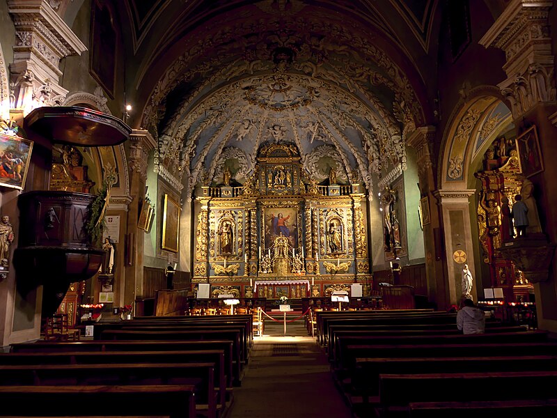 L’église Notre‑Dame de l’Assomption, située à Valloire en Savoie, est classée au titre des monuments historiques depuis le 20 septembre 1945. Le village de Valloire est mentionné dès 1038, selon Samuel Guichenon et Joseph‑Antoine Besson ; la tradition attribue à une première église une dédicace à saint Pierre, sans preuve documentaire, et aucune source n’indique quand l’édifice est devenu paroissial. Au début du XVIIe siècle, l’église paraît devenue trop petite ; l’évêque de Saint‑Jean‑de‑Maurienne, Monseigneur Milliet (1609), puis son successeur Charles Bobba (1622), ordonnent son agrandissement et donnent finalement le choix de la reconstruire. Un projet se construit entre 1623 et 1640, et la tradition rapporte que chaque paroissien apportait une pierre à la messe et formait parfois une chaîne pour les déplacer ; les travaux débutent en 1660. Les travaux sont dirigés par le père Dupré pour la période 1639–1682, puis, à partir de 1679, par le révérend Bertrand Martin. L’édifice est conçu dans un style baroque et consacré le 22 juillet 1682 par l’évêque Hercule Berzet (Berzetti). Des campagnes de restauration ont concerné la façade, les autels et les tableaux au cours des années 2000 et en 2006. L’église présente une nef unique avec un transept bas en forme de croix latine, construite en pierre grise locale ; elle comporte huit autels latéraux et un chœur dont le maître‑autel s’organise autour d’un triptyque. La façade comporte un portail orné et une porte sculptée riche en détails. Le chœur, à fond plat, est voûté en cul‑de‑four polygonal. Le retable majeur, réalisé en 1673 par l’artiste François Rymellin et restauré en 1852, est en noyer et s’articule autour de six colonnes torses ; deux statues en bois polychrome d’environ deux mètres, saint Pierre à gauche et sainte Thècle à droite, flanquent le tabernacle. Sainte Thècle, sainte locale attribuée à la fin du Ve‑début du VIe siècle, est représentée portant deux doigts reliquaires de Jean‑Baptiste qu’elle aurait rapportés d’un pèlerinage en Terre Sainte. La nef est couverte d’un plan voûté d’arêtes avec doubleau séparatif et cartouche sommital. Les huit autels latéraux sont respectivement dédiés à saint Sébastien (le plus ancien), saint Antoine, le Rosaire, le Sacré‑Cœur, Notre‑Dame du Sacré‑Cœur associé à saint François de Sales — ce dernier étant surmonté d’un tableau de Dufour représentant le couronnement de la Vierge (1682) —, sainte Philomène, saint Joseph et la Vierge. Les armes de Monseigneur Hercule Berzetti, « coupé de sable et d’argent, au lion de l’un en l’autre », ont été peintes sur le plafond. L’ensemble du retable a été réalisé par François Rymellin, originaire de Durbach (Bade) et fils du sculpteur Louis Rymellin installé à Chambéry ; son nom a été découvert aux Archives départementales de la Savoie en mars 1989. Rymellin resta plus de onze ans à Valloire et son fils Charles‑François y reçut le baptême ; en 1678 il fit appel aux stucateurs Louis Gavy et Dominique Crotex et à leurs aides pour exécuter les différentes gypseries.