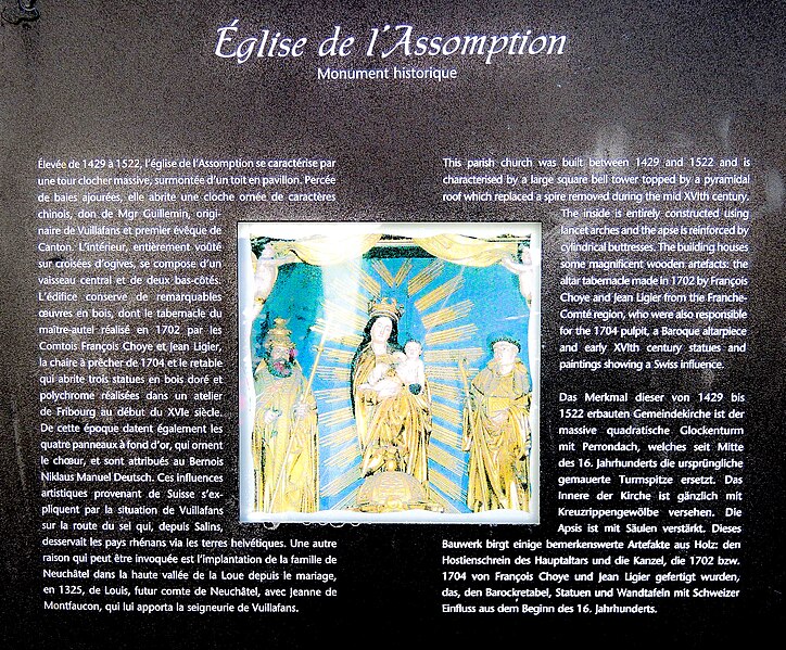 L'église de l'Assomption de Vuillafans, dans le Doubs, est dédiée à l'Assomption. Sa construction commence en 1429 et s'achève avec sa consécration en 1522. En 1550, la flèche en maçonnerie est remplacée par un toit en pavillon. Les dates portées au-dessus de la porte d'entrée (1828) et au chevet (1837) correspondent vraisemblablement à des campagnes de restauration. L'édifice est inscrit au titre des monuments historiques depuis le 20 novembre 1939. Appartenant à la paroisse de la Haute-Vallée de la Loue (Ornans), l'église dépend du diocèse de Besançon. Architectoniquement, elle présente un clocher-porche coiffé d'un toit à pavillon et percé de baies ajourées; la nef centrale, flanquée de deux bas-côtés, est couverte de voûtes en ogive. Le mobilier présente une influence suisse ou rhénane, expliquée soit par la situation de Vuillafans sur la route du sel reliant Salins aux pays rhénans via les terres helvétiques, soit par la possession médiévale du village par la famille de Neuchâtel via Isabelle de Neuchâtel. Plusieurs éléments mobiliers sont protégés au titre des objets des monuments historiques : le retable de 1702 sculpté en chêne par François Choye, encadré de deux colonnes torses et représentant le Calvaire et l'Annonciation, et la chaire à prêcher de 1704 attribuée à J. Ligier, tous deux classés le 5 décembre 1908; un tableau de la Nativité daté d'environ 1515, attribué à un peintre de l'école suisse, classé le 24 mai 1943; enfin trois tableaux datant d'environ 1515 — La Cène, le Calvaire et Saint Benoît — également attribués à un peintre de l'école suisse et classés le 24 avril 1944.