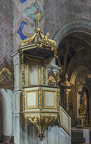 Datée de la première moitié du XVIe siècle, l'église se compose de deux nefs distinctes séparées par des piliers cylindriques.