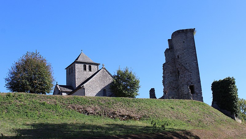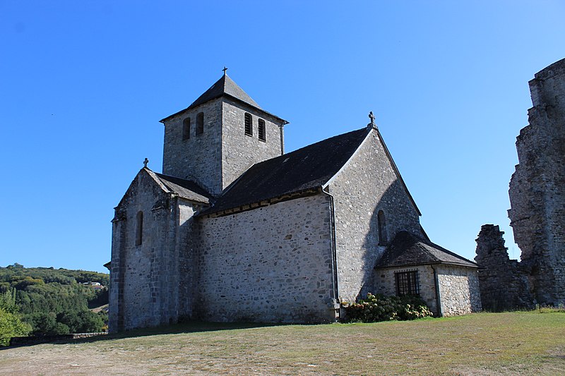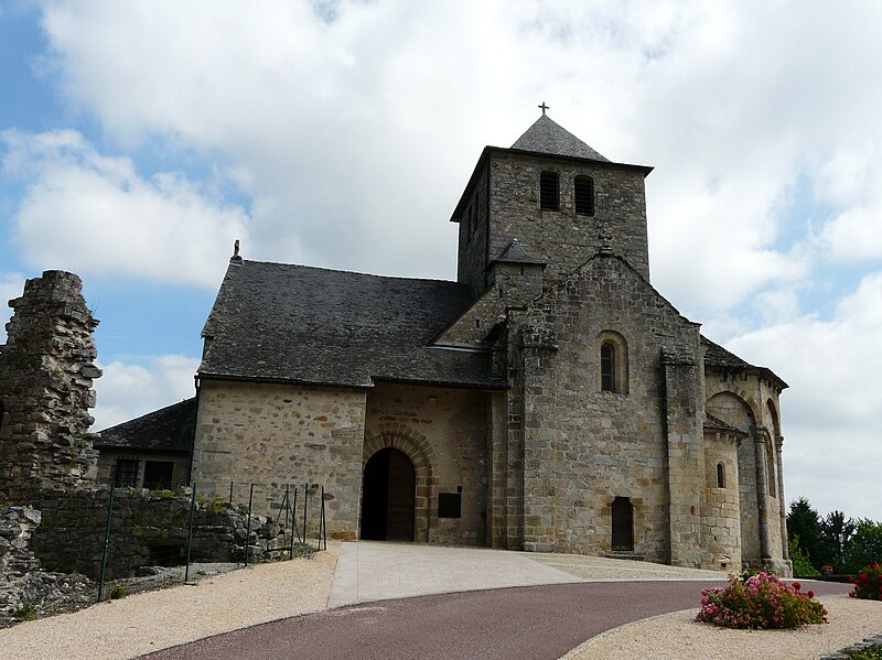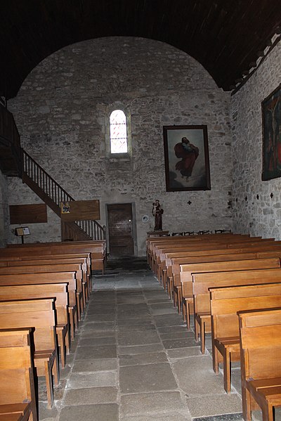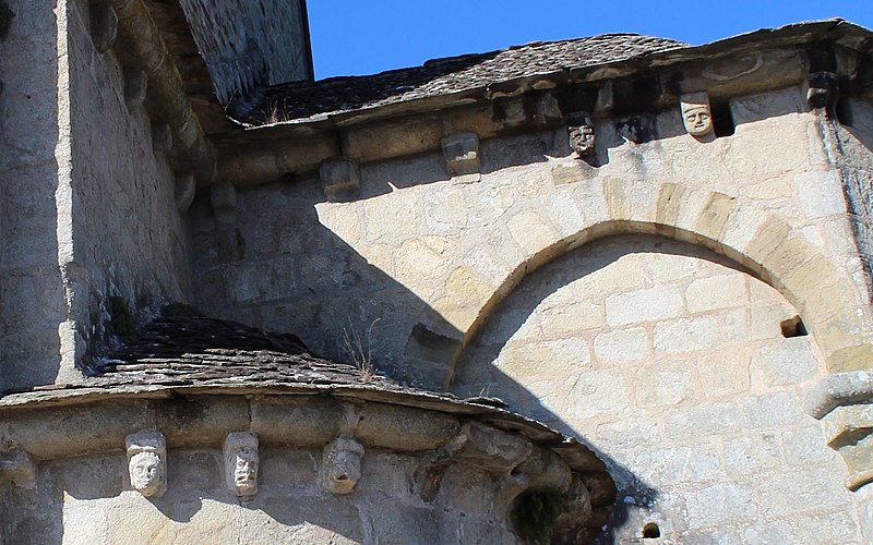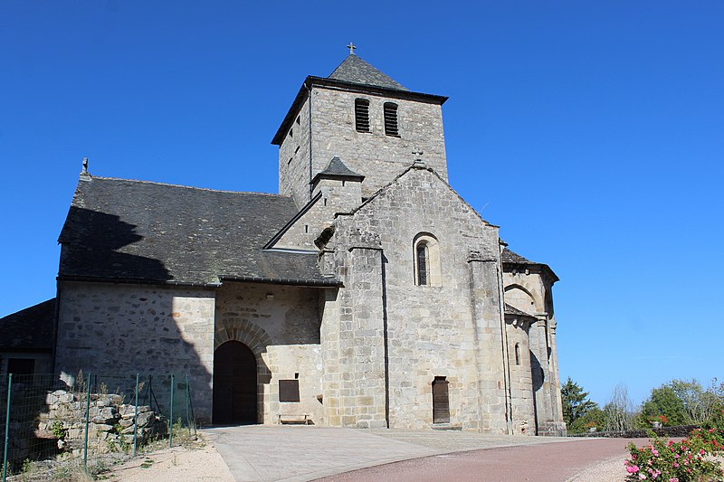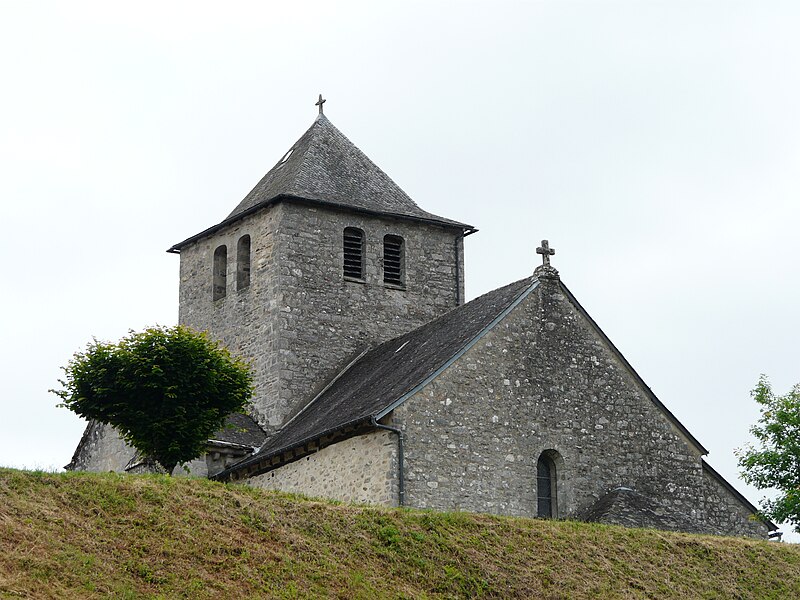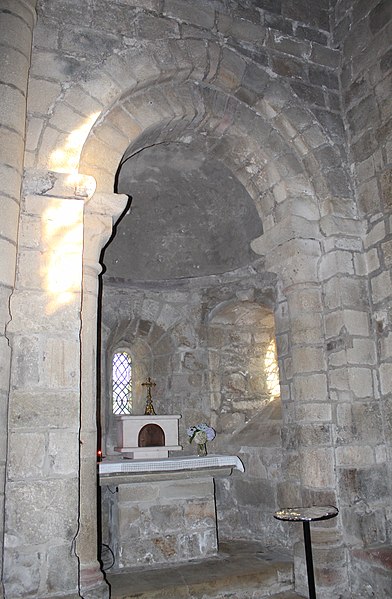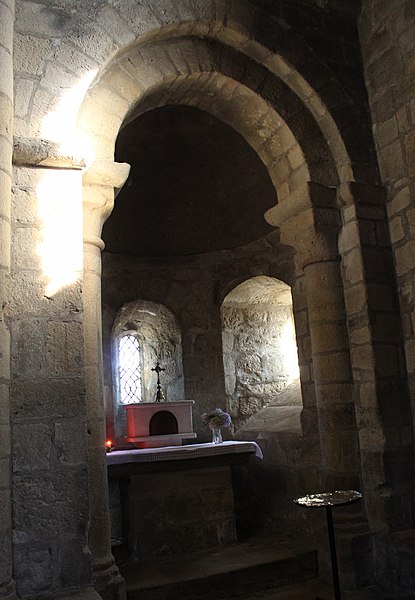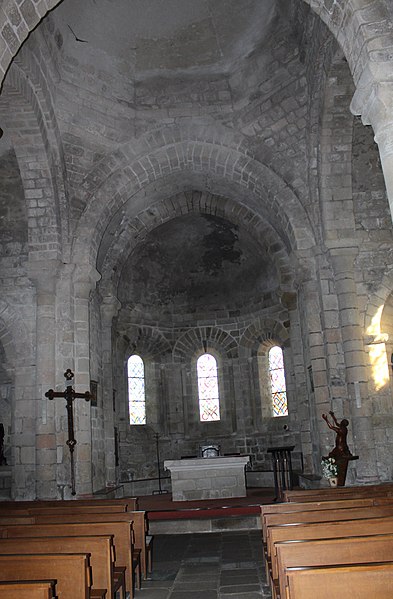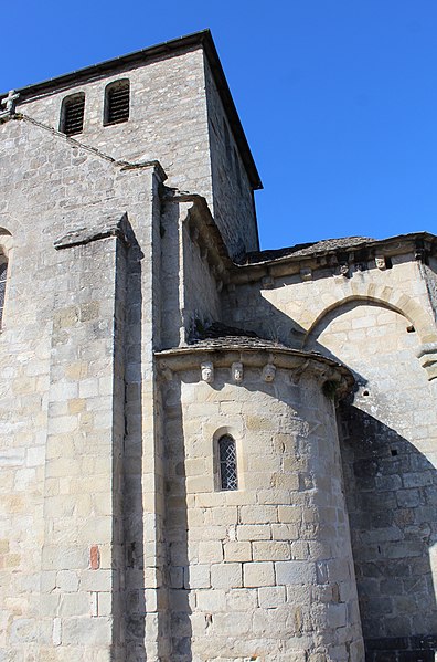 Église romane présentant un transept flanqué d'absidioles et un clocher carré posé sur une coupole. L'abside, à pans coupés, voit ses angles ornés de colonnettes surmontées de chapiteaux.