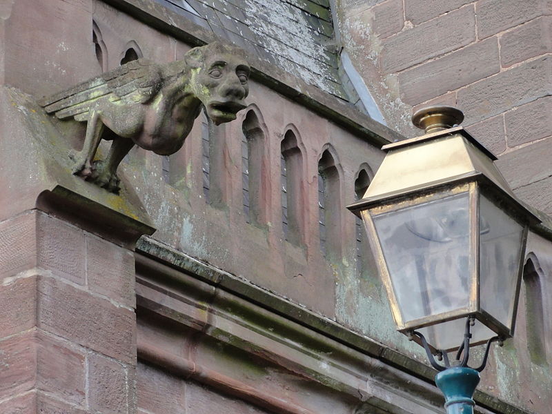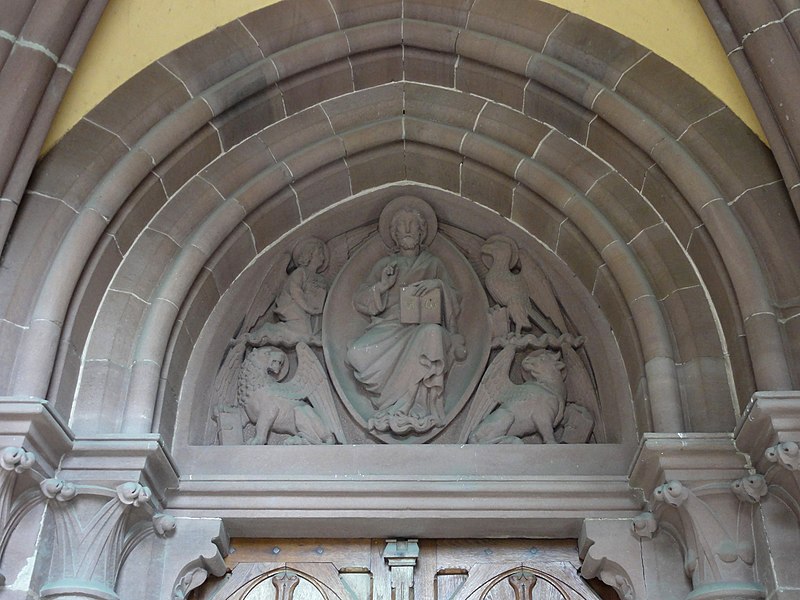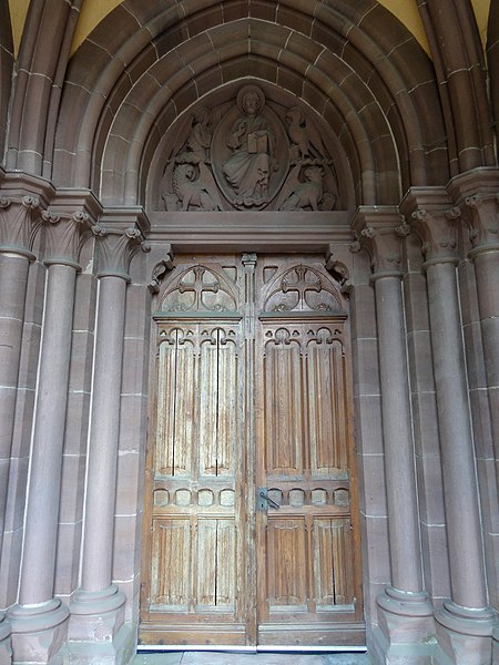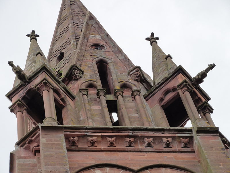 Orientée nord-sud, l'église est précédée d'un porche à trois travées voûtées d'ogives ; les portails en arc brisé sont surmontés de gâbles et l'arc central porte une statue d'ange. Le tympan de la porte ouvrant sur la nef est sculpté d'un relief représentant le Christ et le tétramorphe. Le clocher en pierre de taille est coiffé d'une flèche et orné de dais, de gâbles et de gargouilles. La nef compte quatre travées en moellons enduits, éclairées par deux niveaux de fenêtres : des lancettes à l'étage inférieur et des doubles lancettes avec trilobes au niveau supérieur ; il n'y a pas de transept. La façade nord présente deux tourelles d'escalier aux angles nord-est et nord-ouest, contenant des escaliers à vis. Le chœur, peu profond, est voûté à la croisée d'ogives et percé de cinq hautes baies. À l'intérieur, le vaisseau central voûté d'ogives est flanqué de tribunes au-dessus de passages latéraux couverts de voûtes en berceau surbaissé ; entre les travées se succèdent des arcs trilobés. Piliers, arcs et nervures des voûtes sont en grès sculpté ; les clés de voûte portent des rosaces et les chapiteaux sont à crochets. Les garde-corps des tribunes sont en tôle découpée, à l'exception de la tribune d'orgue qui a un garde-corps en bois.
