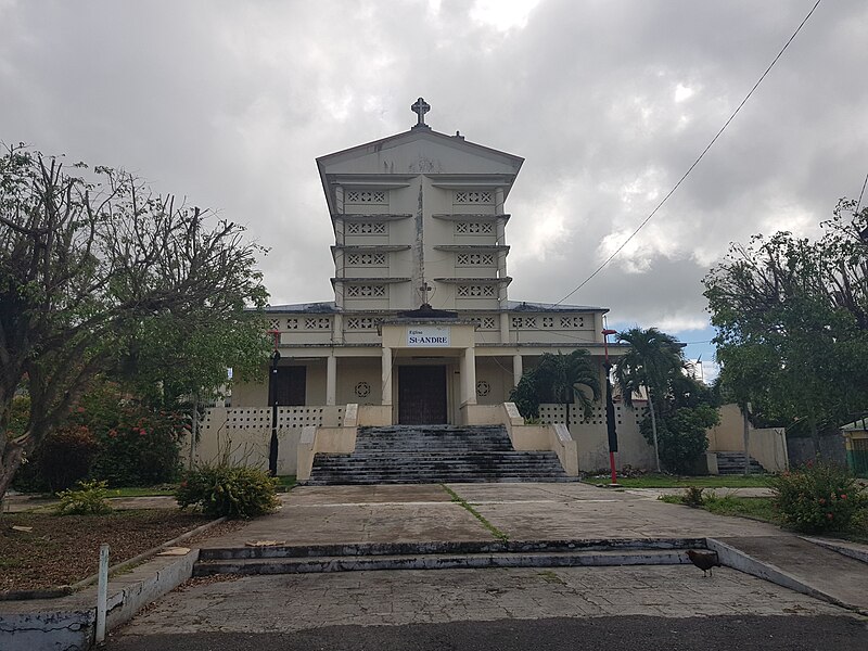 L'église paroissiale Saint-André, dédiée à l'apôtre André et rattachée au diocèse de Basse-Terre et Pointe-à-Pitre, se situe à Morne-à-l'Eau en Guadeloupe. Elle a été reconstruite de 1930 à 1933 sur les ruines de la chapelle détruite par le cyclone du 12 septembre 1928, d'après les plans de l'architecte parisien Ali Tur (1889-1977), chargé par l'État de la reconstruction de l'île. Entre 1930 et 1936, Ali Tur et son agence réalisèrent cent vingt édifices, dont cinq églises ; l'église Saint-André est la première qu'il construisit en Guadeloupe. L'architecte, l'un des intervenants du ministère des Colonies, dirigea des travaux pour des édifices gouvernementaux et de nombreux bâtiments communaux. Il opta pour le béton, matériau alors peu employé, dont l'usage contribua au déclin des constructions en bois. L'édifice, adjudiqué le 26 juillet 1930 pour 1 800 000 francs, adopte un plan basilical sans transept ; la nef, organisée en trois travées, présente un vaisseau central haut de 13 mètres. De grandes baies verticales assurent éclairage et ventilation ; elles étaient autrefois fermées par des lames verticales créant des contrastes de lumière. Des claustras moulés en béton ferment les murs de la tribune et le plafond de la nef, protégés par des lames de béton pour limiter l'ensoleillement et les intempéries ; ces dispositifs remplacent les vitraux et permettent des effets de clair-obscur. Le narthex, formé d'une galerie couverte à caissons débordante, s'ouvre via une double volée d'escalier à grand emmarchement. L'église domine un parvis sur lequel s'ouvre le presbytère, également dessiné par Ali Tur. Le clocher-campanile, prévu dès les plans pour être détaché du corps de l'église, fut finalement érigé derrière l'abside ; ajouré de claustras verticaux, il est surmonté d'une croix pattée et porte une horloge. On note l'influence indirecte des travaux d'Auguste Perret, notamment de l'église Notre-Dame du Raincy, dans le soin apporté à l'entrée de la lumière et aux ornements. L'édifice a été inscrit au titre des monuments historiques en 1992, classé en 2017, a reçu le label « Patrimoine du XXe siècle » et a bénéficié en 2019 de financements dans le cadre du second Loto du patrimoine ; le clocher a par ailleurs fait l'objet d'une restauration en 2020 grâce à ces soutiens.