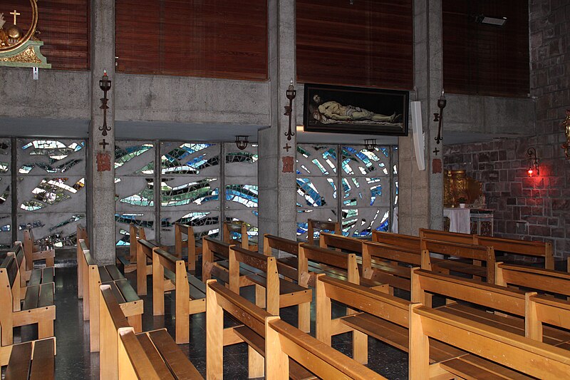 L'église de Capvern-les-Bains forme un pont au‑dessus d'un vallon et assure un passage entre les deux versants de la vallée. Sa construction s'inscrit dans un projet de "centre civique" comprenant le marché municipal et le bureau des postes. L'édifice illustre une architecture typique des années 1960, avec une structure en béton armé à la finition brute, des vitraux non figuratifs intégrés dans une résille de béton et un mobilier d'époque. Il remplace une ancienne chapelle devenue trop petite, implantée en bas de la rue des Thermes, près de la buvette‑promenoir. L'architecte toulousain Paul de Noyers a profité du comblement du ruisseau par la nouvelle rue Jean‑Paul‑Thaillade pour développer l'église en pont au‑dessus de cette voie. Les vitraux sont signés du peintre Bruno Schmeltz. L'espace situé sous l'édifice semble avoir servi de marché couvert.