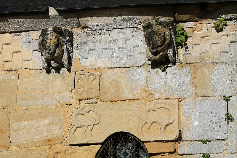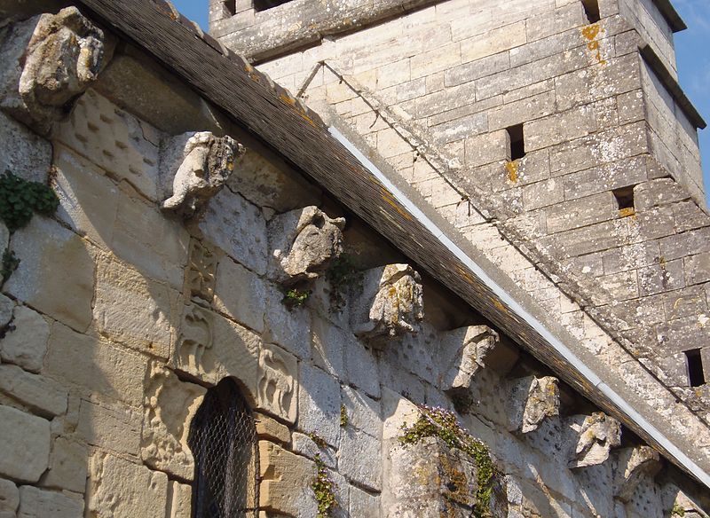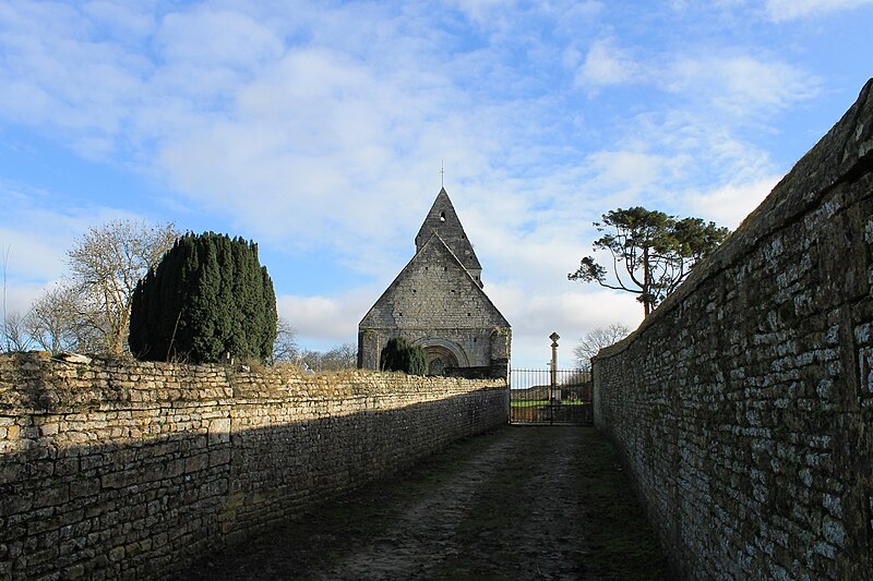 La façade présente un pignon découvert et un tympan aveugle encadré par une archivolte à double rouleau. La nef est éclairée par de petites baies étroites et le mur sud conserve huit modillons romans, posés sur une frise en damier comparable à celle de l'église de Thaon ; le linteau d'une baie est décoré d'animaux se mordant la queue. Le mur nord, très remanié, montre des pierres de réemploi provenant notamment de la frise disparue. Le portail ouest, principal accès à la nef, s'ouvre sous une voûte en plein cintre ornée de deux archivoltes et d'une cimaise à rangées de billettes.