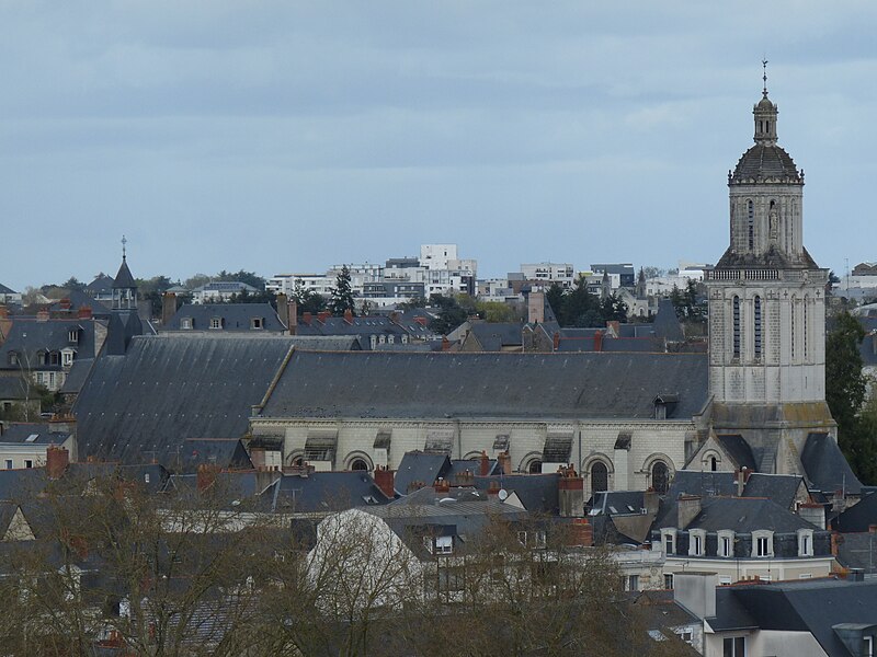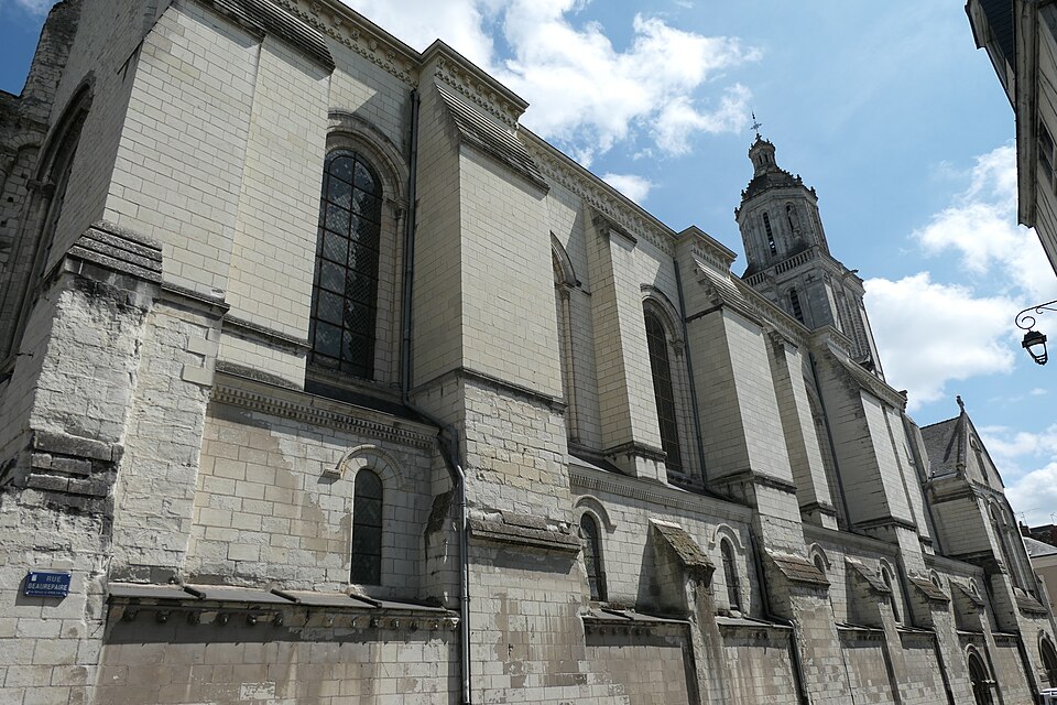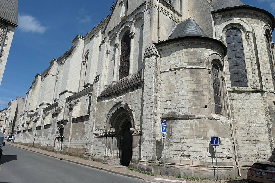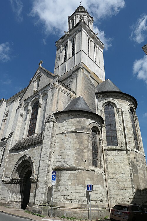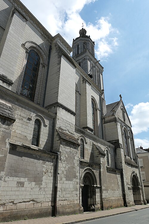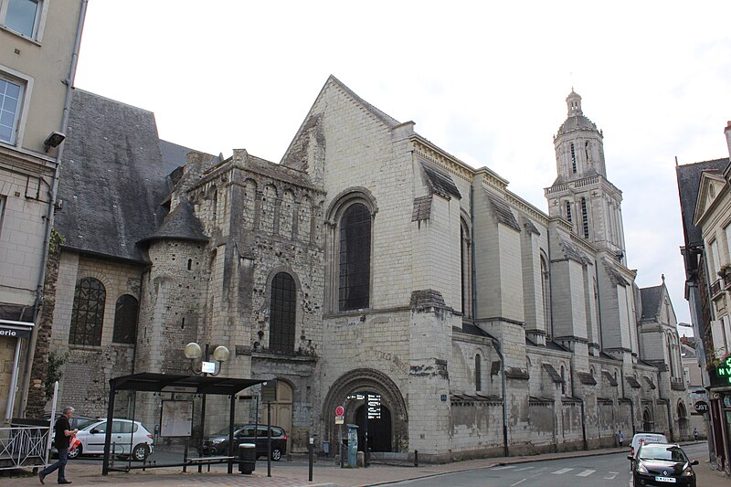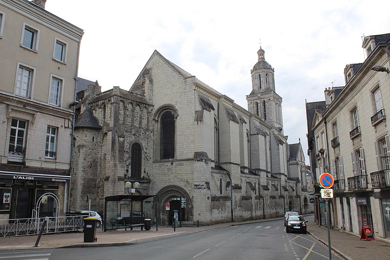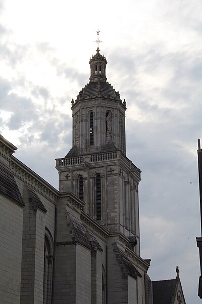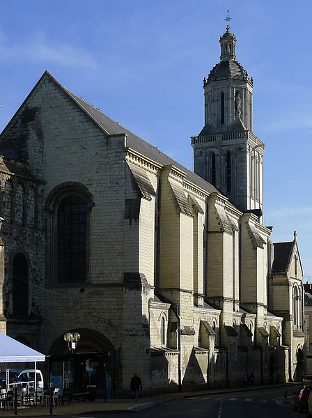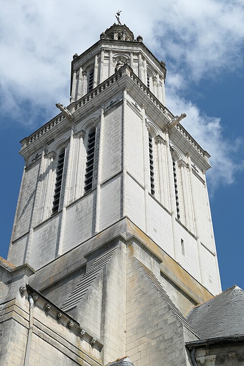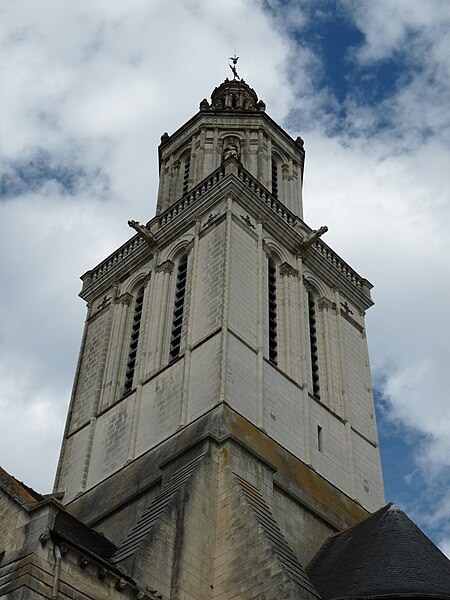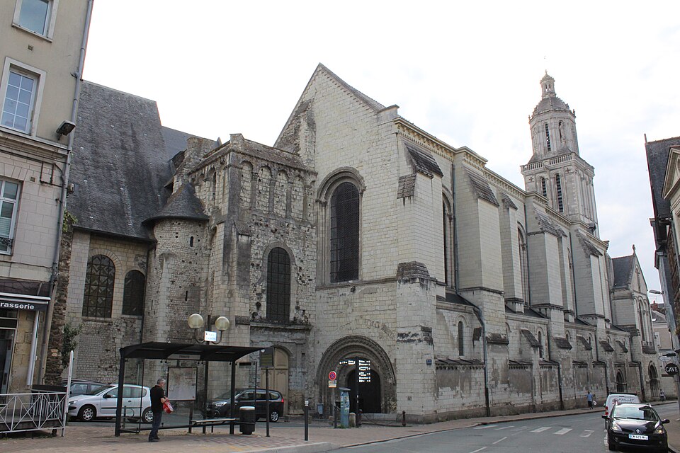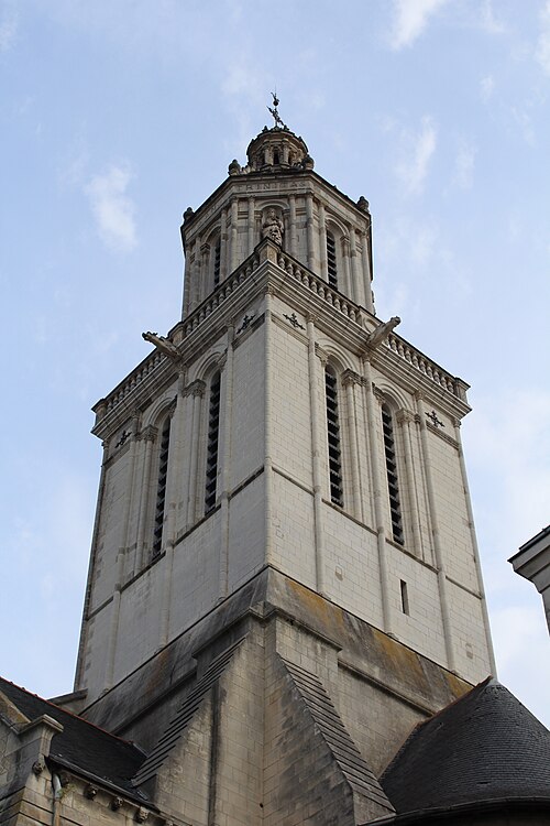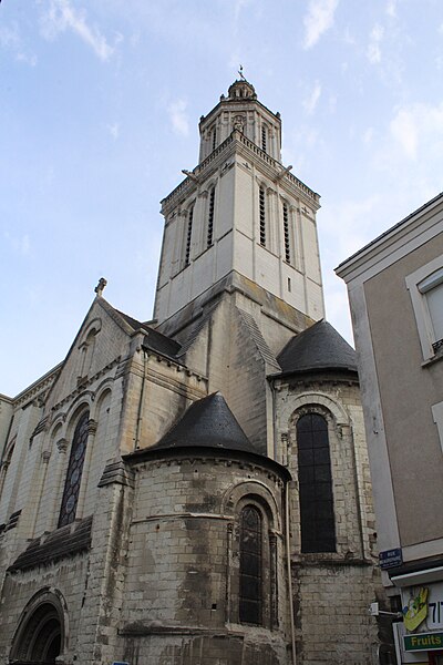 Le lanternon élevé à la croisée, attribué à Jean de l'Espine, date de 1540, tandis que les statues des évangélistes appartiennent au XIXe siècle. La façade sud, donnant sur le boulevard Descazeaux, présente un porche néo-roman et des frises ornées de mascarons humains et animaux; le portail roman y a été restauré au XIXe siècle. L'église a un plan à nef unique avec des chapelles latérales peu profondes ; la nef est séparée du chœur par un arc triomphal flanqué de passages berrichons. La voûte, répartie en trois travées et demie, est renforcée par des nervures irrégulières et présente des clés de voûte toutes différentes, dont une clé centrale dite de « voûte suspendue », caractéristique du premier gothique angevin.