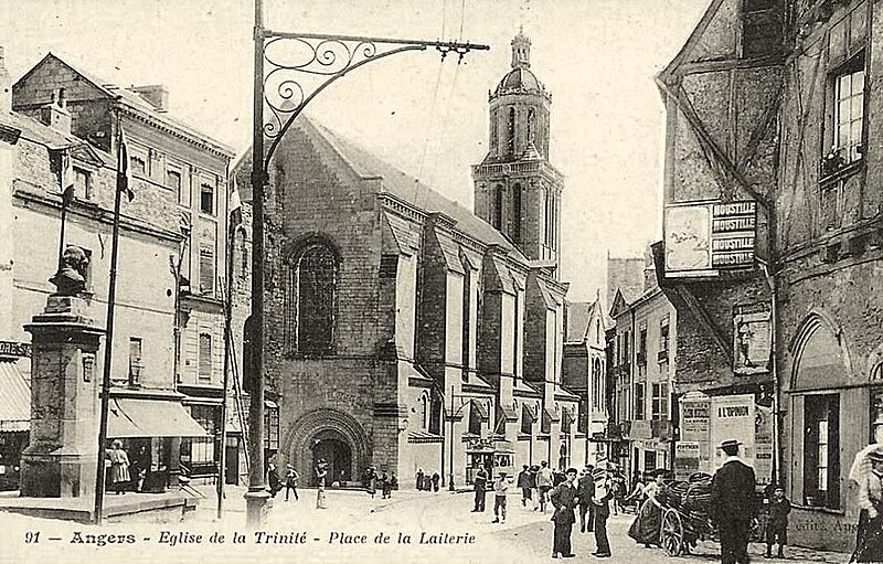 L'église de la Trinité d'Angers, située dans le quartier de la Doutre sur la rive droite de la Maine et orientée sud-est, est classée parmi les monuments historiques depuis 1840. Elle jouxte au sud le boulevard Descazeaux et, au nord, l'École nationale des Arts et Métiers. Fondée par les religieuses de l'abbaye du Ronceray, la première église, adossée au clocher de l'abbatiale, remonte aux alentours de la fin du XIe siècle, comme l'indiquent deux petits contreforts et des traces de baies sur le mur nord de la nef. Peut-être à la suite de l'incendie de 1088, l'édifice est reconstruit entre 1140 et 1180, avec des parties basses antérieures aux parties hautes de la nef et un voûtement achevé par les travées occidentales. Au XVIe siècle, l'architecte Jean Delespine surélève le clocher par un étage octogonal coiffé d'un dôme et d'un lanternon : une inscription restaurée porte la date d'achèvement et le vocable de l'église. La sacristie conserve deux voûtes de la première moitié du XVIe siècle. Peu après 1722, des réaménagements intérieurs sont effectués, notamment la suppression du jubé et la reconstruction des autels. En 1794, le lanternon du clocher est détruit, et au XIXe siècle les maisons en pan de bois qui masquaient l'élévation sud et le porche du portail sud sont abattues.