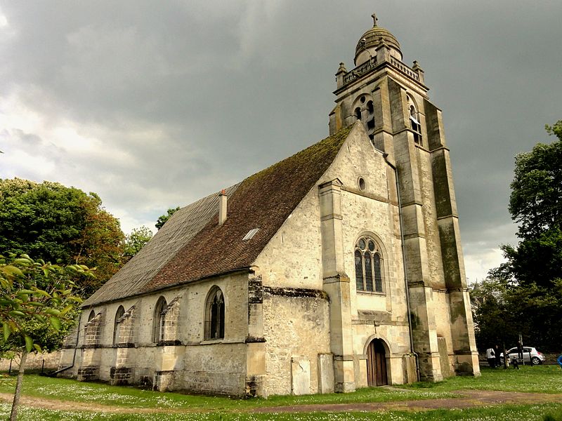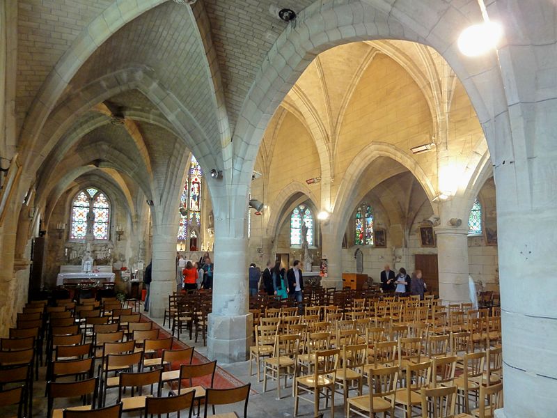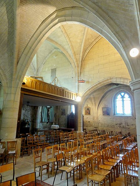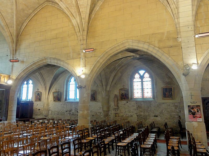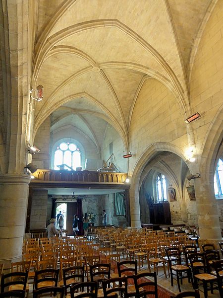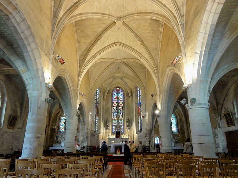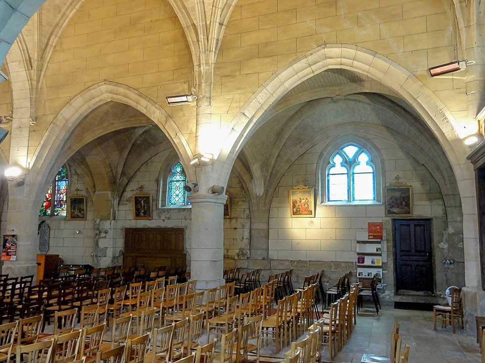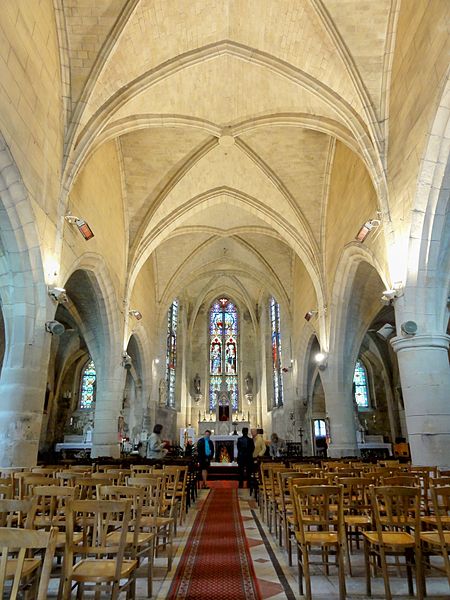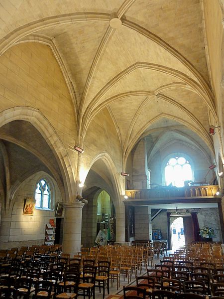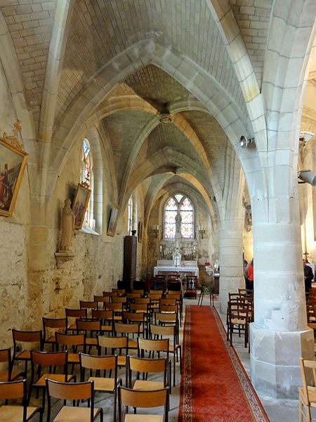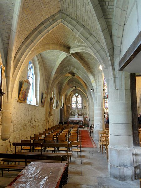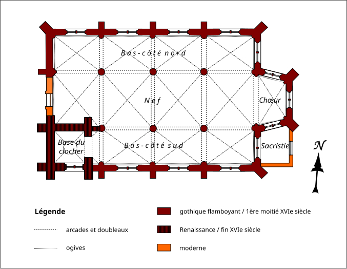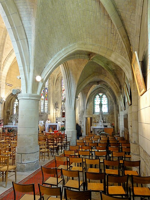 Orientée traditionnellement, l'église présente un plan simple sans transept : un vaisseau central de quatre travées flanqué de deux bas-côtés de même longueur, un chevet à trois pans et une abside voûtée sur une croisée d'ogives. L'ensemble est couvert par une toiture unique, le clocher s'élève au-dessus de la première travée du bas-côté sud et une petite sacristie occupe l'angle entre ce bas-côté et l'abside. L'intérieur se caractérise par des murs hauts aveugles au-dessus des grandes arcades, une hauteur relativement modeste, un emploi systématique de l'arc brisé et une modénature prismatique très simple. Les grandes arcades reposent sur des piliers monocylindriques engagés sans chapiteaux et retombent directement sur des socles octogonaux non moulurés; la mouluration des ogives et des doubleaux se réduit à un profil simple reproduit sur l'ensemble des voûtes. La jonction entre la première campagne et les parties postérieures est signalée par un doubleau plus large, sur lequel les ogives et formerets retombent sur de petits culs-de-lampe sculptés de feuillages; les clés de voûte du vaisseau central restent sobres voire frustes.