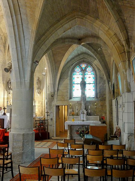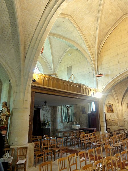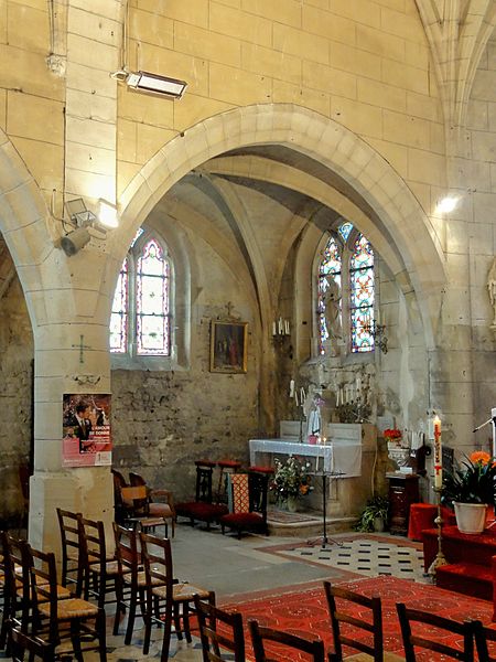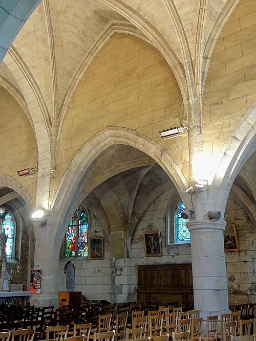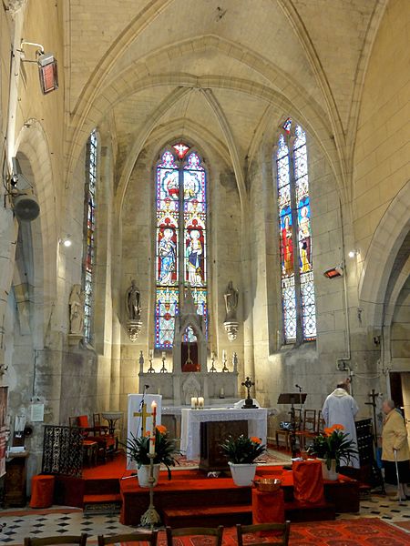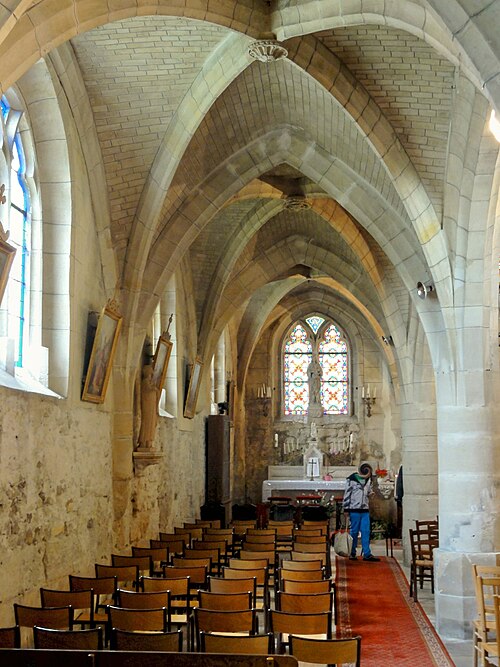 L'abside, sans partie droite, présente des pans latéraux légèrement obliques et est éclairée par des fenêtres hautes à deux lancettes à têtes tréflées, munies d'un remplage inhabituel qui laisse un triangle central et des écoinçons pleins. Les bas-côtés reprennent la même charpente générale; leurs trois premières travées offrent des clés de voûte décorées par des écussons vides, des couronnes de feuillage et des motifs d'inspiration renaissance. Les fenêtres des bas-côtés, relativement étroites et à deux lancettes, suffisent à éclairer ces espaces mais laissent la nef relativement sombre; la base du clocher est séparée du vaisseau et abrite l'escalier desservant la tribune.