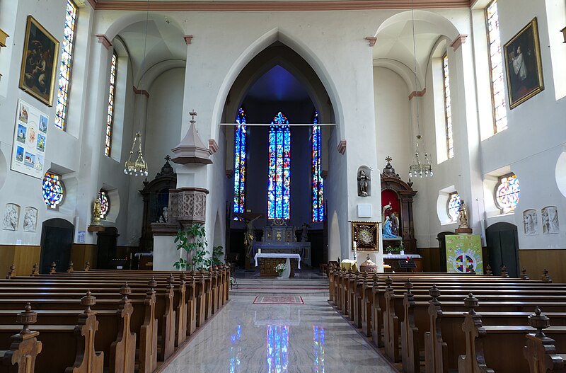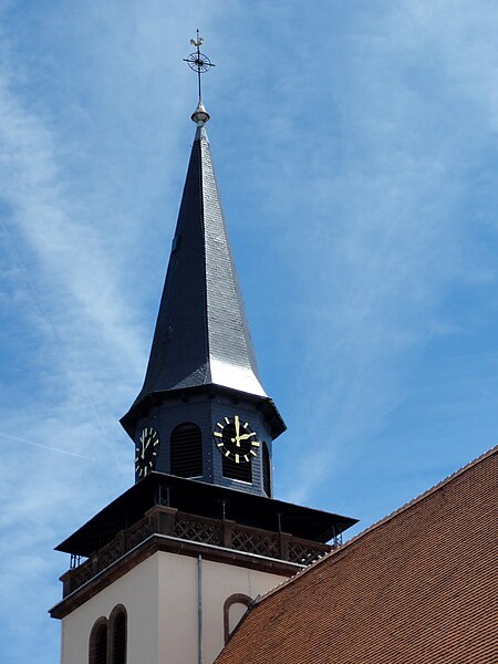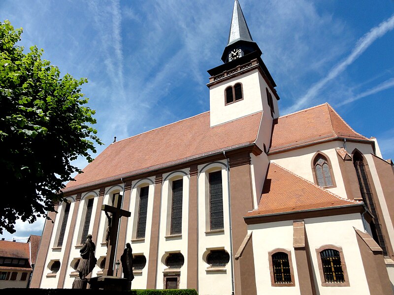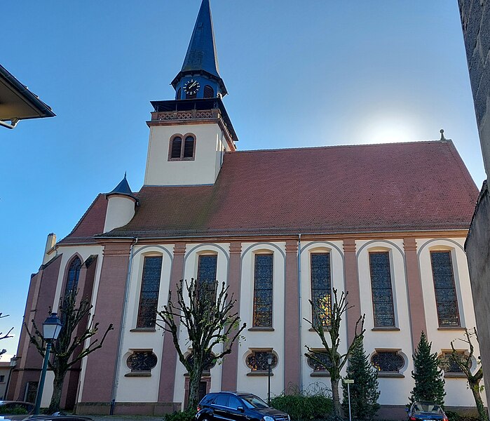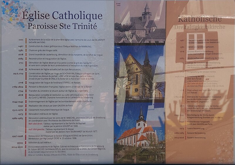 L'église catholique de la Trinité, située rue de l'Église à Lauterbourg (Bas-Rhin), est inscrite au titre des monuments historiques depuis 1984. La paroisse est attestée depuis 1390. La tour, qui sert d'avant-choeur et est attribuée au XIVe siècle, constitue la partie la plus ancienne ; elle aurait peut‑être été à l'origine une tour-choeur. Le chœur actuel, autrefois voûté, a été achevé vers 1467 et consacré par l'évêque de Spire Mathias von Rammung ; la sacristie et la tourelle d'escalier datent de la même période. La nef fut reconstruite ou fortement restaurée en 1683, puis rebâtie en plus grand en 1716 par l'architecte Dominique Elmenreich (1674-1722), originaire du Vorarlberg. La date 1716 figure sur un chronogramme du portail : hIC sVM faVente Deo paCe et Vrbe. L'église fut consacrée en 1719 par l'évêque suffragant Hugo von Schoenheim. Le toit à l'impériale avec lanternon de la tour, visible sur la gravure de Chovin publiée dans l'Alsatia Illustrata en 1761, a disparu. En 1844 la tour a été couronnée d'une coursière en pierre et d'un niveau octogonal plus étroit sommé d'une flèche ; ces élévations ont été refaites après la guerre. La découverte de peintures murales en 1878 n'a laissé qu'un fragment. Dans l'angle sud‑est de l'enclos se trouvait un ossuaire voûté surmonté d'une chapelle dédiée à saint Michel, attestée en 1390 ; elle a été reconstruite ou transformée au XVe siècle, agrandie ultérieurement et remaniée au XVIIIe siècle, une arcade du rez‑de‑chaussée portant la date 1736. Le toit à croupes de cette chapelle n'apparaît pas sur la gravure de Chovin. Ruinée pendant la dernière guerre, la chapelle a été détruite. L'édifice témoigne de plusieurs campagnes de construction et de remaniements du Moyen Âge au XVIIIe siècle.