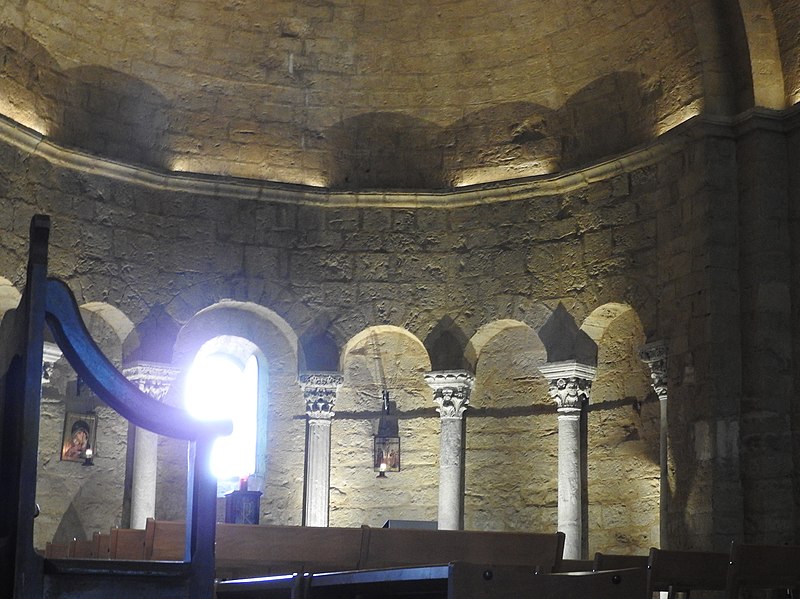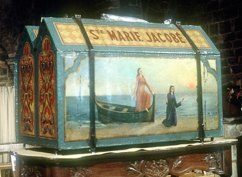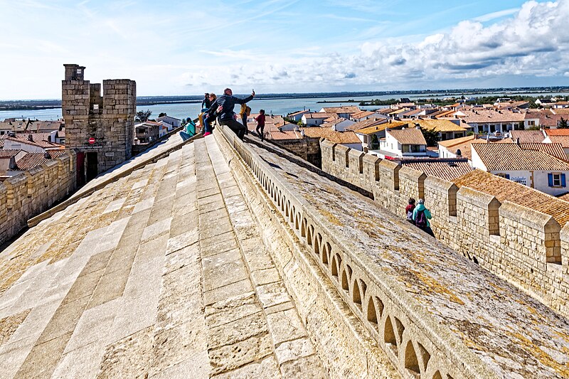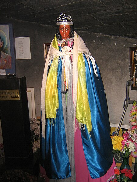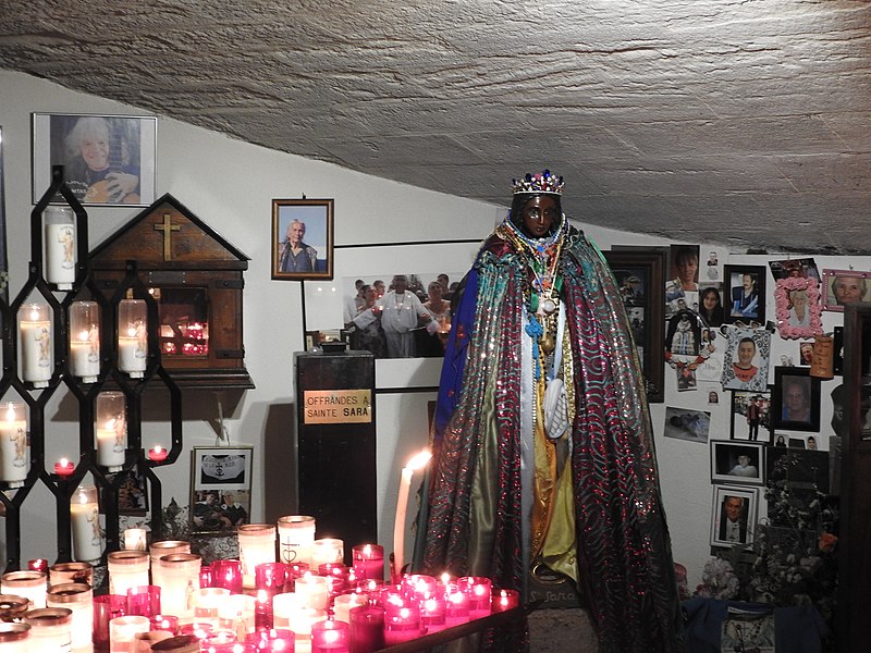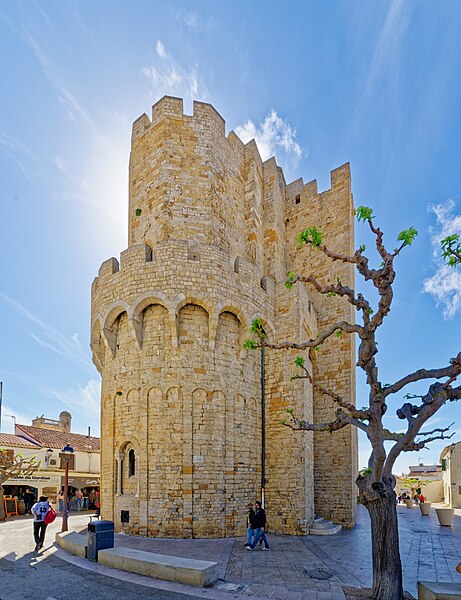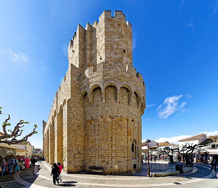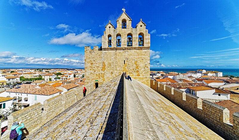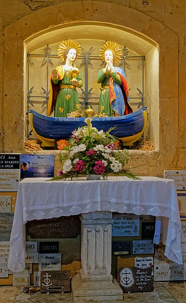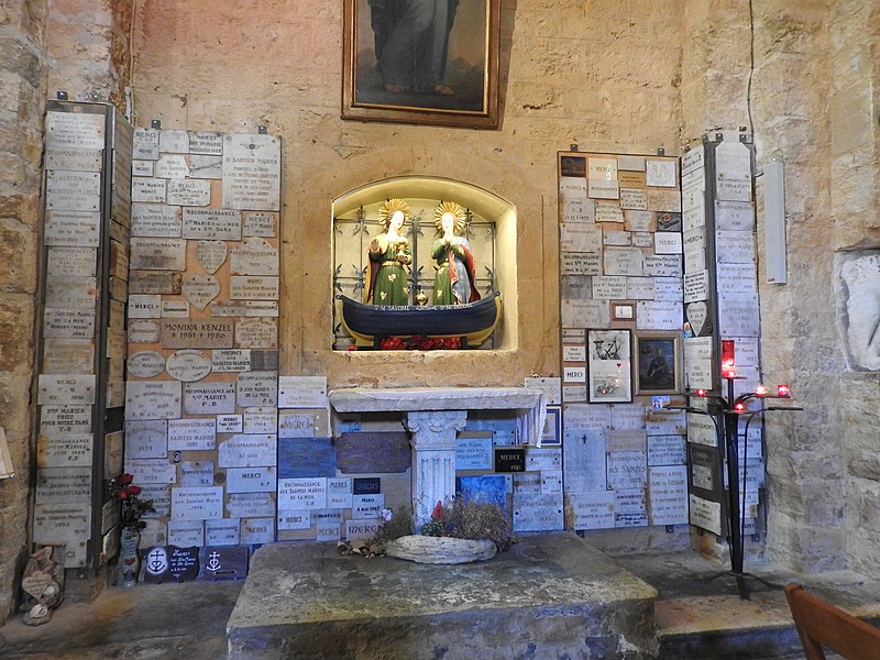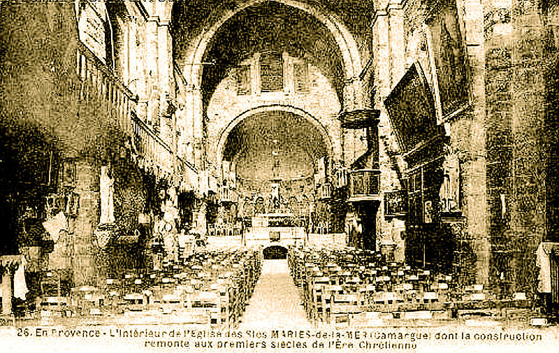 L'église Notre-Dame-de-la-Mer, située aux Saintes‑Maries‑de‑la‑Mer dans les Bouches‑du‑Rhône, est une église fortifiée de tradition romane, dédiée à Notre‑Dame et aux Saintes Maries ; elle est au cœur du pèlerinage local et classée monument historique depuis 1840. Selon Jean‑Paul Clébert citant Strabon, les Phocéens de Massalia auraient établi à cet emplacement un sanctuaire antique dédié à Artémis, et le site apparaît déjà dans l'Ora Maritima d'Avienus sous le nom d'« oppidum priscium Râ ». Ce toponyme évolua en Sancta Maria de Ratis puis en Notre‑Dame‑de‑la‑Barque lorsque la légende du débarquement des Saintes Maries se répandit, et une communauté de religieuses fut établie sur l'îlot par l'évêque Césaire d'Arles pour christianiser des cultes païens tels que celui de Mithra et de Diane d'Éphèse. Visible à une dizaine de kilomètres, l'édifice domine la ville ; sa construction commence au début du IXe siècle dans un contexte d'invasions et de mutations architecturales entre influences carolingiennes et romanité. Menacé par les Sarrasins et les Vikings, le site dut être abandonné puis relevé après la reprise du territoire ; l'église passa successivement sous la mense de Saint‑Trophime, fut rattachée à l'abbaye Saint‑Pierre de Montmajour qui y établit un prieuré, et prit le nom de Notre‑Dame‑de‑la‑Mer. La reconstruction principale de l'église fortifiée actuelle date de 1165‑1170 et contribue à l'implantation définitive du culte chrétien sur le lieu. Aux XIVe et XVe siècles, sous l'influence des papes d'Avignon, le pèlerinage prit de l'ampleur ; Benoît XII fixa en 1343 deux fêtes principales et, durant les troubles de 1357, les reliques furent mises à l'abri et les fortifications renforcées. Lors des fouilles entreprises sous le règne du roi René en 1448, on mit au jour un puits, une source, une grotte contenant des écuelles et des cendres, un oratoire avec colonne‑autel, deux corps attribués aux Saintes et plusieurs cippes dont l'un paraît provenir d'un culte mithriaque ; ces vestiges illustrent la superposition de pratiques religieuses sur le site. La découverte des reliques entraîna la décision de les montrer trois fois par an et d'organiser des processions à la mer, dont la cérémonie d'immersion de la statue de Sara la Noire, pratiquée selon la tradition locale et codifiée depuis 1936, précède d'un jour l'immersion des Saintes en barque. Les processions à la mer relèvent d'une longue tradition rituelle régionale associant actes agraires et pratiques purificatrices et se retrouvent, sous des formes variées, dans plusieurs lieux de la côte méditerranéenne provençale. Les fouilles archéologiques ont également permis de restituer l'église primitive : une chapelle rurale en pierre calcaire à nef unique de trois travées, précédée d'un chœur et d'une abside semi‑circulaire, flanquée au nord d'une tour carrée accessible depuis le chœur et pourvue de deux portes latérales dont la porte des fidèles portait autrefois des lions en réemploi. L'ensemble du village fut protégé par des remparts médiévaux et l'église, fortifiée au fil des besoins, prit au XIVe siècle l'aspect d'une forteresse avec mâchicoulis alternés, créneaux et tour de guet culminant à quinze mètres. L'abside extérieure, polygonale, est surmontée d'un ancien corps de garde et éclairée par une baie en plein cintre encadrée de colonnettes à chapiteaux datés du début du XIIIe siècle ; sa décoration associe bandes lombardes et consoles. Le mur du clocher, qui couvre toute la largeur du chœur, présente des échancrures et des mâchicoulis disposés en ligne et accueille cinq cloches ; il s'appuie sur le corps de garde qui abrite la chapelle haute dédiée à l'archange saint Michel, chapelle intégrée au système défensif et contenant les reliques des Saintes dans une châsse. Le clocher‑mur porte cinq cloches de volée : Marie Jacobé‑Marie Salomé fondue en 1993 par la fonderie Paccard (note sol3), Claire fondue en 1837 par Eugène Baudouin (note la#3), Rosa fondue en 1839 par Eugène Baudouin (note do4), Réconciliation fondue en 1984 par Paccard (note ré4) et Fulcranne fondue par Pierre Pierron à Avignon (note ré#4). À l'intérieur, l'église romane comprend une nef de quatre travées coiffée d'un berceau brisé et une abside semi‑circulaire sobrement décorée, complétées par une crypte dédiée à Sara la Noire et par la chapelle haute. La nef, sans chapelles latérales, présente une niche avec la représentation des Saintes Maries en barque, des arcatures en plein cintre portées par l'épaisseur des murs, un puits sous un Christ en bois du XVIIe siècle et, côté nord près du portail, un tronçon de dallage originel et un bénitier taillé dans un ancien chapiteau ; y figurent également deux œuvres classées monuments historiques depuis 1840, un retable en bois doré du XVIIe siècle et un dais d'autel peint du XVIe siècle. L'abside intérieure, voûtée en cul‑de‑four, comporte sept arcatures soutenues par huit colonnettes en marbre et chapiteaux historiés répartis en deux groupes : six chapiteaux à décor de feuillage, masques et bustes proches de la galerie nord du cloître de Saint‑Trophime, et deux chapiteaux majeurs illustrant le mystère de l'Incarnation et la passion du Christ, le premier montrant la Visitation et l'apparition de l'archange Gabriel à Zacharie, le second évoquant la Passion sous la forme du Sacrifice d'Abraham. La crypte semi‑enterrée, accessible depuis le transept, abrite la statue vêtue de Sara la Noire, un autel et de nombreux ex‑voto ; elle conserve également le bloc de marbre dit « oreiller des Saintes » mis au jour lors des fouilles de 1448.
