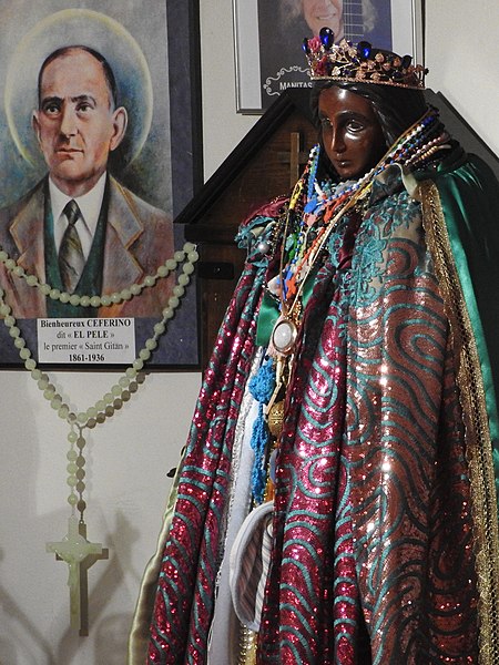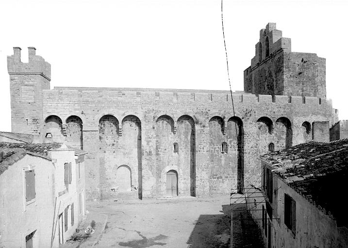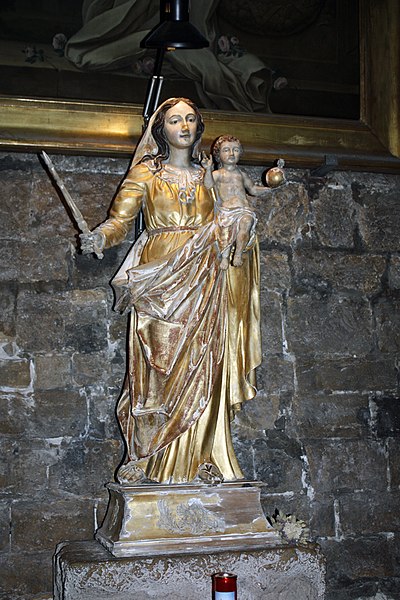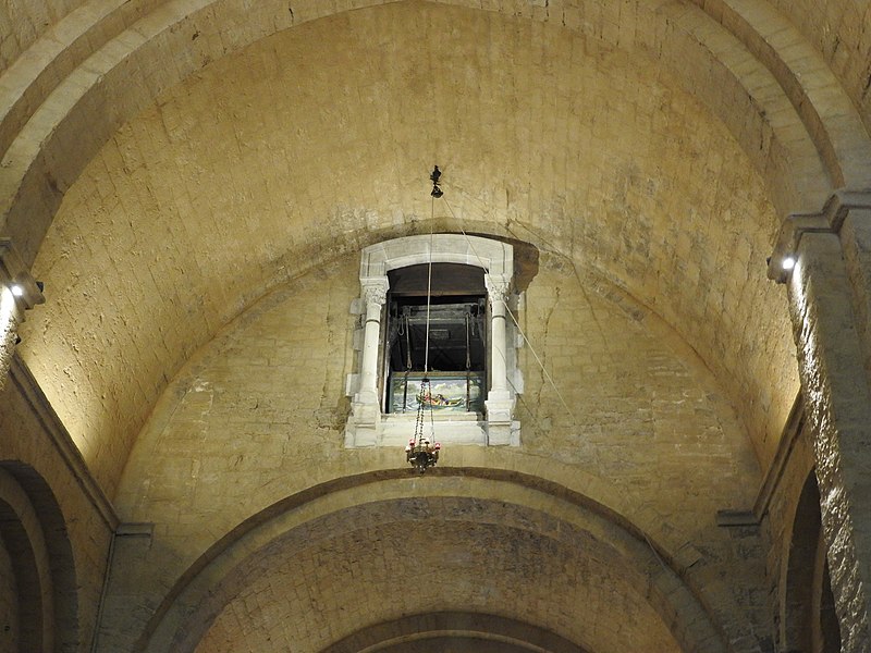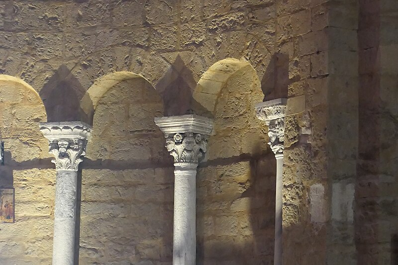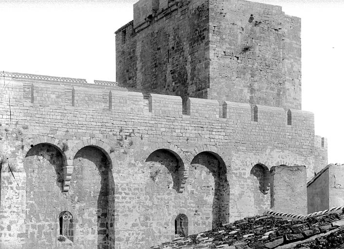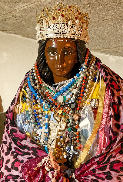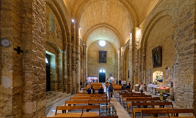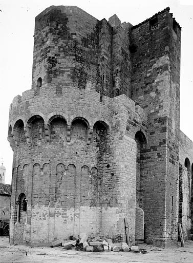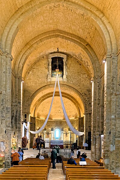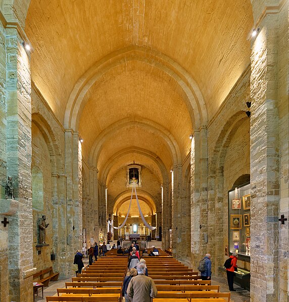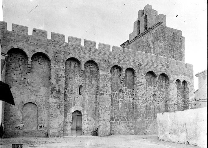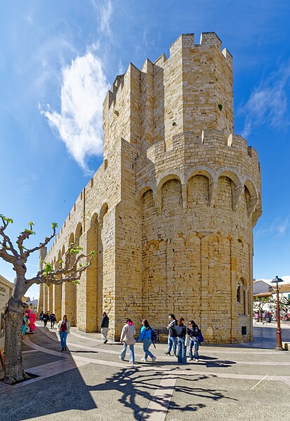 L'église Notre-Dame-de-la-Mer, située aux Saintes‑Maries‑de‑la‑Mer dans les Bouches‑du‑Rhône, est une église fortifiée de tradition romane, dédiée à Notre‑Dame et aux Saintes Maries ; elle est au cœur du pèlerinage local et classée monument historique depuis 1840. Selon Jean‑Paul Clébert citant Strabon, les Phocéens de Massalia auraient établi à cet emplacement un sanctuaire antique dédié à Artémis, et le site apparaît déjà dans l'Ora Maritima d'Avienus sous le nom d'« oppidum priscium Râ ». Ce toponyme évolua en Sancta Maria de Ratis puis en Notre‑Dame‑de‑la‑Barque lorsque la légende du débarquement des Saintes Maries se répandit, et une communauté de religieuses fut établie sur l'îlot par l'évêque Césaire d'Arles pour christianiser des cultes païens tels que celui de Mithra et de Diane d'Éphèse. Visible à une dizaine de kilomètres, l'édifice domine la ville ; sa construction commence au début du IXe siècle dans un contexte d'invasions et de mutations architecturales entre influences carolingiennes et romanité. Menacé par les Sarrasins et les Vikings, le site dut être abandonné puis relevé après la reprise du territoire ; l'église passa successivement sous la mense de Saint‑Trophime, fut rattachée à l'abbaye Saint‑Pierre de Montmajour qui y établit un prieuré, et prit le nom de Notre‑Dame‑de‑la‑Mer. La reconstruction principale de l'église fortifiée actuelle date de 1165‑1170 et contribue à l'implantation définitive du culte chrétien sur le lieu. Aux XIVe et XVe siècles, sous l'influence des papes d'Avignon, le pèlerinage prit de l'ampleur ; Benoît XII fixa en 1343 deux fêtes principales et, durant les troubles de 1357, les reliques furent mises à l'abri et les fortifications renforcées. Lors des fouilles entreprises sous le règne du roi René en 1448, on mit au jour un puits, une source, une grotte contenant des écuelles et des cendres, un oratoire avec colonne‑autel, deux corps attribués aux Saintes et plusieurs cippes dont l'un paraît provenir d'un culte mithriaque ; ces vestiges illustrent la superposition de pratiques religieuses sur le site. La découverte des reliques entraîna la décision de les montrer trois fois par an et d'organiser des processions à la mer, dont la cérémonie d'immersion de la statue de Sara la Noire, pratiquée selon la tradition locale et codifiée depuis 1936, précède d'un jour l'immersion des Saintes en barque. Les processions à la mer relèvent d'une longue tradition rituelle régionale associant actes agraires et pratiques purificatrices et se retrouvent, sous des formes variées, dans plusieurs lieux de la côte méditerranéenne provençale. Les fouilles archéologiques ont également permis de restituer l'église primitive : une chapelle rurale en pierre calcaire à nef unique de trois travées, précédée d'un chœur et d'une abside semi‑circulaire, flanquée au nord d'une tour carrée accessible depuis le chœur et pourvue de deux portes latérales dont la porte des fidèles portait autrefois des lions en réemploi. L'ensemble du village fut protégé par des remparts médiévaux et l'église, fortifiée au fil des besoins, prit au XIVe siècle l'aspect d'une forteresse avec mâchicoulis alternés, créneaux et tour de guet culminant à quinze mètres. L'abside extérieure, polygonale, est surmontée d'un ancien corps de garde et éclairée par une baie en plein cintre encadrée de colonnettes à chapiteaux datés du début du XIIIe siècle ; sa décoration associe bandes lombardes et consoles. Le mur du clocher, qui couvre toute la largeur du chœur, présente des échancrures et des mâchicoulis disposés en ligne et accueille cinq cloches ; il s'appuie sur le corps de garde qui abrite la chapelle haute dédiée à l'archange saint Michel, chapelle intégrée au système défensif et contenant les reliques des Saintes dans une châsse. Le clocher‑mur porte cinq cloches de volée : Marie Jacobé‑Marie Salomé fondue en 1993 par la fonderie Paccard (note sol3), Claire fondue en 1837 par Eugène Baudouin (note la#3), Rosa fondue en 1839 par Eugène Baudouin (note do4), Réconciliation fondue en 1984 par Paccard (note ré4) et Fulcranne fondue par Pierre Pierron à Avignon (note ré#4). À l'intérieur, l'église romane comprend une nef de quatre travées coiffée d'un berceau brisé et une abside semi‑circulaire sobrement décorée, complétées par une crypte dédiée à Sara la Noire et par la chapelle haute. La nef, sans chapelles latérales, présente une niche avec la représentation des Saintes Maries en barque, des arcatures en plein cintre portées par l'épaisseur des murs, un puits sous un Christ en bois du XVIIe siècle et, côté nord près du portail, un tronçon de dallage originel et un bénitier taillé dans un ancien chapiteau ; y figurent également deux œuvres classées monuments historiques depuis 1840, un retable en bois doré du XVIIe siècle et un dais d'autel peint du XVIe siècle. L'abside intérieure, voûtée en cul‑de‑four, comporte sept arcatures soutenues par huit colonnettes en marbre et chapiteaux historiés répartis en deux groupes : six chapiteaux à décor de feuillage, masques et bustes proches de la galerie nord du cloître de Saint‑Trophime, et deux chapiteaux majeurs illustrant le mystère de l'Incarnation et la passion du Christ, le premier montrant la Visitation et l'apparition de l'archange Gabriel à Zacharie, le second évoquant la Passion sous la forme du Sacrifice d'Abraham. La crypte semi‑enterrée, accessible depuis le transept, abrite la statue vêtue de Sara la Noire, un autel et de nombreux ex‑voto ; elle conserve également le bloc de marbre dit « oreiller des Saintes » mis au jour lors des fouilles de 1448.