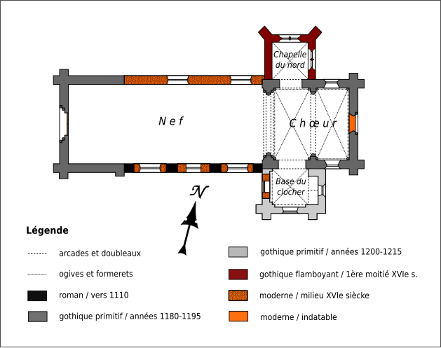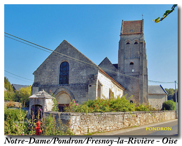 L'église Notre‑Dame de Pondron se situe au hameau de Pondron, commune de Fresnoy‑la‑Rivière dans l'Oise, et constitue une église paroissiale catholique dédiée à la Vierge. L'édifice, classé au titre des monuments historiques par arrêté du 30 janvier 1920, est pour l'essentiel de style gothique primitif et présente un haut degré d'authenticité du fait de l'absence de restauration générale, seules des interventions récentes ont porté sur le clocher et le pignon oriental du chœur. L'église a été édifiée en deux campagnes rapprochées, entre la fin du XIIe et le début du XIIIe siècle, en réutilisant les murs latéraux d'une ancienne nef romane du début du XIIe siècle, laquelle a été prolongée vers l'ouest et dotée d'un nouveau portail. Le plan est simple et presque cruciforme : une nef unique de quatre travées, un chœur de deux courtes travées au chevet plat, un clocher en bâtière implanté au sud de la première travée du chœur et une chapelle carrée accrochée au nord du même niveau; un bas‑côté sud, ajouté après coup, a été démoli et ses grandes arcades bouchées demeurent visibles. La façade occidentale, de la fin du XIIe siècle, se distingue par son appareil régulier en pierre de taille, une large baie en plein cintre et un portail à arc brisé pourvu de colonnettes, chapiteaux à crochets et double archivolte ; le tympan reste non décoré. On retrouve des partis archaïsants dans l'architecture, notamment des baies en plein cintre, des contreforts plats à l'aspect roman et une corniche à modillons, traits qui coexistent avec des sculptures de chapiteaux et des éléments résolument gothiques. Le clocher, bâti en saillie à côté du chœur et couvert d'une bâtière perpendiculaire à l'axe de l'édifice, présente des bandeaux, un décor de billettes et de têtes de clous, ainsi qu'un étage de beffroi sobre ; sa base sert de chapelle et communique avec l'intérieur par une petite arcade, tandis qu'une niche d'autel s'ouvre à l'est de la chapelle. La chapelle nord, reconstruite ou ajoutée au début du XVIe siècle, est de style gothique flamboyant et se reconnaît à ses délicats réseaux de lancettes et à sa voûte d'ogives flamboyante ; la chapelle sud, plus modeste, contient une niche d'autel d'origine avec piscine liturgique et armoires murales. À l'intérieur, la nef est une simple salle rectangulaire à charpente apparente en carène renversée, les quatre travées orientales étant voûtées d'ogives ; l'arc triomphal s'ouvre largement sur le chœur, dont les deux travées très barlongues sont voûtées et montrent un système d'ogives et de doubleaux au profil de tores, retombant sur chapiteaux à feuilles et sur des culs‑de‑lampe sculptés, dont certains figurent des têtes humaines. Les formerets retombent sur des culs‑de‑lampe et les corniches du chevet sont ornées de modillons et de corbeaux sculptés, témoignant d'une grande homogénéité de matériaux et d'appareillage entre chœur, première travée de la nef et clocher. Le sol présente un dallage partiellement refait en tomettes et des dalles funéraires anciennes retournées sous les bancs ; la sacristie a été démolie lors de travaux récents. Le mobilier comporte notamment des fonts baptismaux en pierre calcaire de la seconde moitié du XIIIe siècle, hexagonaux, d'environ 96 cm de hauteur et de diamètre, ainsi que plusieurs statues et un Christ en croix qui ont été classés ou inscrits au titre des objets et, pour l'essentiel, transférés au musée de l'Archerie et du Valois à Crépy‑en‑Valois. Sous l'Ancien Régime, Pondron relevait du doyenné de Crépy‑en‑Valois et du diocèse de Senlis; les institutions diocésaines ont ensuite été modifiées lors de la Révolution et du Concordat, et la commune de Pondron a été réunie à Fresnoy‑la‑Rivière en 1825, période à partir de laquelle l'église a connu de longues phases d'abandon. Aujourd'hui, l'église est rattachée à la paroisse de la vallée de l'Automne (paroisse Saint‑Pierre) de Verberie et les offices y sont célébrés quelques fois dans l'année, généralement le dimanche matin. L'ensemble offre un exemple intéressant de transition entre les formes romanes et la première période gothique, avec des adjonctions flamboyantes qui traduisent l'histoire architecturale et liturgique de l'édifice.