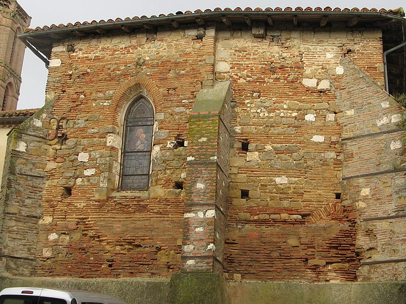 L'église Saint-Adbon et Saint-Sennen de Puycasquier est un édifice gothique à trois nefs et chevet plat, remanié à plusieurs reprises tout en conservant quelques éléments médiévaux. Le clocher repose sur une base carrée en pierre et se compose de deux étages octogonaux en briques, percés d'ouvertures et ornés d'éléments décoratifs. Le portail ogival est encadré de trois colonnes de chaque côté, posées sur un socle et surmontées de chapiteaux sculptés de feuillages. Des voussures en arc brisé retombent sur ces chapiteaux et sur deux culs-de-lampe figurant des personnages accroupis. L'église conserve un portail sculpté caractéristique de la première moitié du XIVe siècle.
