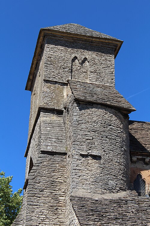 Construite en petit moellon assemblé en opus vittatum et couverte de lauzes, l'église présente un chevet formé d'une abside polygonale percée de nombreux trous de boulin et soutenue par de puissants contreforts, ainsi qu'une travée de chœur. La croisée du transept porte un clocher octogonal coiffé d'une toiture très surbaissée ; l'avant-dernier étage, totalement aveugle, est orné d'une frise d'arceaux géminés et trilobés, tandis que le dernier niveau est percé sur chaque face d'une baie géminée à arcs trilobés et colonnette, inscrite sous une archivolte en plein cintre, donnant à l'ensemble un léger accent gothisant. La façade occidentale s'ouvre sur un portail ogival surmonté d'une baie géminée à arcs trilobés et colonnette, le tout encadré par un puissant arc de décharge qui supporte l'extrémité d'une tour trapue de plan barlong.