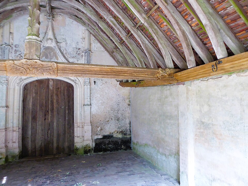 La grande poutre transversale du porche couvert est ornée : au centre, côté ouest, de fleurs et, sur l'autre face, de raisins. Le poinçon est sculpté en forme d'arbre dépourvu de branches. Au milieu des murs latéraux se trouvent des poteaux de soutien, dont l'un porte un médaillon assez effacé.