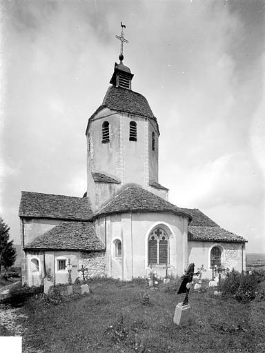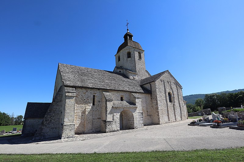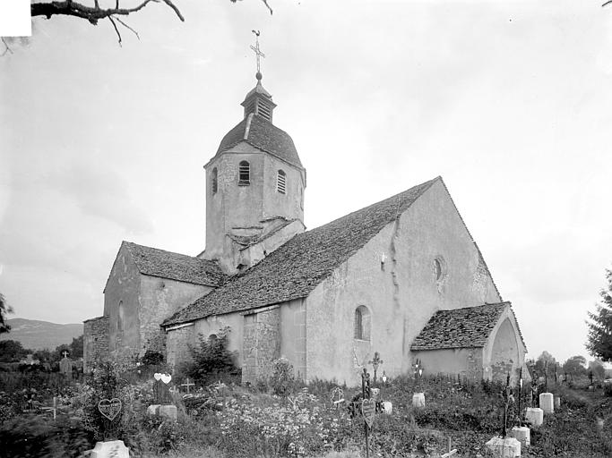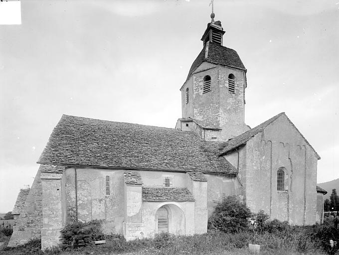 L'église actuelle a été édifiée au XIe siècle et desservait un prieuré dépendant du chapitre cathédral Saint-Vincent de Mâcon. Son architecture romane rapproche l'édifice des églises du Mâconnais et suggère l'intervention d'un maître d'œuvre bourguignon. Gravement endommagée par un sinistre au début du XVIIe siècle, elle a fait l'objet d'une reconstruction partielle vers 1634 : la nef, le bas-côté nord et le croisillon sud ont été restaurés et voûtés, le bas-côté sud a été voûté et l'absidiole nord, arasée au niveau du sol, remplacée par une sacristie. De cette campagne datent également la grosse tour-clocher posée sur le transept, la façade occidentale et le porche voûté.