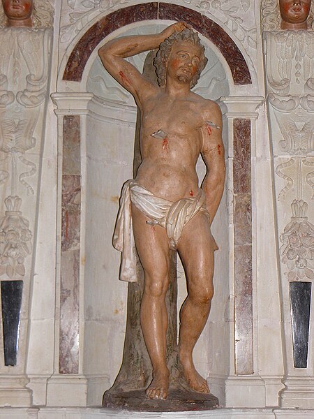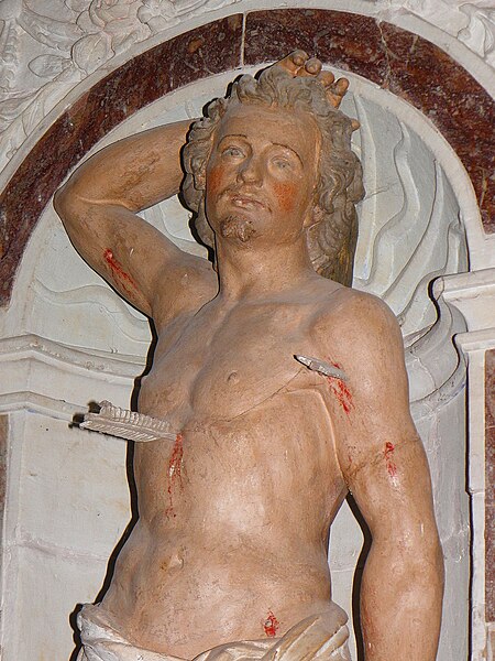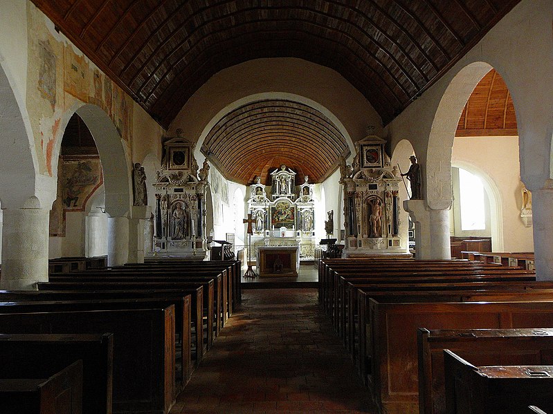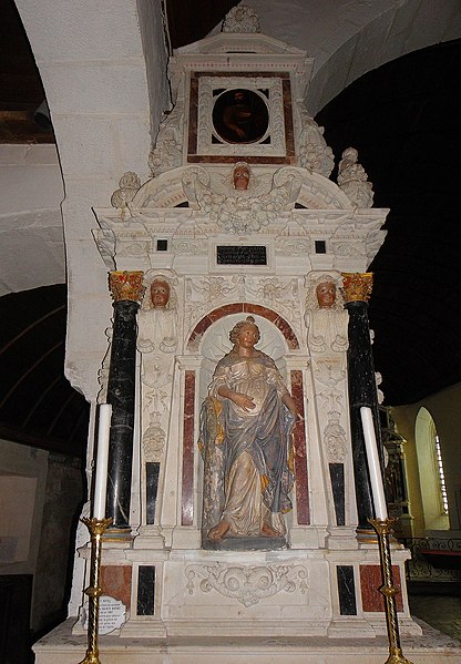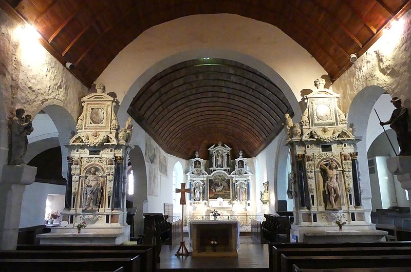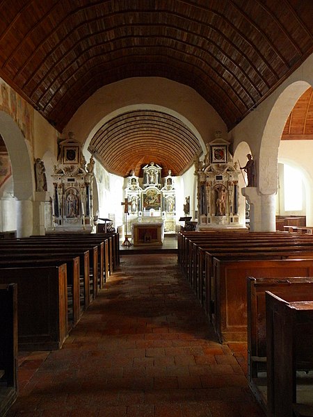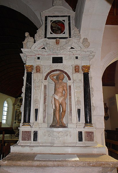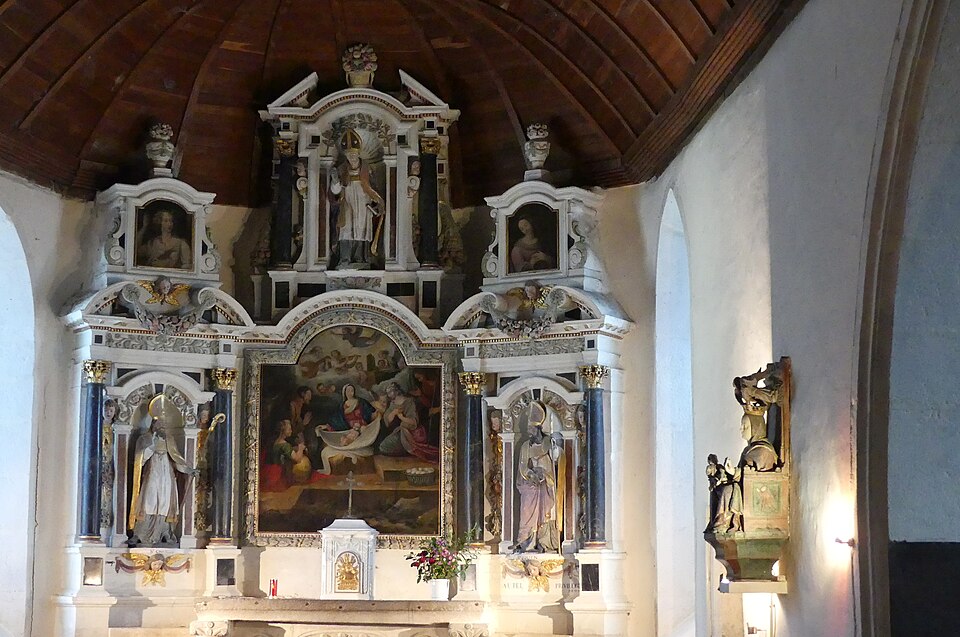 Le mobilier comprend plusieurs retables remarquables. Trois retables, datés de 1699 à 1701 et réalisés par François Langlois, ont été financés par Pierre Charlot — chirurgien et « procureur fabricier » selon une plaque émaillée dans le chœur — et par Jaquine Mesnage. Le retable du maître‑autel, don de Pierre Charlot en 1699, est orné d’une Adoration des bergers peinte par Charles Dufresne de Postel. Le retable de sainte Barbe, offert en 1699 par Pierre Charlot et Jaquine Mesnage, et le retable de saint Sébastien, don de Jaquine Mesnage en 1701, comportent des statues en terre cuite probablement antérieures et liées à la tradition des maîtres potiers du XVIe siècle. Ces trois retables sont classés au titre des monuments historiques depuis 1910. Parmi les motifs décoratifs, on note des angelots et des guirlandes, détails typiques des retables de François Langlois.