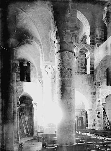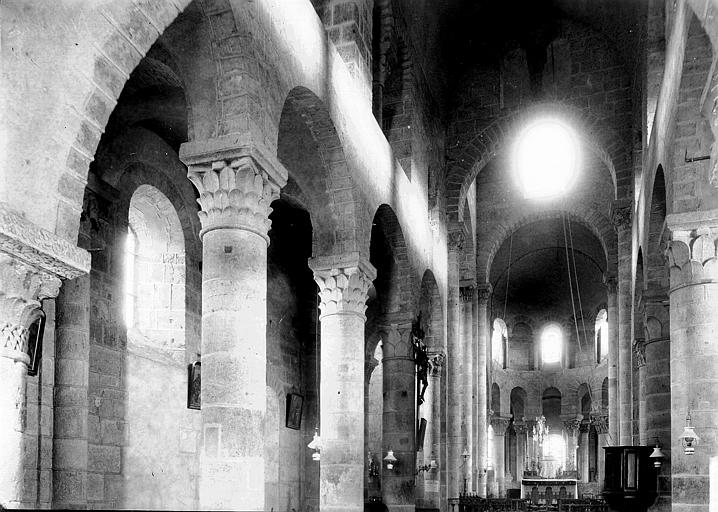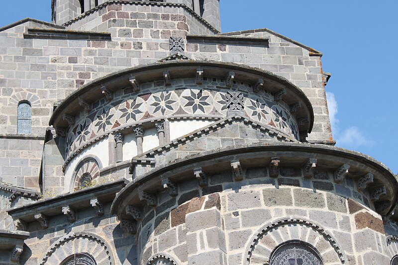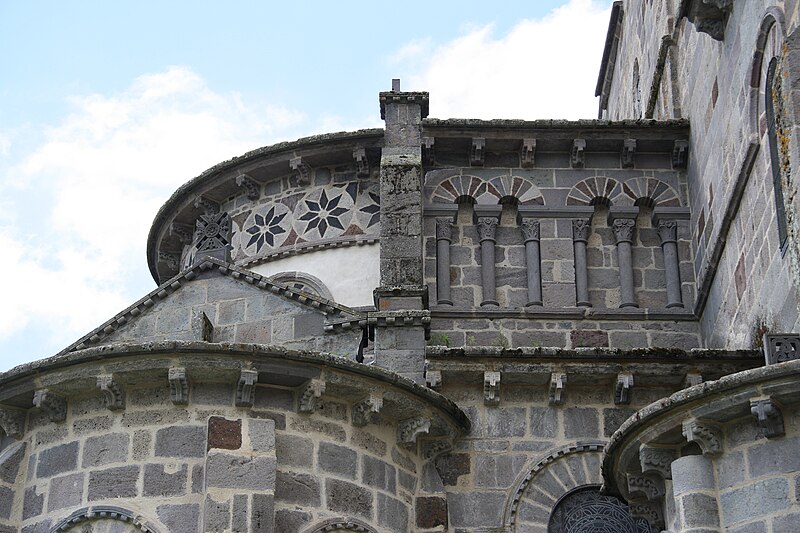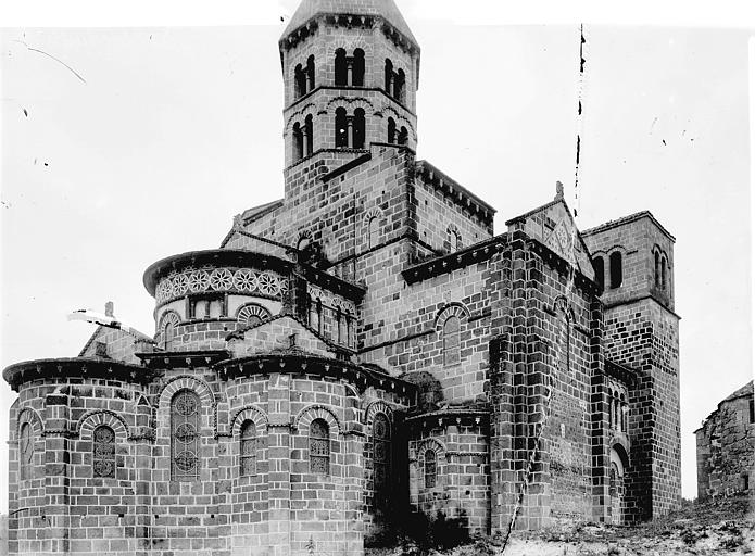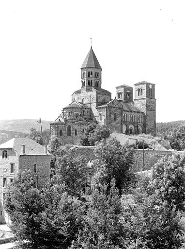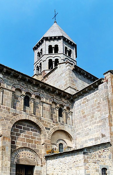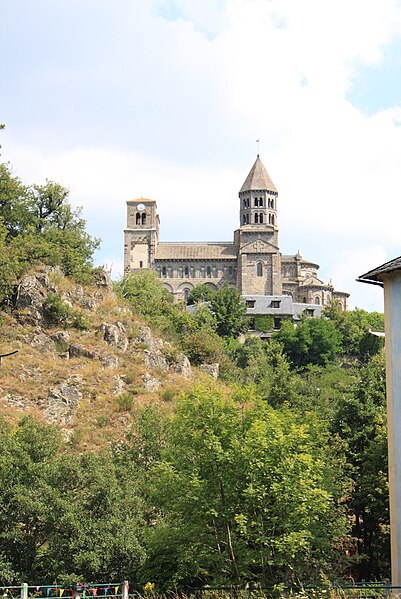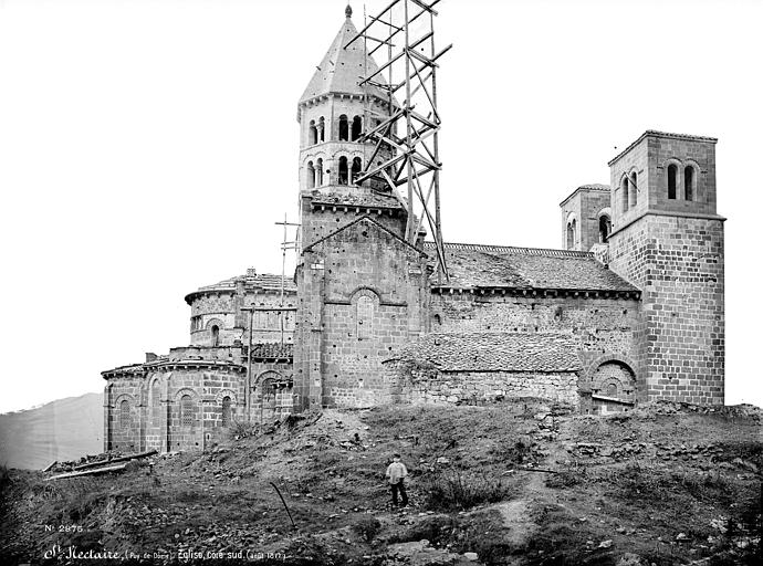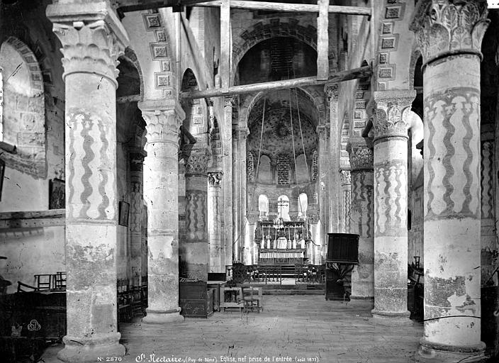 L'église Saint‑Nectaire, dédiée à saint Nectaire d'Auvergne, est un édifice roman auvergnat édifié principalement aux XIe et XIIe siècles, commencé vers 1080 et poursuivi entre 1146 et 1178. Située sur le mont Cornadore, elle figure parmi les cinq églises romanes dites « majeures » d'Auvergne. Classée au titre des monuments historiques en 1840, l'église a vu ses tours et son clocher restaurés au XIXe siècle après des destructions survenues en 1794. Vers 1874, Louis‑Clémentin Bruyerre, architecte des monuments historiques, a restauré les tours et le clocher. Construite en trachyte puis peinte, elle illustre la maîtrise de la combinaison des volumes propre à l'architecture romane auvergnate. Sa composition associe un narthex avec tribune, une nef voûtée en berceau à trois nefs avec bas‑côtés et tribunes, deux transepts à chapelles semi‑circulaires orientées, un chœur en cul‑de‑four entouré d'un déambulatoire et de trois chapelles rayonnantes, et une croisée surmontée d'un massif barlong puis d'un clocher octogonal. Le clocher à huit pans est coiffé d'une flèche en tuf, les parties supérieures du clocher et la flèche ayant été refaites au XIXe siècle. La façade occidentale, sobre, présente un portail en plein cintre et deux tours d'allure reconstituée au XIXe siècle, la tour nord étant plus large en raison de l'escalier en vis qu'elle renferme. Les façades latérales rappellent la basilique Notre‑Dame‑du‑Port et l'abbatiale d'Issoire, avec des fenêtres sous de grands arcs et des triplets de baies aveugles; la façade sud s'ouvre par un portail surmonté d'un tympan et d'une mosaïque polychrome. Le chevet, construit en étagements de volumes, se distingue par une polychromie plus sobre que celle d'Issoire, associant surtout des tons noirs, bruns et beiges, et par des corniches soutenues par des modillons à copeaux. Les chapelles rayonnantes, le déambulatoire et le chœur sont ornés de claveaux et de cordons de billettes, et chaque chapelle est adossée à un pignon couronné d'une croix de pierre. À l'intérieur, l'architecture se caractérise par la clarté des volumes, la simplicité décorative et l'élégance des proportions, avec une nef centrale voûtée en berceau deux fois plus haute que les bas‑côtés. Le narthex, intégré à la structure et percé d'une tribune au‑dessus, sert de vestibule et conduit à la nef par un portail en plein cintre; la galerie supérieure, accessible depuis la tour nord, s'ouvre largement sur la nef. La basilique à trois nefs présente des galeries au‑dessus des bas‑côtés qui rejettent les poussées de la voûte centrale vers les murs extérieurs, et ces galeries, accessibles par des escaliers étroits, n'étaient pas destinées à l'usage liturgique. Le transept et la croisée sont marqués par un dôme posé sur des trompes qui transforment le plan carré en octogone; quatre piliers carrés et des ouvertures jumelles assurent l'éclairage de la croisée. Le chœur, voûté en cul‑de‑four, était centré sur l'autel‑tombe et le reliquaire de saint Nectaire, mise en scène liturgique soulignée par six colonnes aux chapiteaux historiés. Les chapiteaux du déambulatoire, dont la restauration de 2006‑2007 a mis au jour des polychromies fragmentaires, offrent un riche programme sculpté tiré du Nouveau Testament, de l'Apocalypse et de la légende de saint Nectaire. Ils racontent notamment des épisodes de la Passion, la Résurrection, la Transfiguration, la vie et les miracles de saint Nectaire, ainsi que des scènes apocalyptiques; quelques chapiteaux portent aussi des sujets profanes ou symboliques. Le mobilier et le trésor comprennent des pièces médiévales, parmi lesquelles la Vierge Notre‑Dame du Mont‑Cornadore, un buste de saint Baudime en cuivre doré repoussé et une statue de saint Nectaire. En 1907, un groupe de voleurs surnommés les « Frères Thomas et compagnie » déroba plusieurs reliques et œuvres, dont le buste de saint Baudime et un bras reliquaire de saint Nectaire; ces pièces furent retrouvées et restituées après enquête et procès. L'église de Saint‑Nectaire demeure un des exemples les plus significatifs du roman auvergnat par la justesse de ses volumes, la qualité de sa sculpture et la richesse de son décor peint et sculpté.