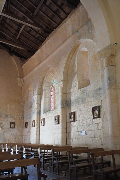L'église Saint-Sulpice, de style roman saintongeais, se situe à Saint-Sulpice-d'Arnoult (Charente-Maritime, Nouvelle-Aquitaine). L'édifice présente un plan cruciforme avec trois absides, dont deux seulement subsistent. La nef est un vaisseau unique bordé de chaque côté par trois arcades latérales en arc aigu, reposant sur des colonnes engagées aux chapiteaux sculptés du XIIe siècle. Deux baies d'origine romane ont été remplacées au XIVe siècle. Le clocher, élevé sur l'ancien transept, est porté par quatre arcades — une ogivale et trois en plein cintre — et voûté d'une coupole à pans. Les colonnes et leurs chapiteaux du clocher sont identiques à ceux de la nef. La cage des cloches, de plan octogonal, repose sur des piles de colonnettes jumelées, avec bases et chapiteaux sculptés, arcades géminées et corniches appuyées sur des colonnettes d'angle. À droite du chœur, des arcades ont été mutilées au XIIIe siècle pour créer une ouverture communiquant avec un bas-côté ; cette ouverture témoigne de l'adjonction qui a entraîné la suppression de l'absidiole sud, dont l'ouverture a été conservée. L'église Saint-Sulpice est classée au titre des monuments historiques depuis le 16 janvier 1924. La documentation disponible comprend notamment des notices et ressources en ligne (Commons, base Mérimée, Clochers de France, Observatoire du patrimoine religieux) ainsi que les listes des églises et des monuments de la Charente-Maritime.