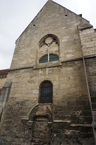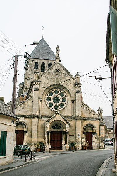 La rosace du chevet représente au centre Jésus remettant les clefs de l'Église à Pierre ; des médaillons périphériques montrent, dans l'ordre trigonométrique, Pierre puis Jacques le Mineur, Simon, André, Barthélémy, Jean, Philippe, Thomas, Jude, Jacques le Majeur, Mathias et Matthieu. Un autre vitrail relate la mort du jésuite Alexis Clerc, catéchiste à Vaux-sous-Laon, arrêté avec l'archevêque de Paris et fusillé le 24 mai 1871 à la prison de la Roquette.