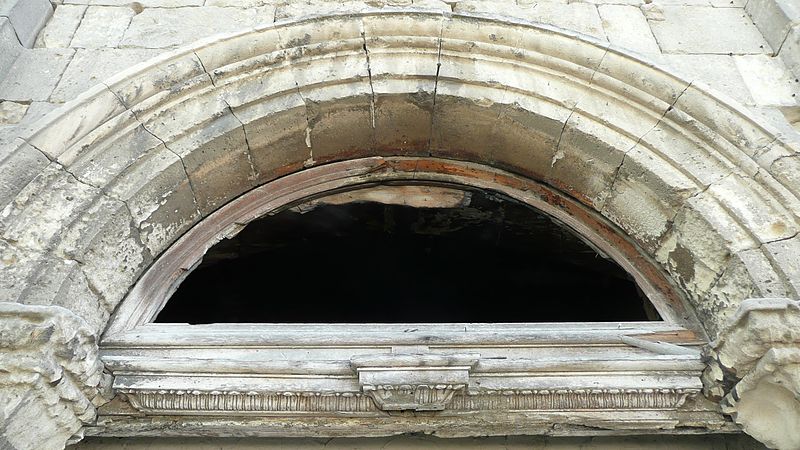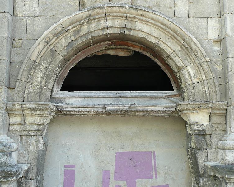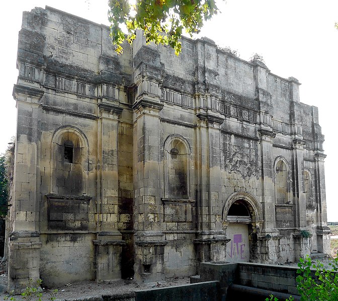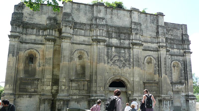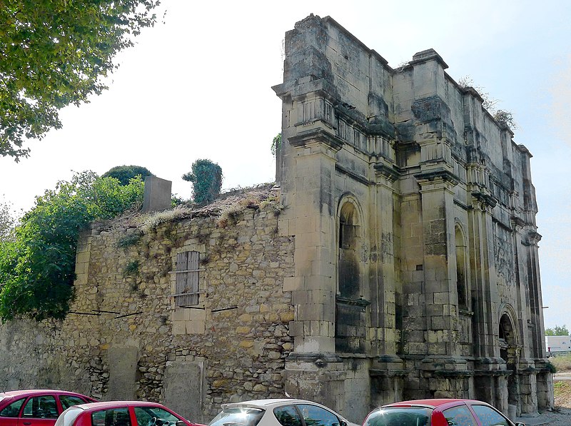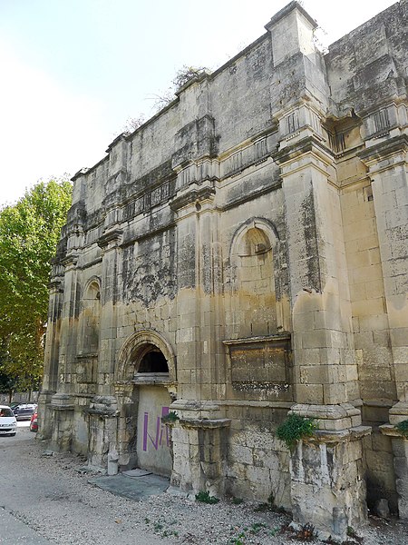 La façade monumentale, très dégradée, est de style classique : un avant‑corps central, de la largeur de la nef et divisé en trois travées, est encadré de deux ailes en retrait correspondant aux chapelles latérales ; des pilastres à ressauts partagent la composition en cinq compartiments. Le compartiment central est percé d'une porte en plein cintre dont le décor a été bûché pendant les déprédations révolutionnaires ; les autres compartiments abritent des niches aujourd'hui vides. Un entablement à frise dorique, mêlant métopes et triglyphes, couronne la façade ; au‑dessus, des pilastres plus courts soutenaient un couronnement disparu composé d'un fronton encadré d'ailerons, connu par un dessin de Pierre Véran vers 1800. La menuiserie originelle de l'imposte subsiste, tandis que les vantaux ont été perdus récemment. On relève enfin, sur le côté est de la façade, des graffitis anciens représentant des allèges, embarcations typiques de la navigation arlésienne.