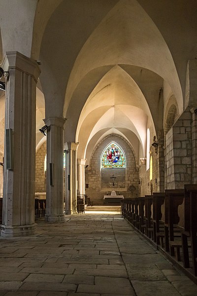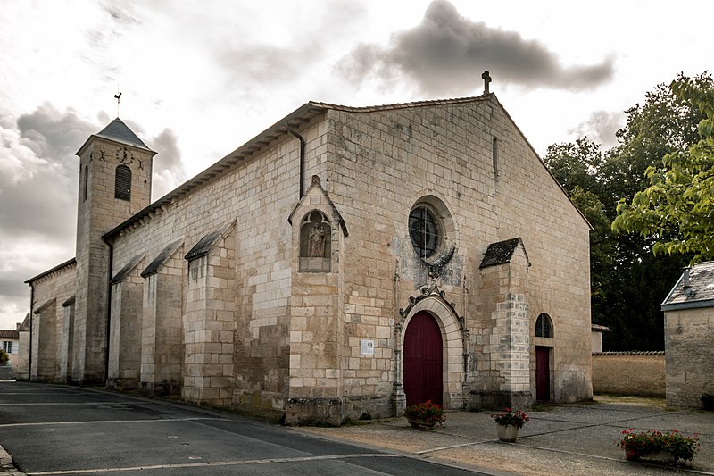 Église à deux nefs du XIIIe siècle, partiellement remontée au XVe siècle (façade) et au XIXe siècle (voûtes). Les voûtes primitives s'appuyaient sur des culs-de-lampe sculptés de personnages et de têtes encadrées de feuillage et de crochets.