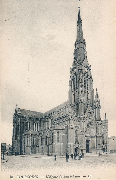 L'église du Sacré-Cœur, située à Tourcoing dans le département du Nord, dépend du diocèse de Lille et est réputée pour le son de ses cloches. Construite de 1875 à 1880 par l'architecte tourquennois Louis Croïn, cette vaste église néogothique en brique et pierre s'inspire du gothique primitif du début du XIIIe siècle et se trouve à l'entrée de la ville, boulevard Gambetta qui relie Tourcoing à Roubaix. L'édifice, premier bâtiment achevé sur le boulevard Gambetta, adopte un plan en croix latine lisible sur sa façade symétrique dominée par le clocher qui marque la nef ; deux corps annexes flanqués d'absidioles indiquent les collatéraux. Le corps central réunit le portail et le clocher, séparés des façades latérales par deux contreforts octogonaux ornés d'arcatures, percés d'étroites meurtrières et coiffés de pinacles. Le portail de pierre, en arc brisé à archivoltes multiples, présente un tympan formé d'une petite arcade nichée dans le renfoncement et une porte dont le linteau porte des moulures en corbeau ; au-dessus, un vaste pignon est surmonté d'un fleuron cruciforme et de crochets à feuilles. Une rose octolobée aveugle, entourée de trois disques trilobés, occupe le centre du pignon. Le clocher, qui semble émerger du portail, est percé sur toutes ses faces sauf celle orientée vers la nef de deux meurtrières nichées dans des arcades trilobées géminées ; de fines colonnettes engagées forment, en partie haute, deux lancettes ouvertes au niveau des cloches et équipées d'abat-sons. Une rose surmontant ces lancettes abrite une horloge et l'ensemble est couronné d'un arc brisé en larmier ; aux angles tronqués, des contreforts coiffés de pinacles renforcent l'impression d'élévation, tandis que des pignons ornés de crochets et de pinacles animent toutes les faces avant la flèche, elle-même ceinte d'arcades en tiers-point au tiers de sa hauteur. Les façades latérales proposent chacune une entrée en arc surbaissé surmontée d'un trilobe, d'un pignon et de deux pinacles, ainsi qu'une large baie en lancette protégée par un larmier ; le sommet des façades est rythmé par une arcature se prolongeant sur les secondes façades. Celles-ci comportent une abside pentagonale dont chaque face, séparée par un contrefort, est percée d'une lancette ; les angles des corps annexes, à l'image du clocher, sont pourvus de contreforts surmontés de pinacles. Les sculptures ont été achevées uniquement sur la façade principale et le clocher ; sur le reste de l'édifice, les blocs de pierre sont restés simplement équarris. Les vitraux d'origine ont été soufflés en 1918 lors de l'explosion du pont hydraulique voisin provoquée par le départ des troupes allemandes ; ils ont été refaits durant l'entre-deux-guerres et le vitrail de Notre-Dame de la Treille a bénéficié d'une restauration en 2012. L'orgue a été réalisé en 1901 et l'intérieur a conservé sa décoration d'origine ; la chaire est remarquable par la représentation des sept vertus cardinales. L'église a été inscrite au titre des monuments historiques par arrêté du 5 avril 2019, inscription motivée davantage par la qualité des vitraux que par l'édifice lui-même. Elle est également connue pour la qualité de ses concerts, notamment ceux donnés par l'atelier choral du conservatoire de Tourcoing. Des ressources en ligne (Clochers de France, Mérimée), une association locale Les Amis du Sacré-Cœur et des archives photographiques documentent l'histoire et l'architecture de l'édifice.