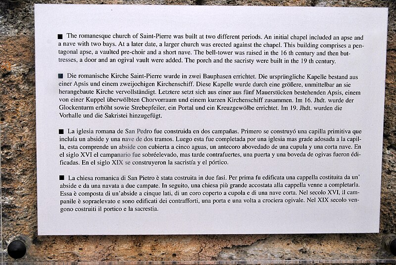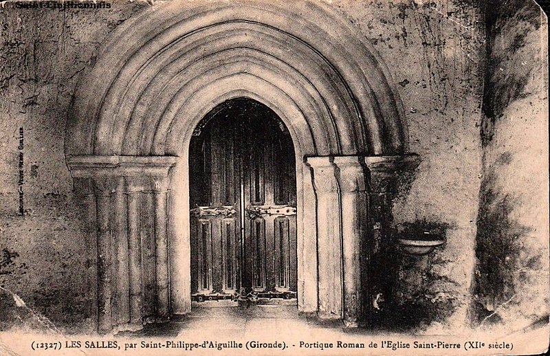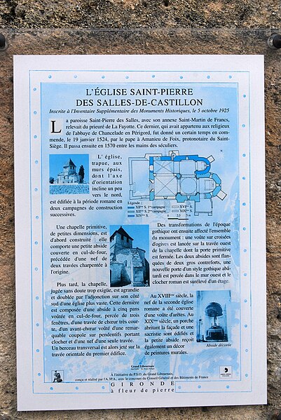 L'église Saint-Pierre, petite église romane des Salles-de-Castillon (Gironde), est composée de deux nefs d'époques différentes. La nef la plus large, au sud, se termine par une abside à pans coupés précédée d'un avant-chœur voûté d'une coupole sur pendentifs qui porte le clocher. L'édifice comporte par ailleurs une chapelle primitive dotée d'une petite abside en cul-de-four et d'une nef de deux travées, doublée ultérieurement par l'adjonction, sur le côté sud, d'une église plus vaste avec abside à cinq pans voûtée en cul-de-four, une travée de chœur courte et une nef d'une seule travée. La paroisse Saint-Pierre, qui était rattachée au prieuré de La Fayotte dépendant de l'abbaye Notre-Dame de Chancelade, fut donnée en commende le 19 janvier 1524 par le pape à Amanieu de Foix, protonotaire du Saint-Siège, puis passa en 1570 entre les mains des séculiers. Des transformations datant du XIVe siècle ont introduit une voûte en croisées d'ogives, fermé la porte primitive de la chapelle, ajouté des contreforts aux deux absides, percé dans le mur ouest une nouvelle porte de style gothique abâtardi et surélevé le clocher roman d'un étage. Au XVIIIe siècle, la nef de la seconde église romane fut couverte d'une voûte d'arêtes et la petite abside reçut un décor de peintures murales. L'édifice est inscrit au titre des monuments historiques par arrêté du 5 octobre 1925. L'église se situe au village des Salles-de-Castillon, sur la route départementale D21E4, entre l'intersection avec les routes D119 et D21. Parmi les éléments remarquables figurent la porte gothique abâtardie, la nef et les peintures murales de la petite abside.