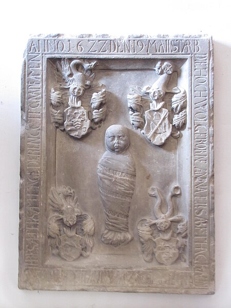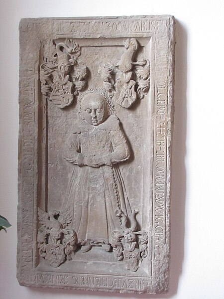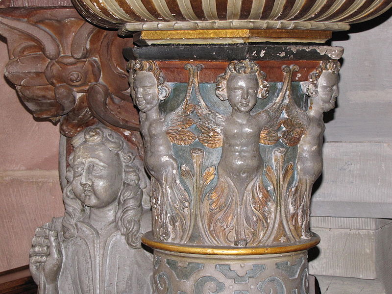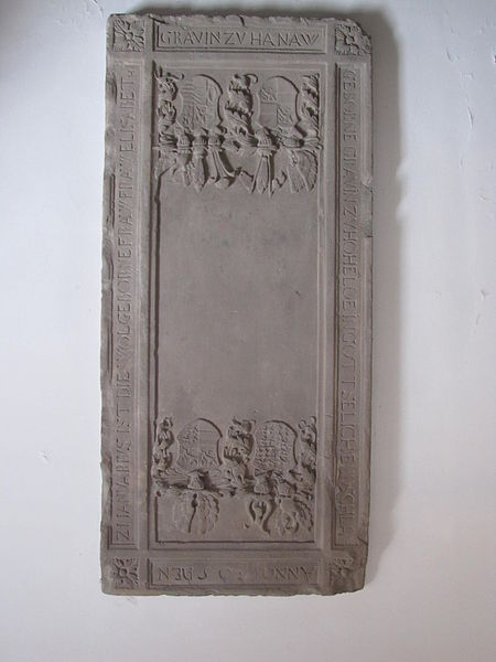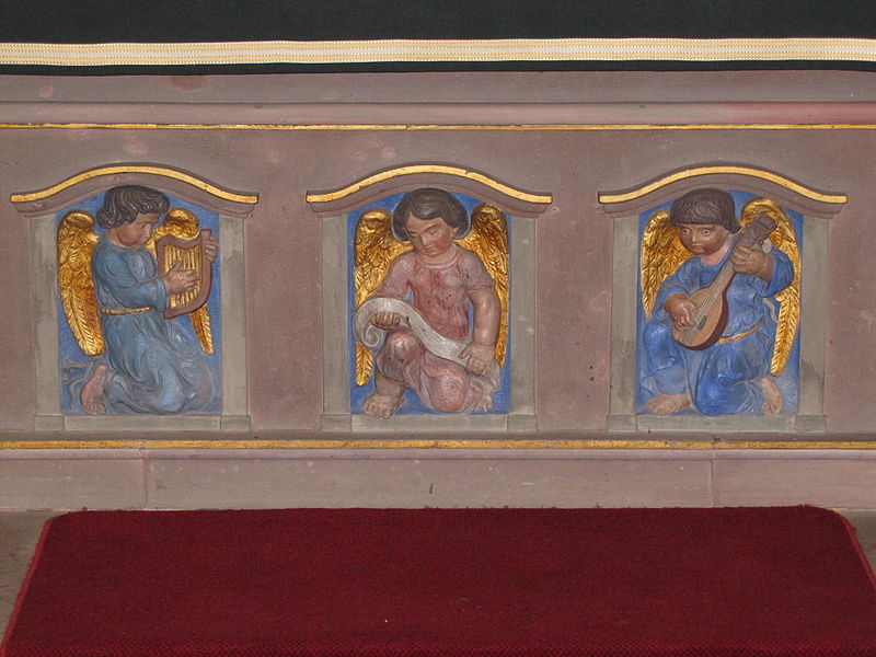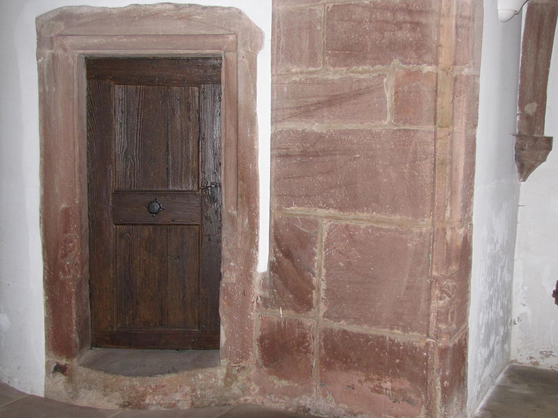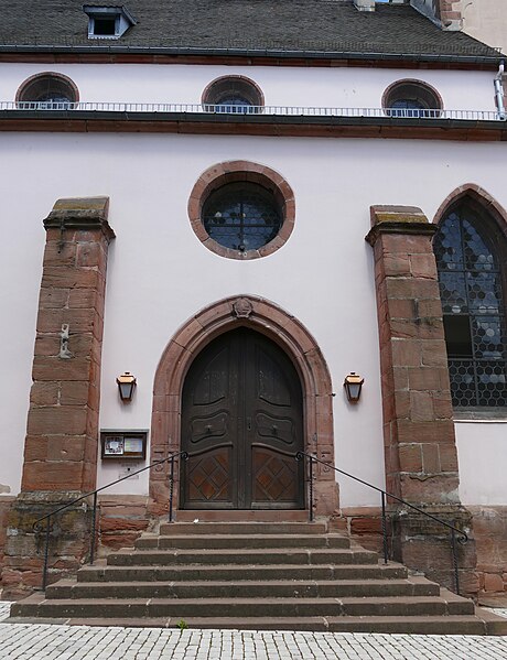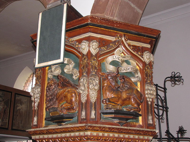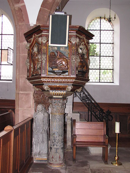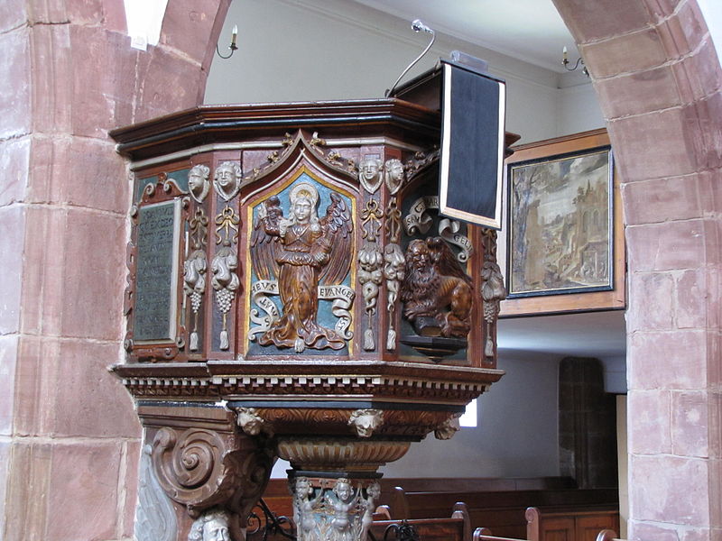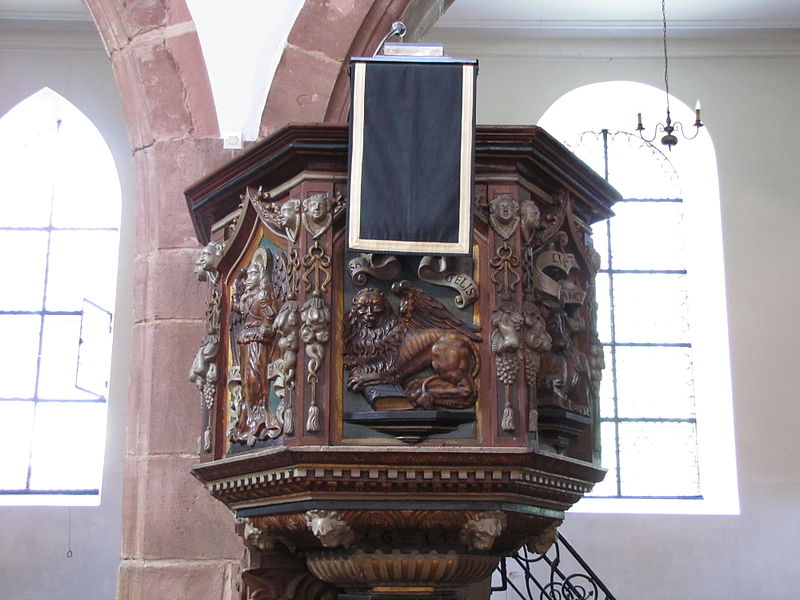La chaire polychrome en grès associe remplois datés de 1579 et une cuve de 1614; sa balustrade comporte cinq panneaux, quatre représentant les symboles des évangélistes et un cinquième portant des citations bibliques en latin, tandis que les pilastres sculptés mêlent guirlandes, fruits et têtes expressives. La loge seigneuriale, réservée à la famille comtale et à la noblesse locale, a pris son aspect actuel lors de l'installation de l'orgue et conserve de beaux décors en stuc de 1778. L'ancien chœur gothique, situé à l'est derrière la loge seigneuriale, n'a aujourd'hui d'autre fonction que de donner accès à la tourelle d'escalier du clocher.