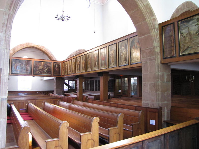 L'importance de la prédication a fait évoluer le plan vers une organisation plus rectangulaire et la tribune, qui ceint l'ensemble, a originellement comporté deux niveaux; ses panneaux ont été peints et restaurés par Henri Ebel entre 1912 et 1914. Les peintures représentent, au sud, plusieurs scènes bibliques telles que la fuite de Jacob, Jonas rejeté par la baleine, le riche et Lazare, le pharisien et le collecteur d'impôts, la décollation de saint Jean-Baptiste et la conversion de Paul; à l'ouest figurent le Christ, les douze apôtres et le Jugement dernier; à l'est sont représentés Jean-Baptiste, Jonas à Ninive et la Nativité.