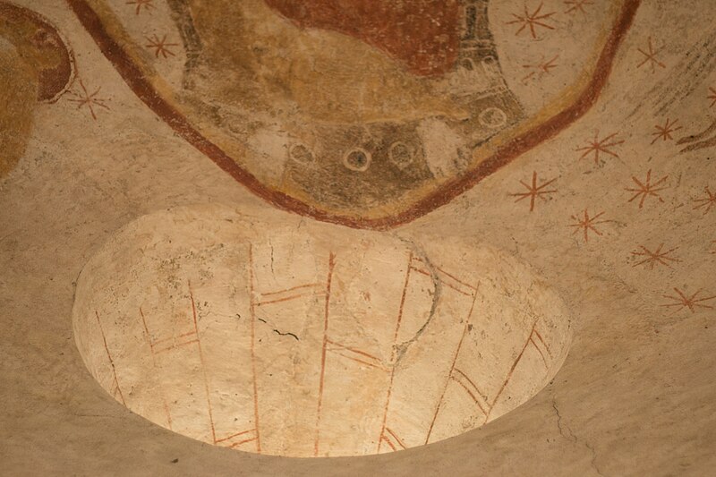 Le chevet est ceint d'une arcature aveugle à pilastres, divisée en cinq travées par des contreforts, et le décor sculpté reste sobre : corbeilles grossièrement sculptées, attribuées par l'historien Jacques Mallet au second tiers du XIIe siècle, et modillons géométriques. La voûte en cul‑de‑four de l'abside porte un Christ en Majesté, que certaines brochures datent du XVe siècle tandis que certains traits renvoient à des caractéristiques plus anciennes, peut‑être du XIIIe siècle. Le Christ y figure trônant dans une mandorle, bénissant de la main droite et tenant un livre de la main gauche, entouré du Tétramorphe — l'homme de Matthieu et le lion de Marc à gauche, l'aigle de Jean (presque effacé) et le taureau de Luc à droite — le tout ponctué d'étoiles rouges. L'intérieur de l'oculus présente un décor en faux appareil destiné à magnifier la lumière et à renforcer le rôle symbolique de la baie, dont la lumière éclaire le Christ ; les restes très dégradés d'une seconde scène sont encore visibles sur la voûte en berceau, mais son iconographie reste inconnue.